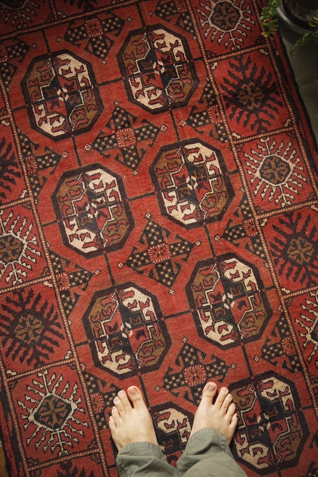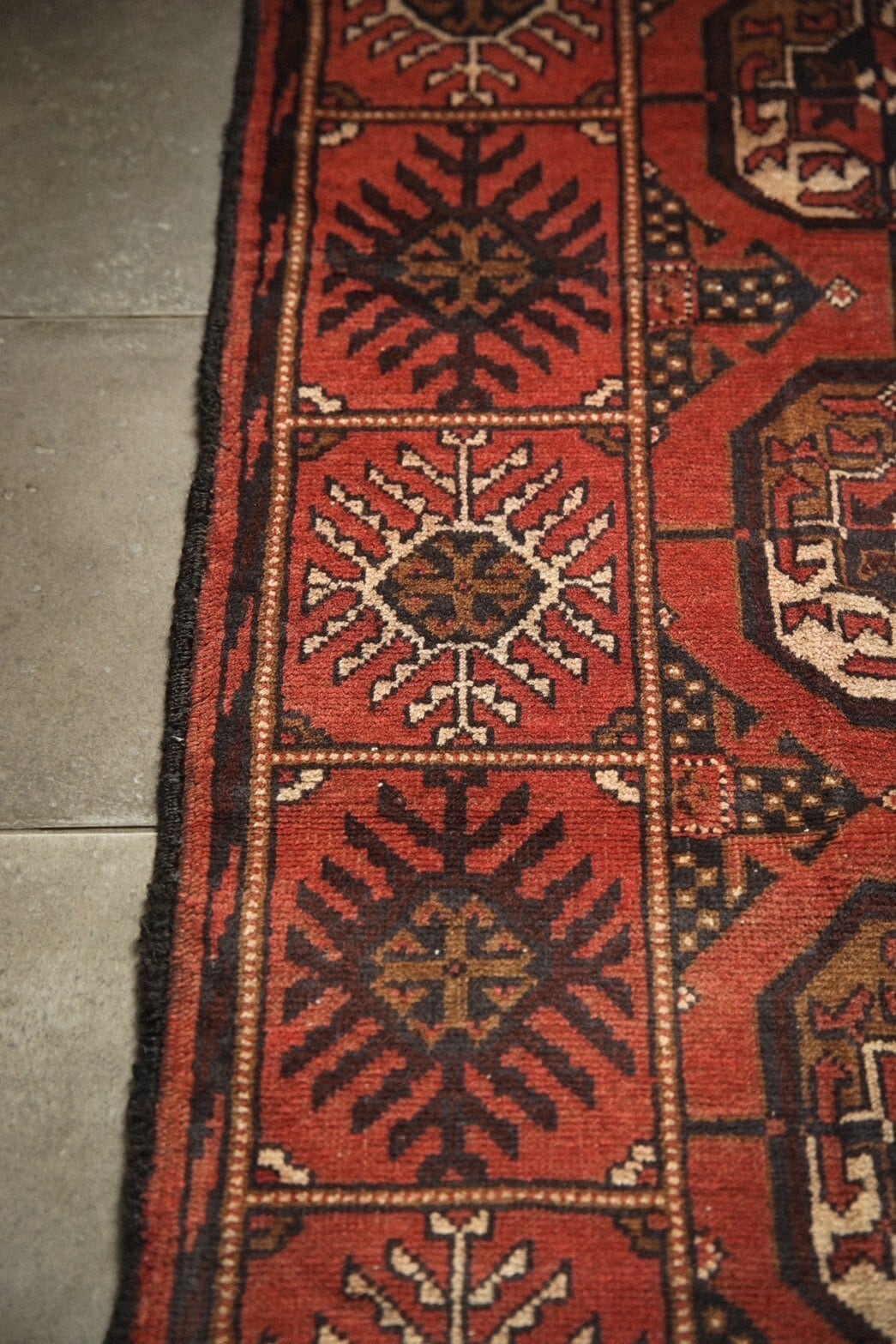 1990年代に織られたアフガニスタン産のバルーチラグ。赤いフィールドにテッケギュルに似たデザインが描かれています。