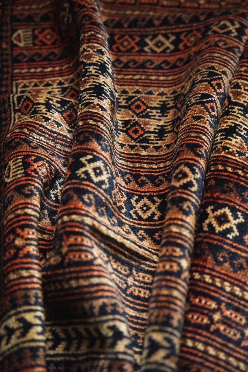 オレンジ、ベージュ、テラコッタ、ネイビー、ブラウンなどの暖色系の落ち着いた色味で描かれた細かい連続紋様がとても美しい一枚。