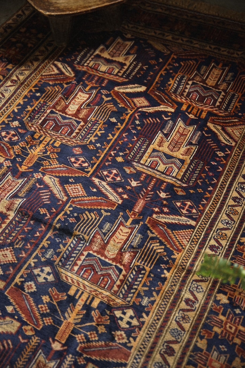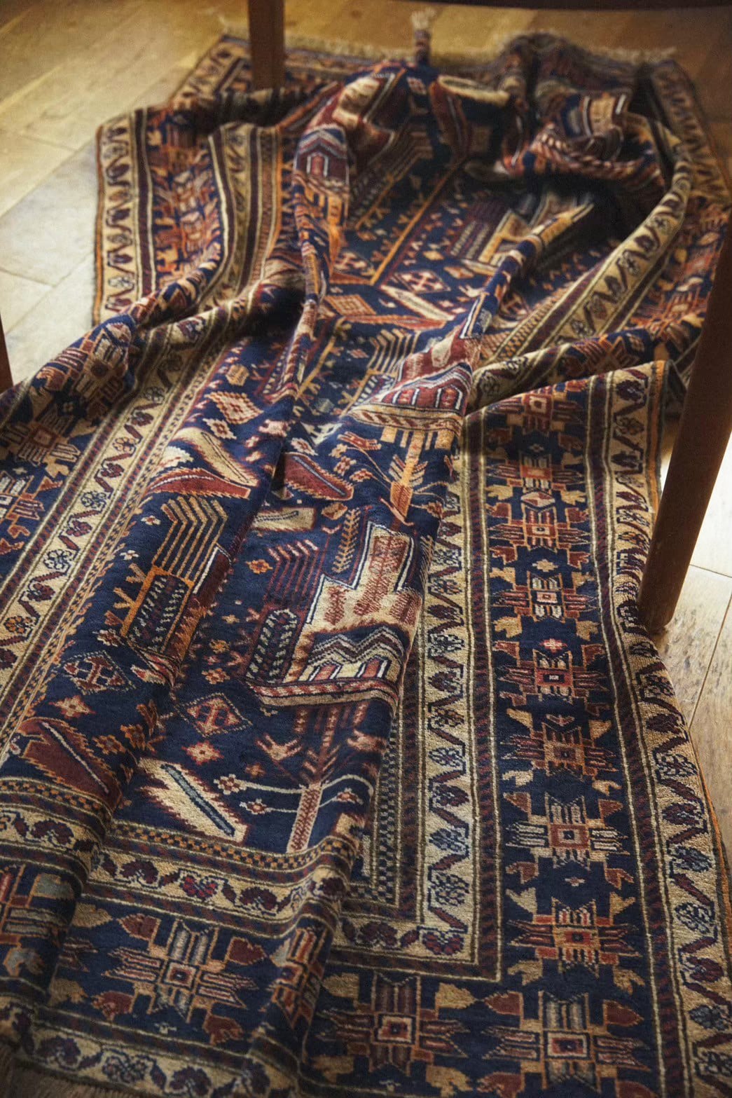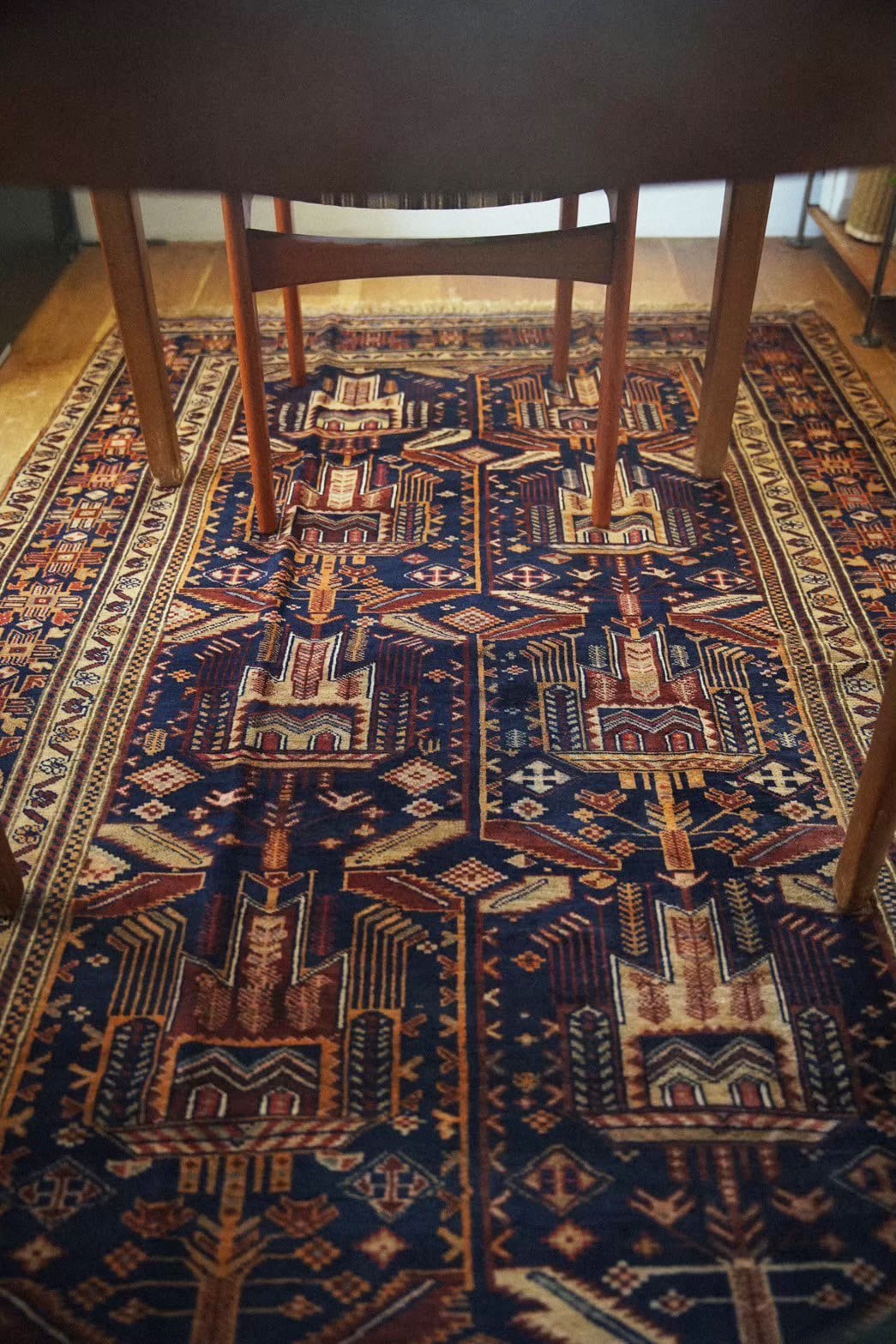 ブルー系のラグをお探しの方、トライブ感のあるモチーフが好きな方、また男性のお部屋にもおすすめの一枚です。