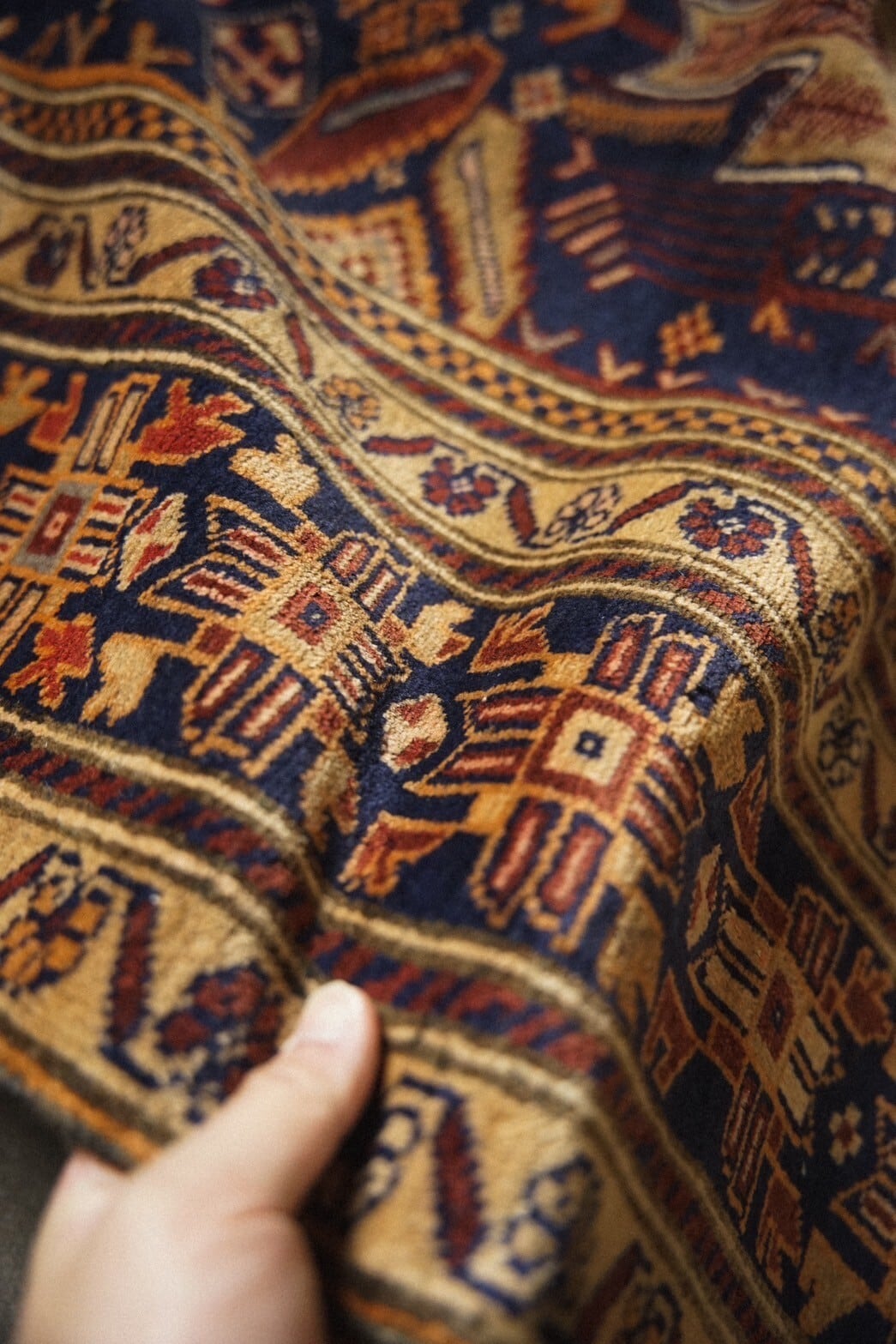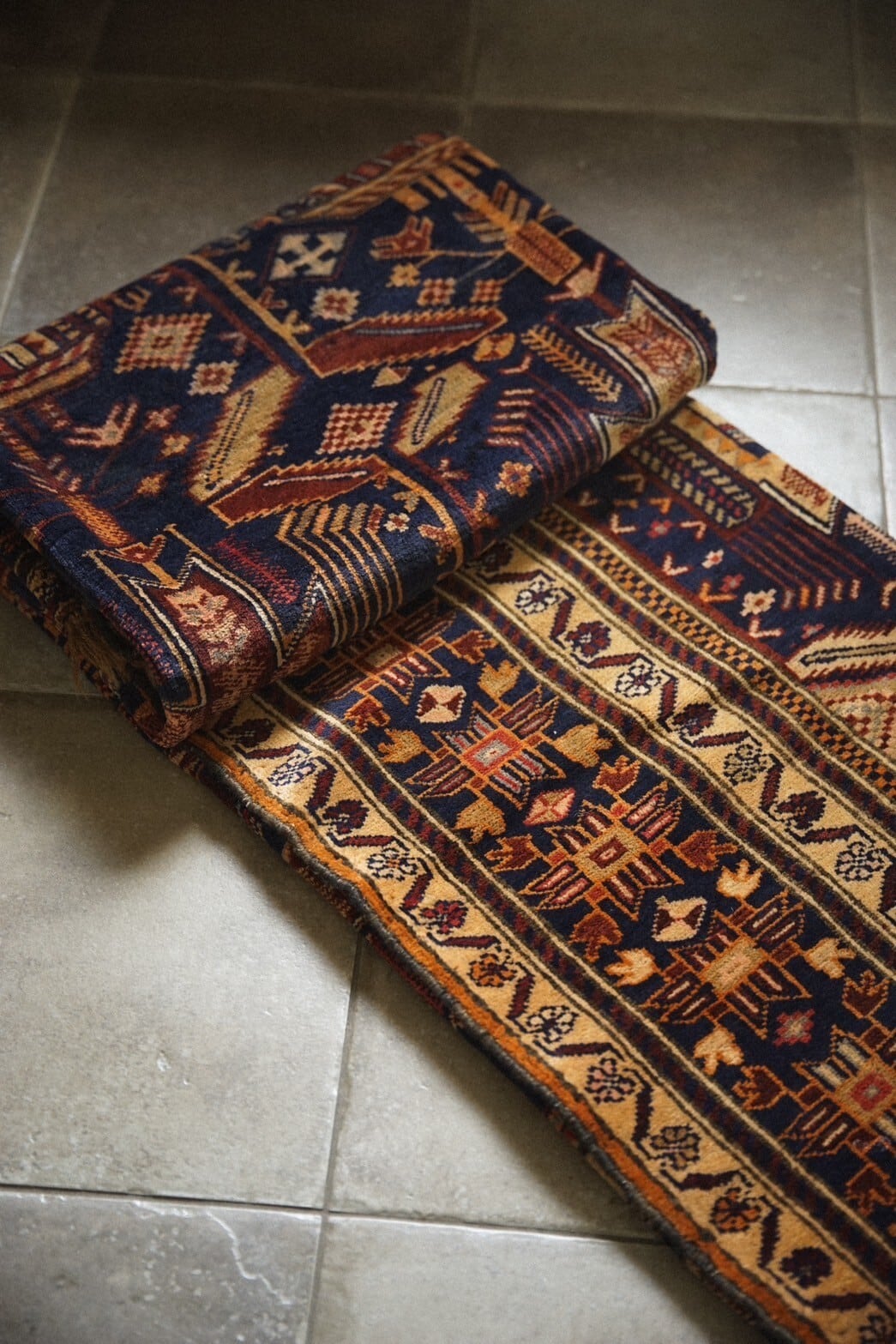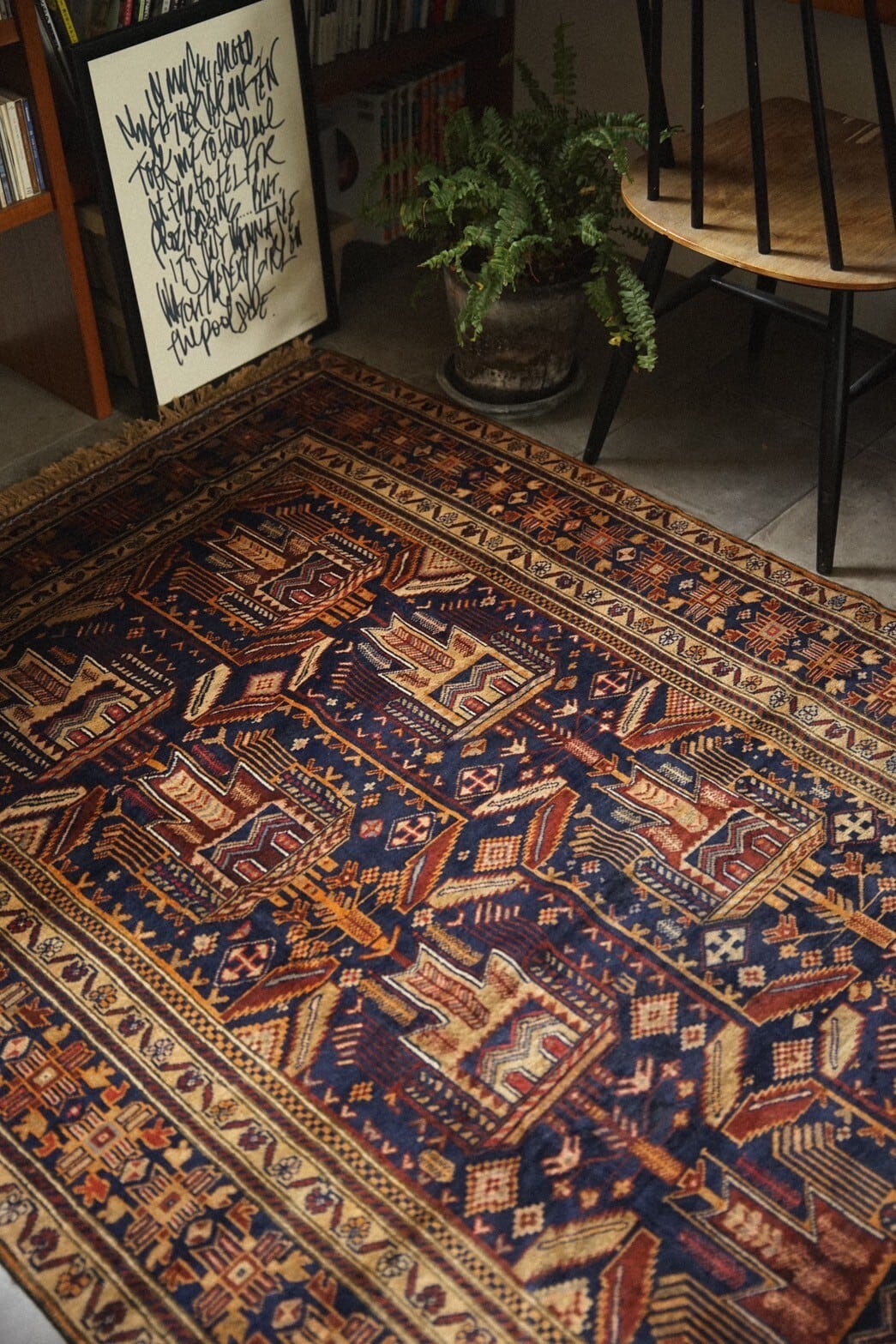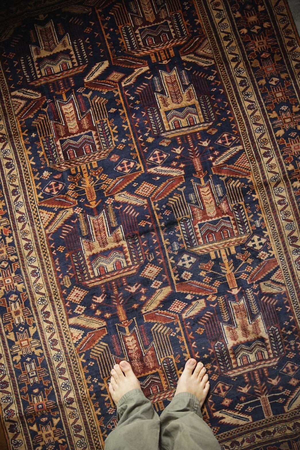 ブルー系のラグをお探しの方、トライブ感のあるモチーフが好きな方、また男性のお部屋にもおすすめの一枚です。