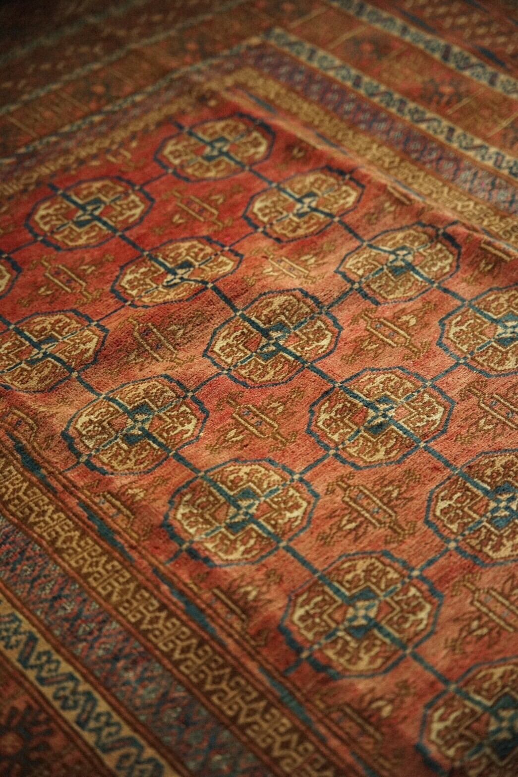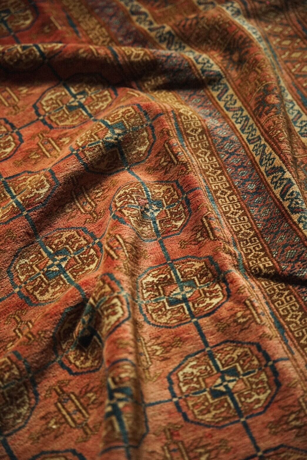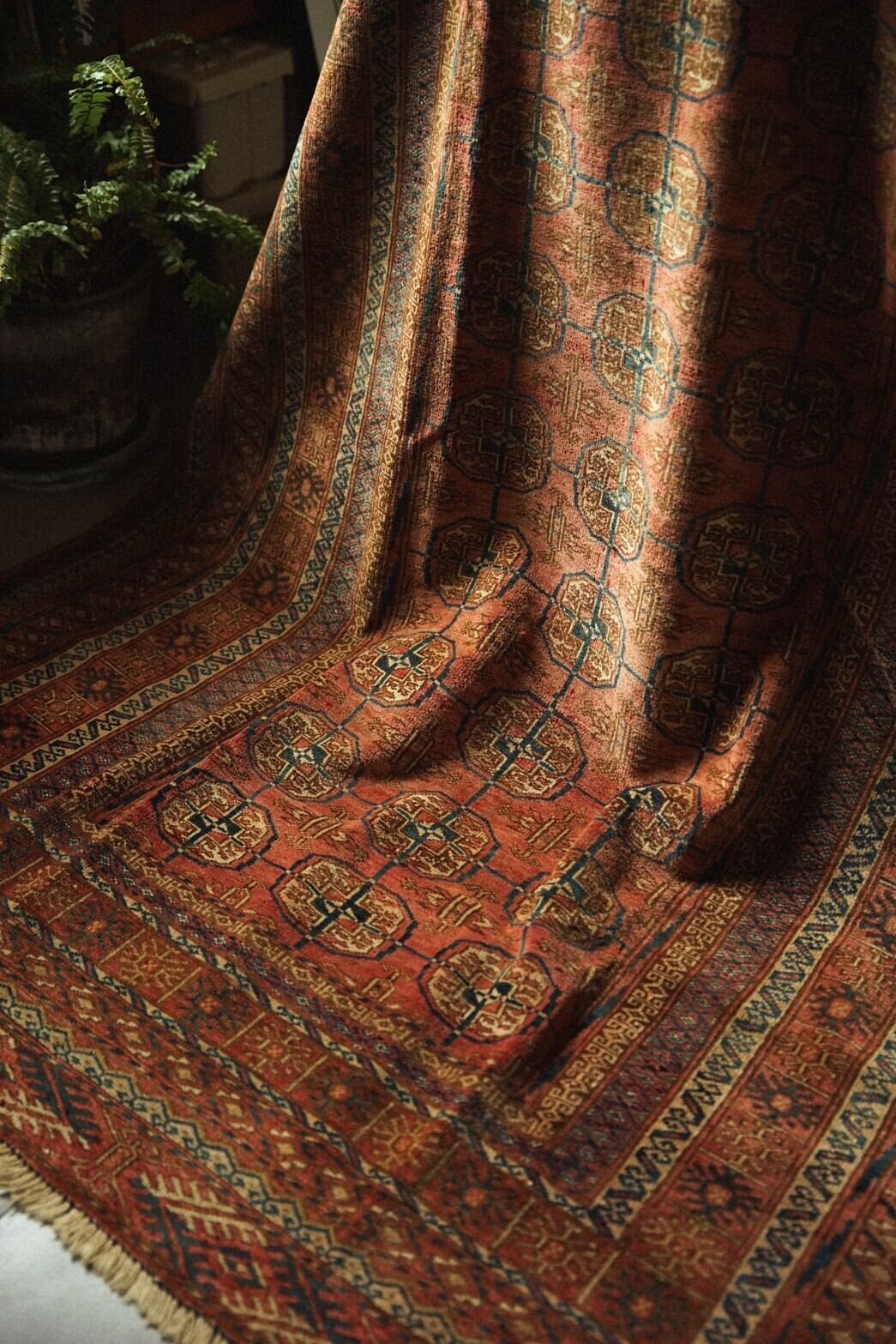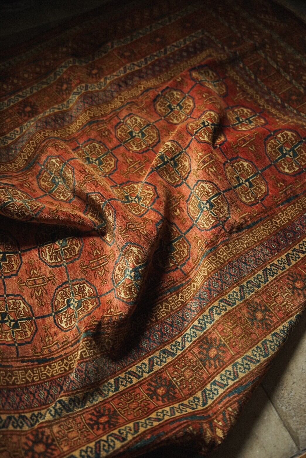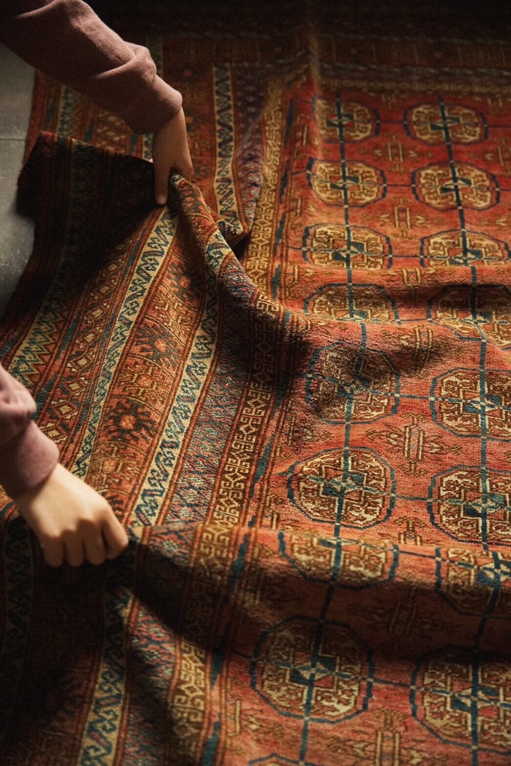 経年により艶を増したパイルは美しく輝き、トルクメン特有の密度の詰まった織りはずっと撫でていたくなるような滑らかな手触りです。