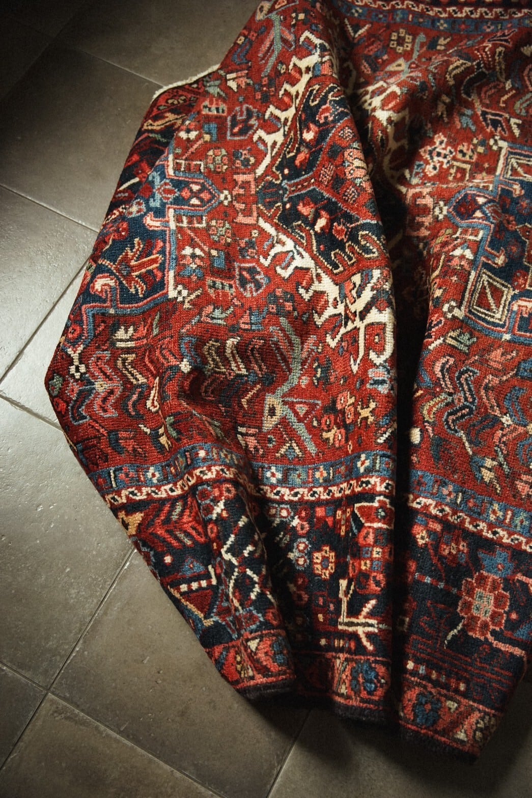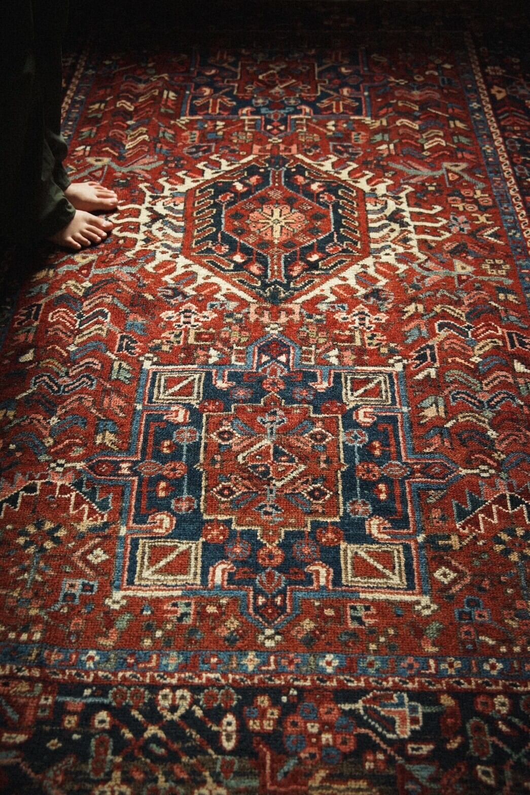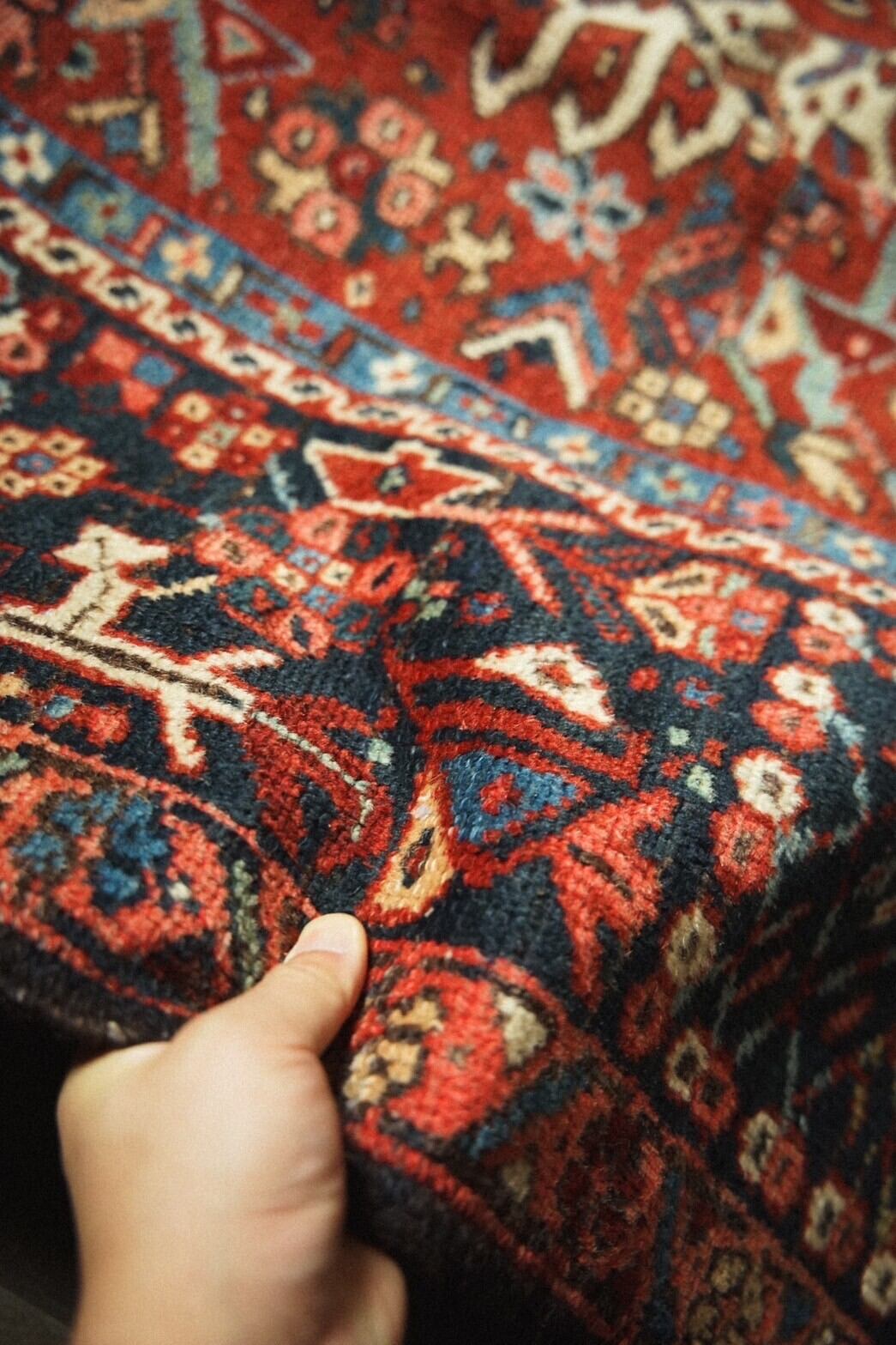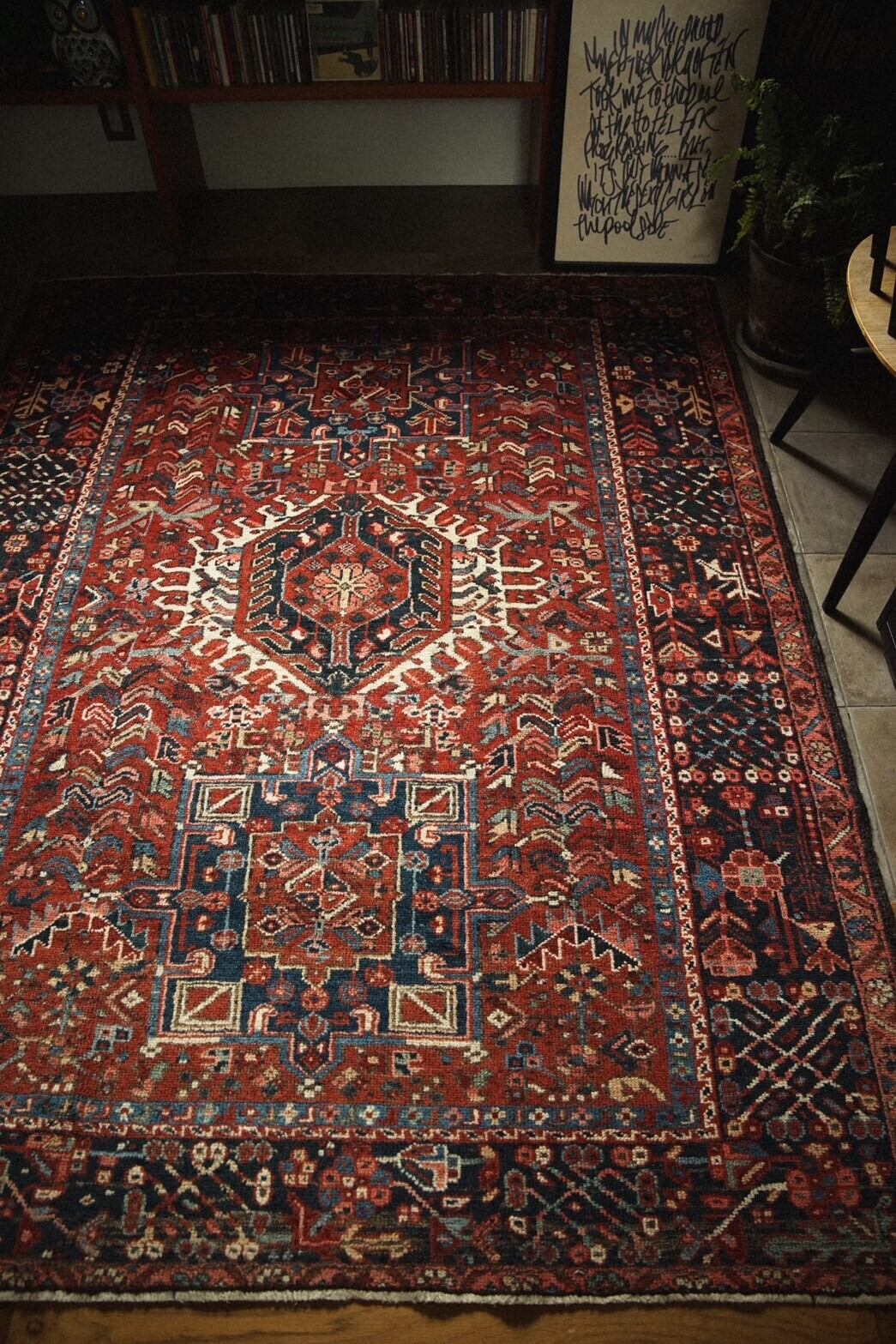 イラン北西部のタブリーズの近くの村カラジャで織られたラグ。落ち着いた深みのある茜色のフィールドには細かくて彩り豊かなモチーフが沢山織り込まれています。