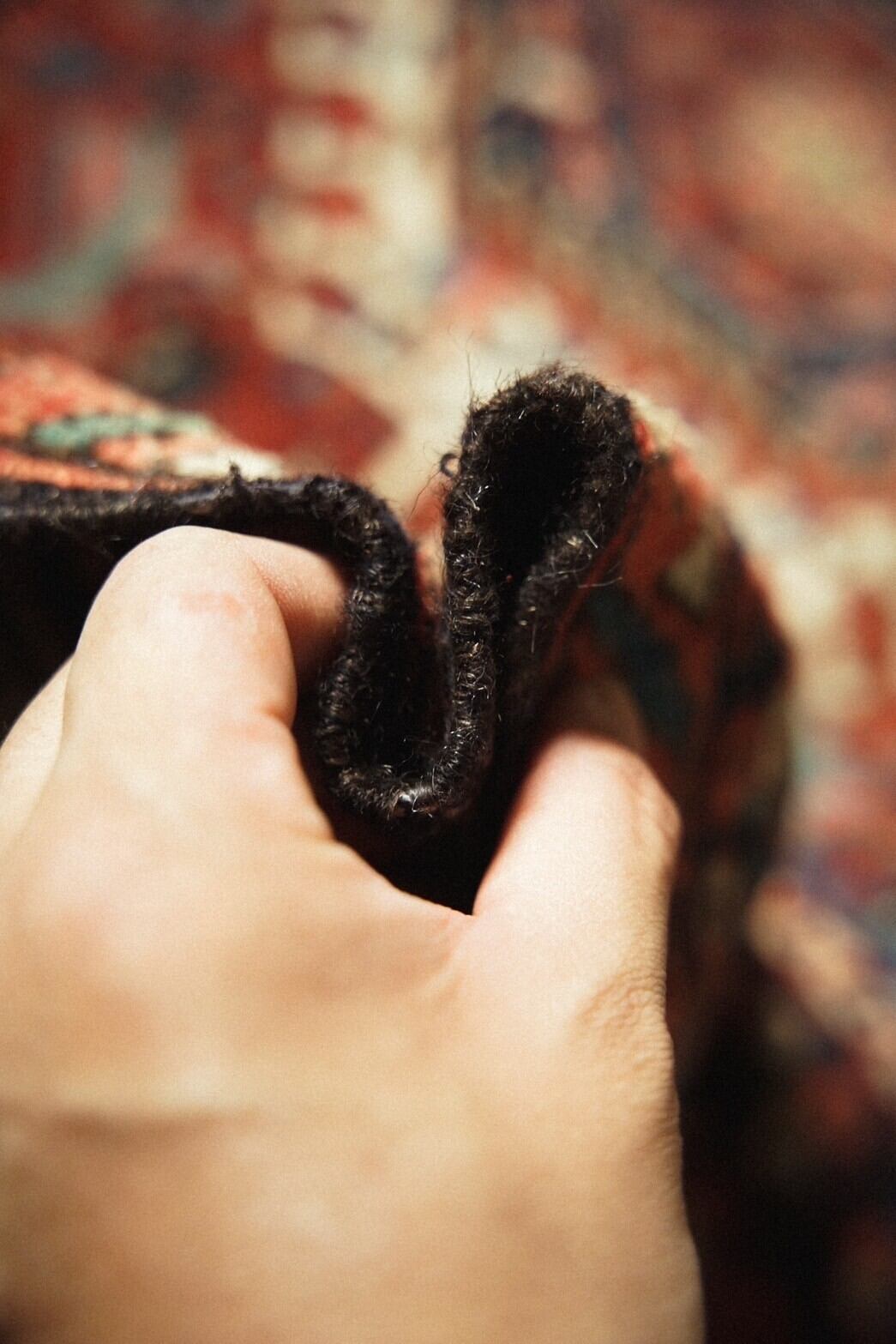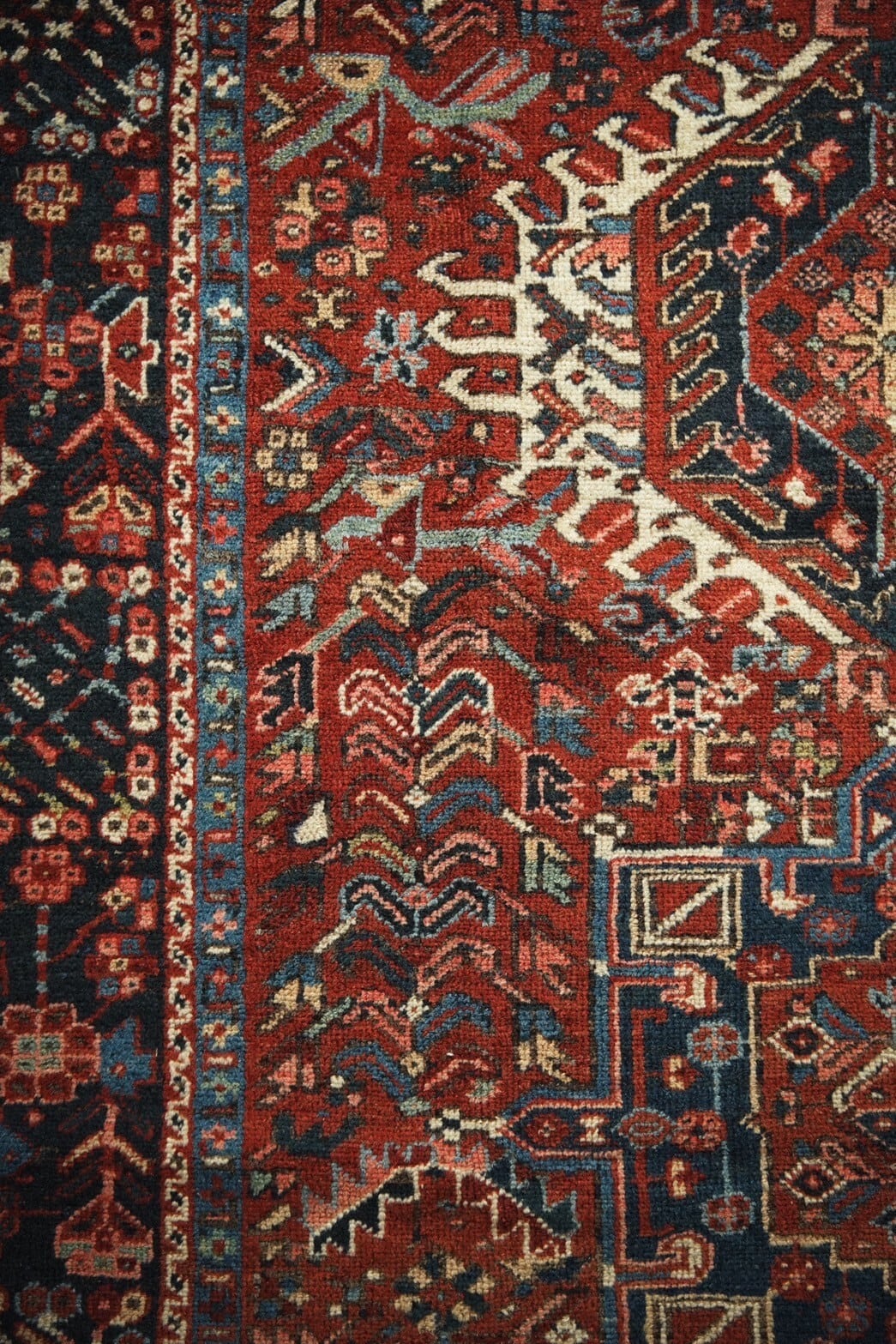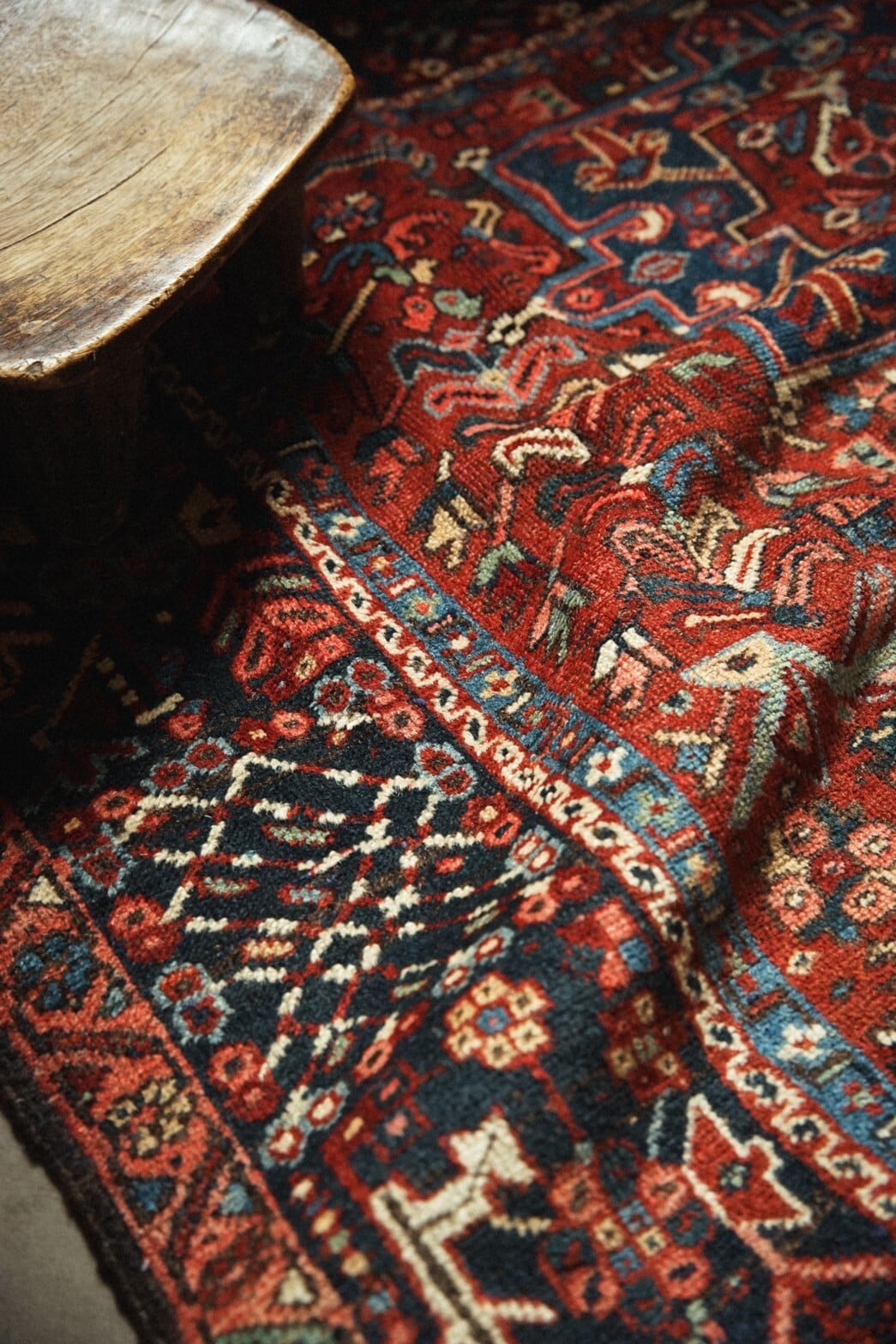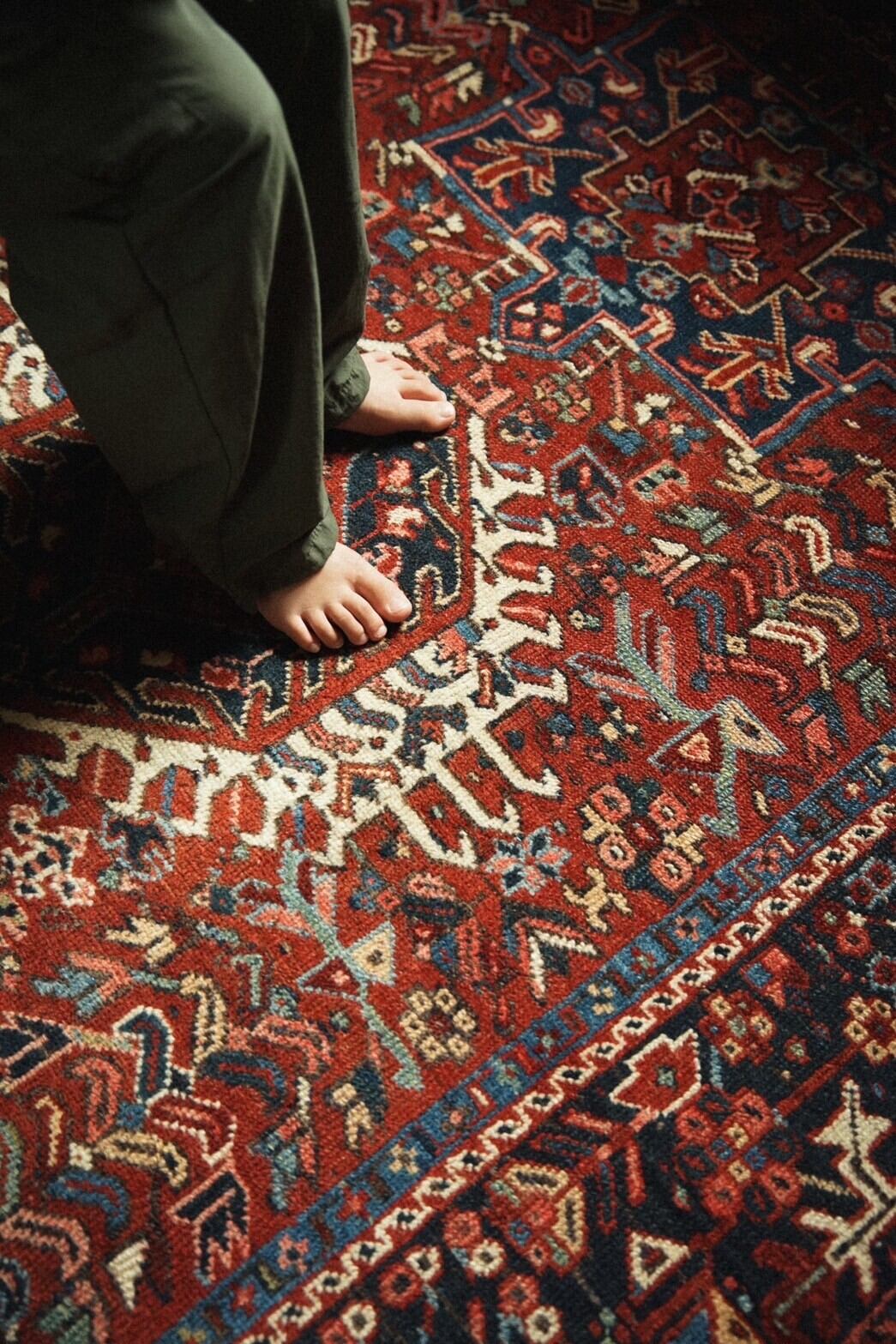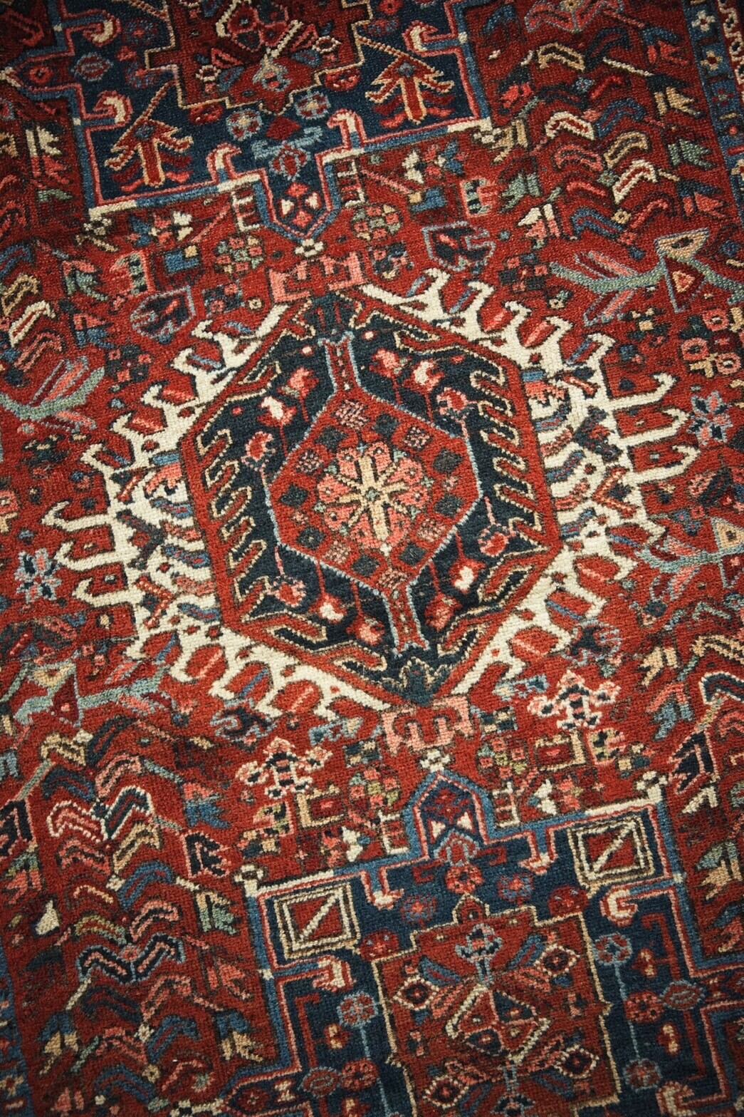 イラン北西部のタブリーズの近くの村カラジャで織られたラグ。落ち着いた深みのある茜色のフィールドには細かくて彩り豊かなモチーフが沢山織り込まれています。