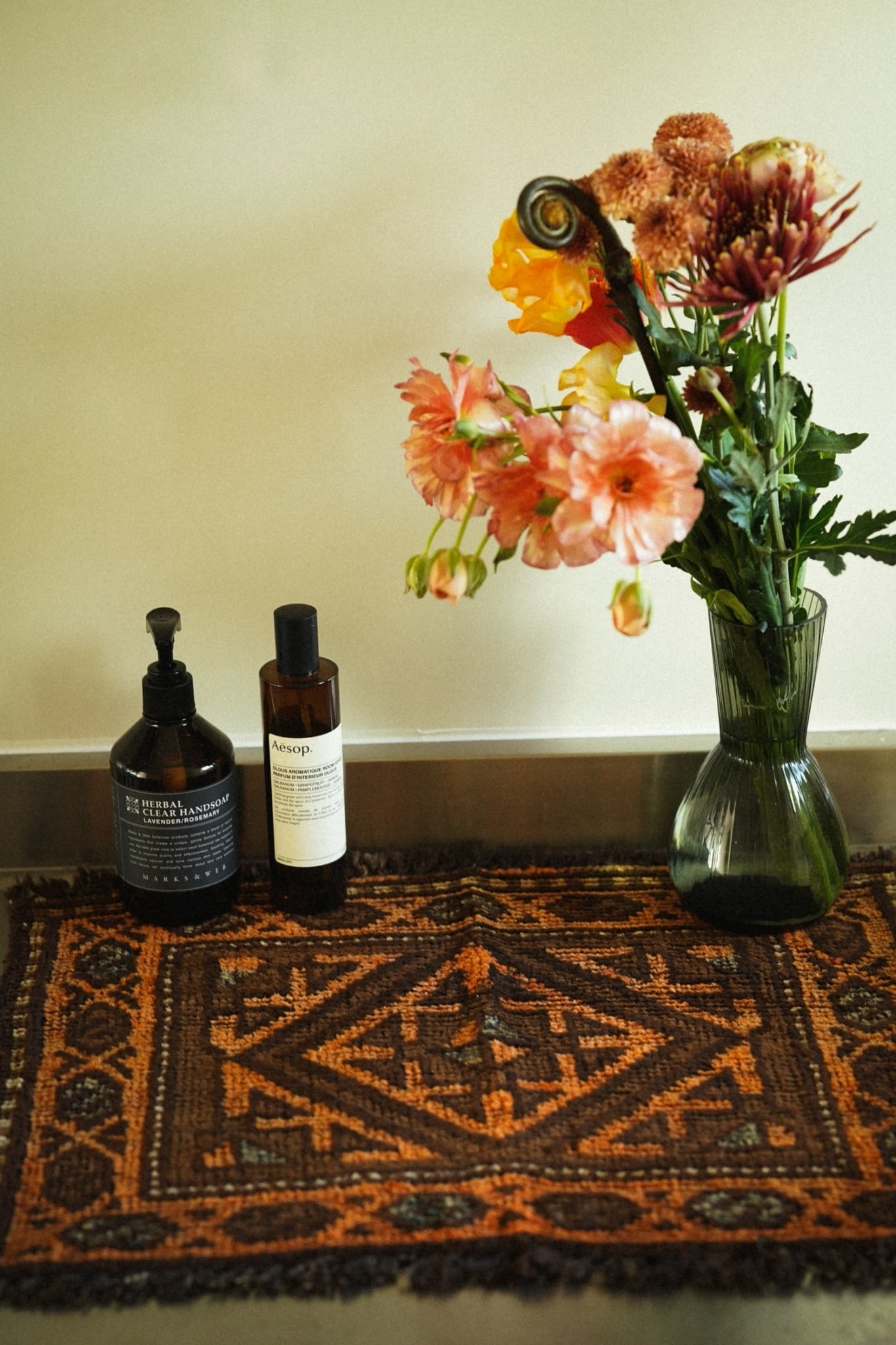 シンプルで落ち着いたカラーリングのラグはインテリアにも合わせやすいかと思います。