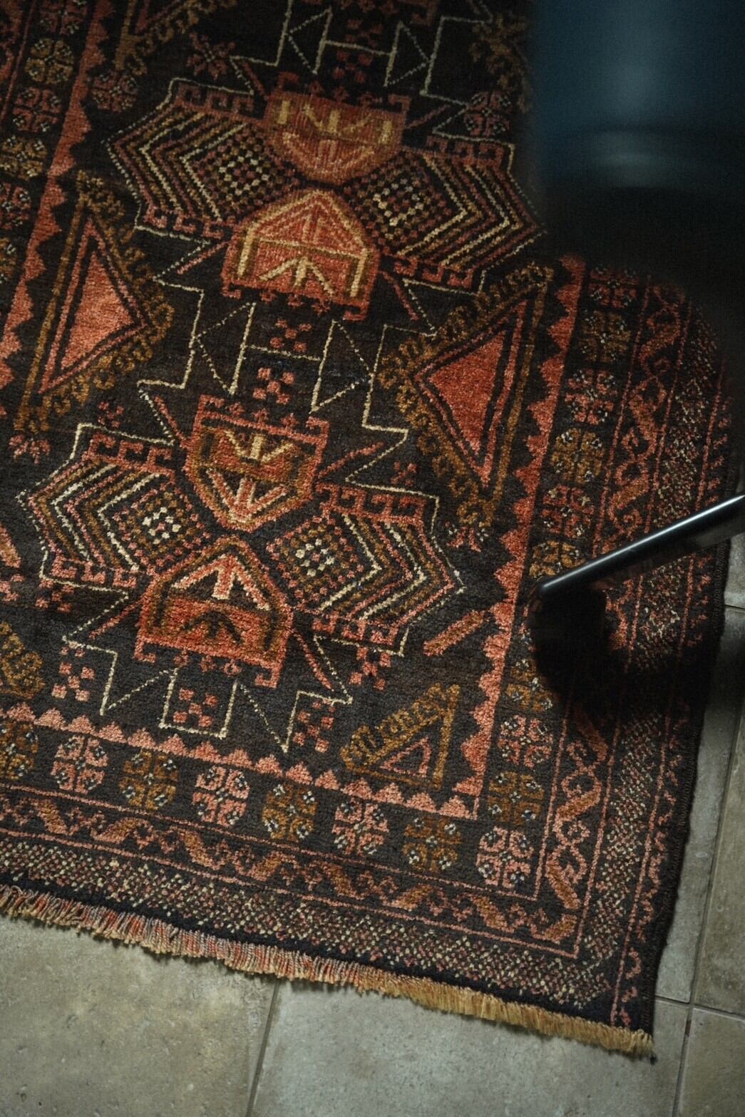 力強い印象のジオメトリックデザインのメダリオンと朱赤やテラコッタ、カーキ、ブラウンの柔らかい色味にブラックが効いていてとてもお洒落な一枚。