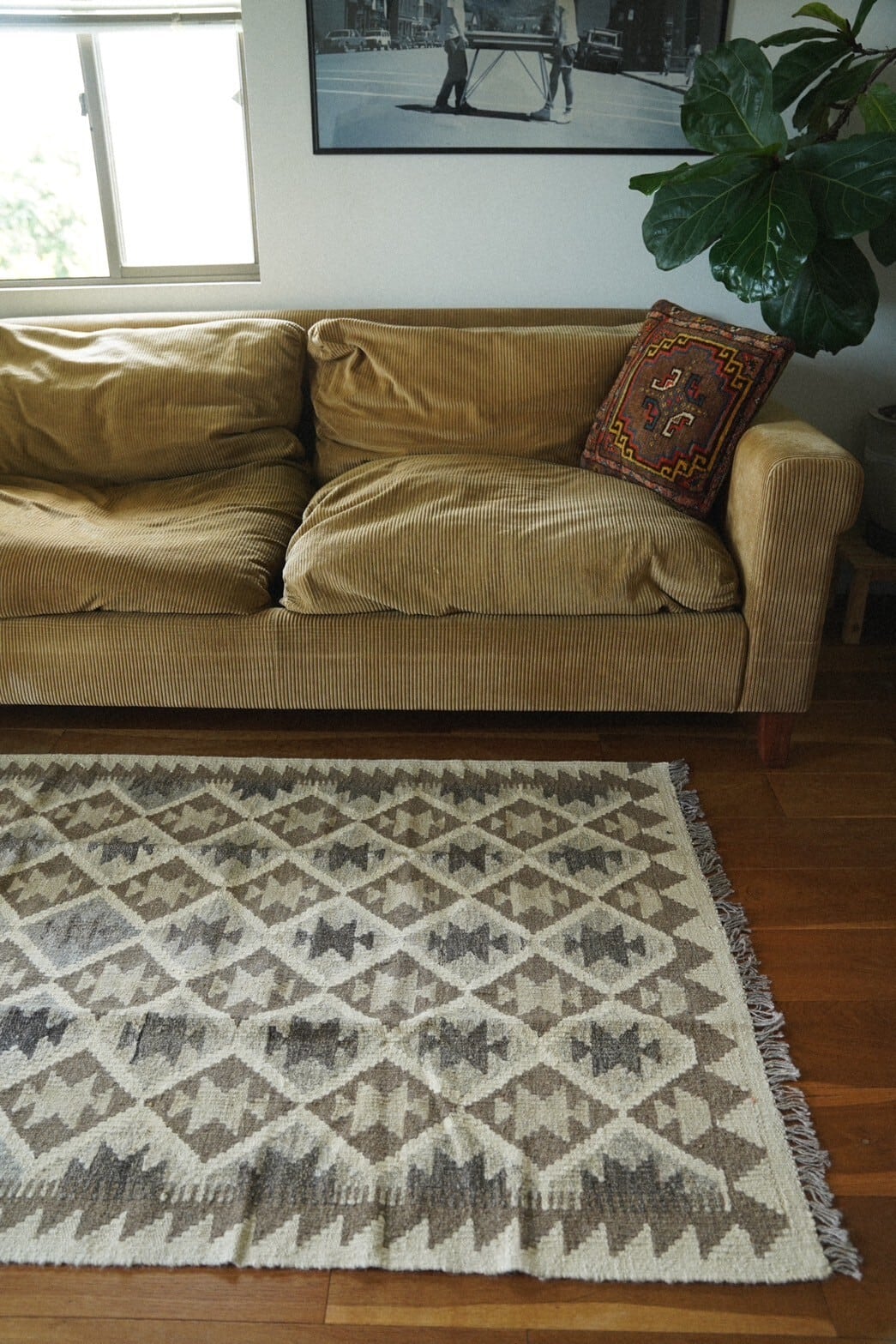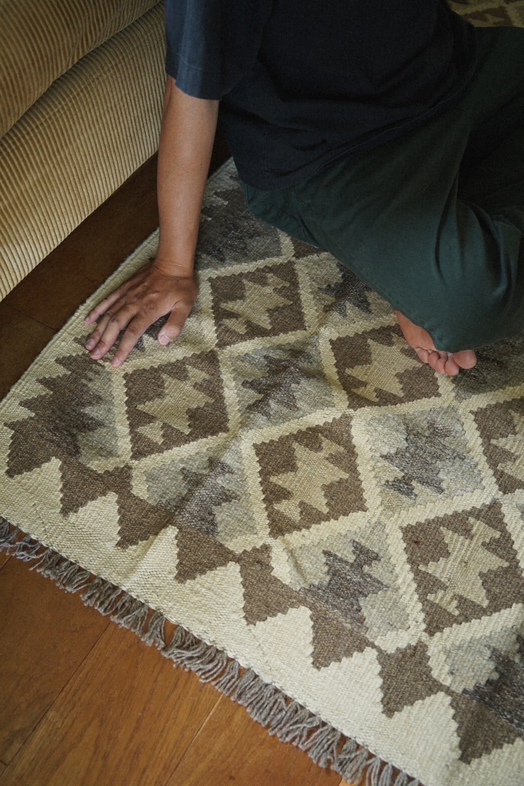 キリムですがしっかりとした丈夫な織りで、程よい厚みがあるので敷いて使うのも問題ございません。