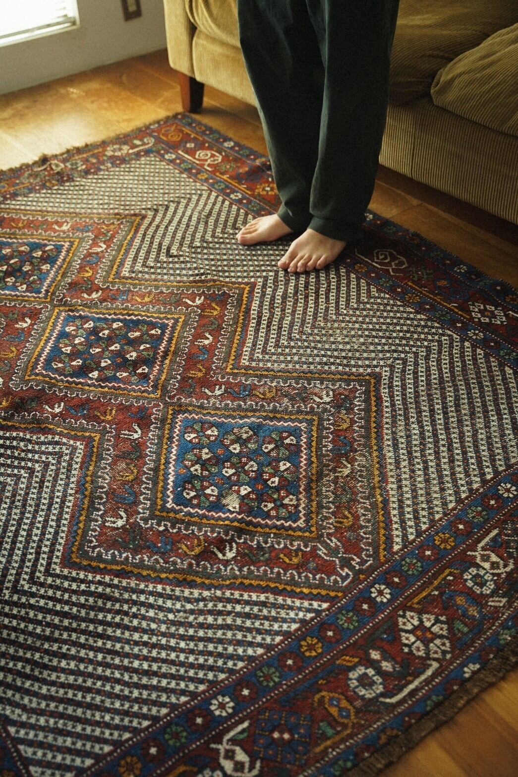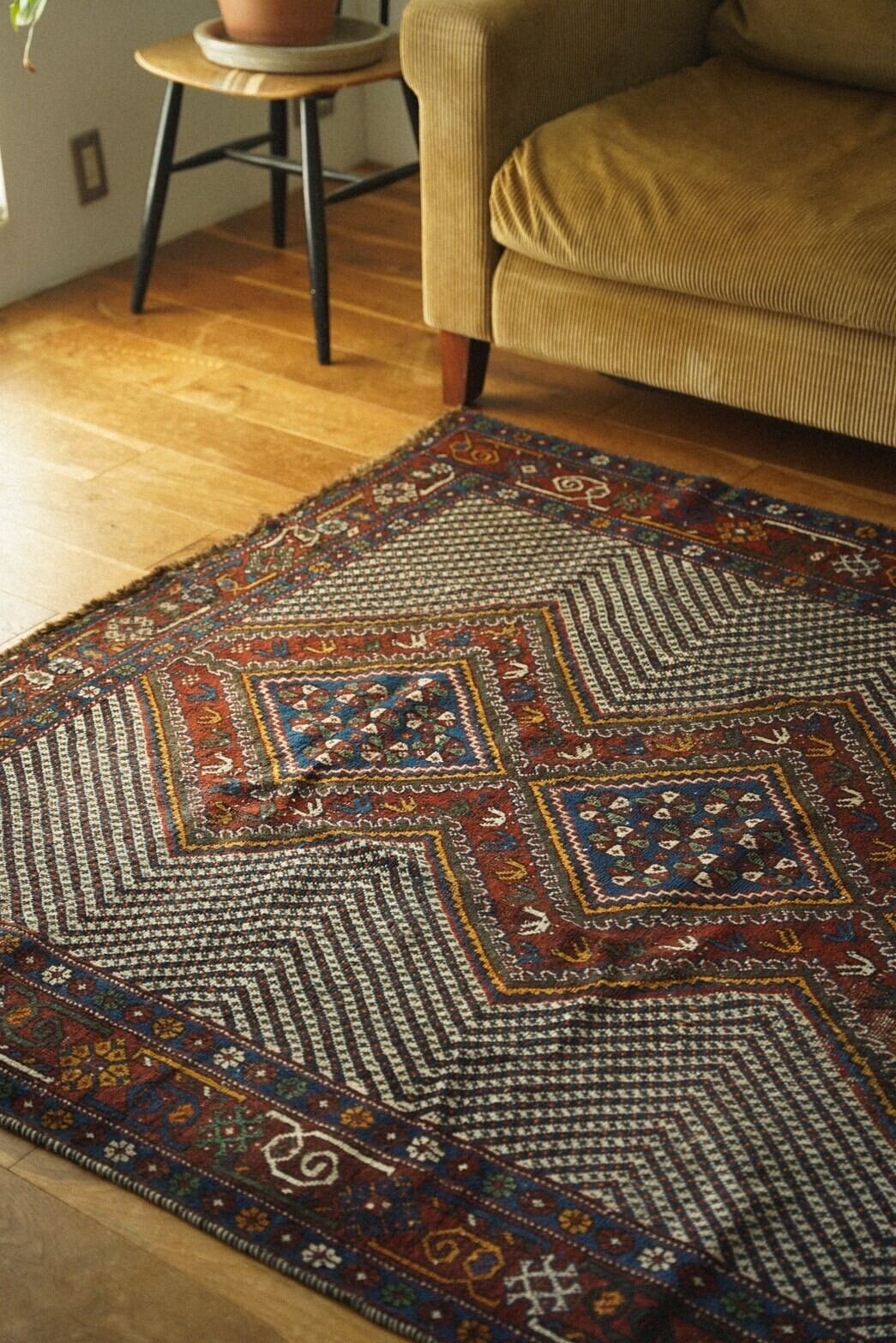 ボーダー部分にはフローラルモチーフ。120年上前のアンティークラグのため経年による擦れはありますが、それも新しいラグにはない味わいや魅力だと思います。