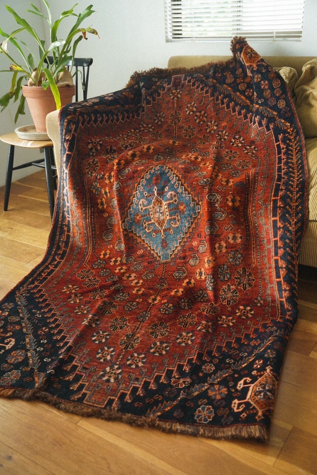 印象的な水色のメダリオンを囲むようにお花やボテ、そして部族の伝統的なモチーフが規則正しく並んだデザインなので全体的にスッキリとした印象で、インテリアにも合わせやすい洗練された雰囲気の一枚。