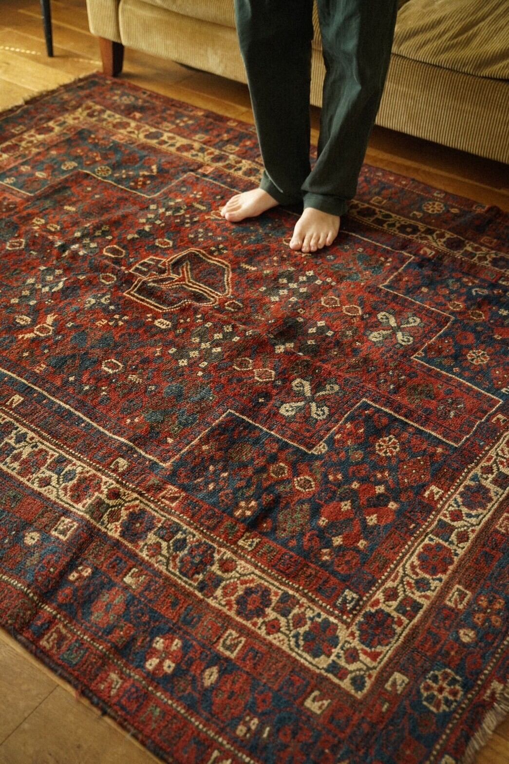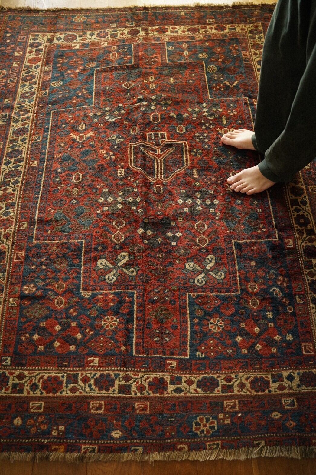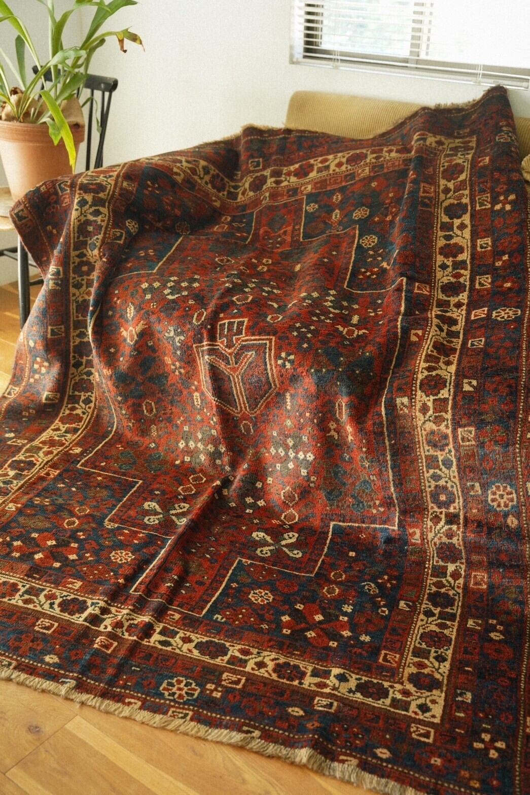 力強い存在感のあるセンターメダリオンの周りには草花や木、ボテなど部族の伝統的なモチーフが美しい彩りで織り込まれています。またエンドレスノットと呼ばれる家族の健康や繁栄、幸福を願う吉祥紋様が沢山描かれており、織り手の強い祈りや願いが感じられます。経年によって熟成された色味や柔らかな手触りになったアンティークラグはなんとも言えない味わい深さと魅力があります。自分より長くこの世を見てきた先輩ラグ。海を超えてイランから日本にやってきた奇跡や歴史を考えるだけでワクワクしますね♪
