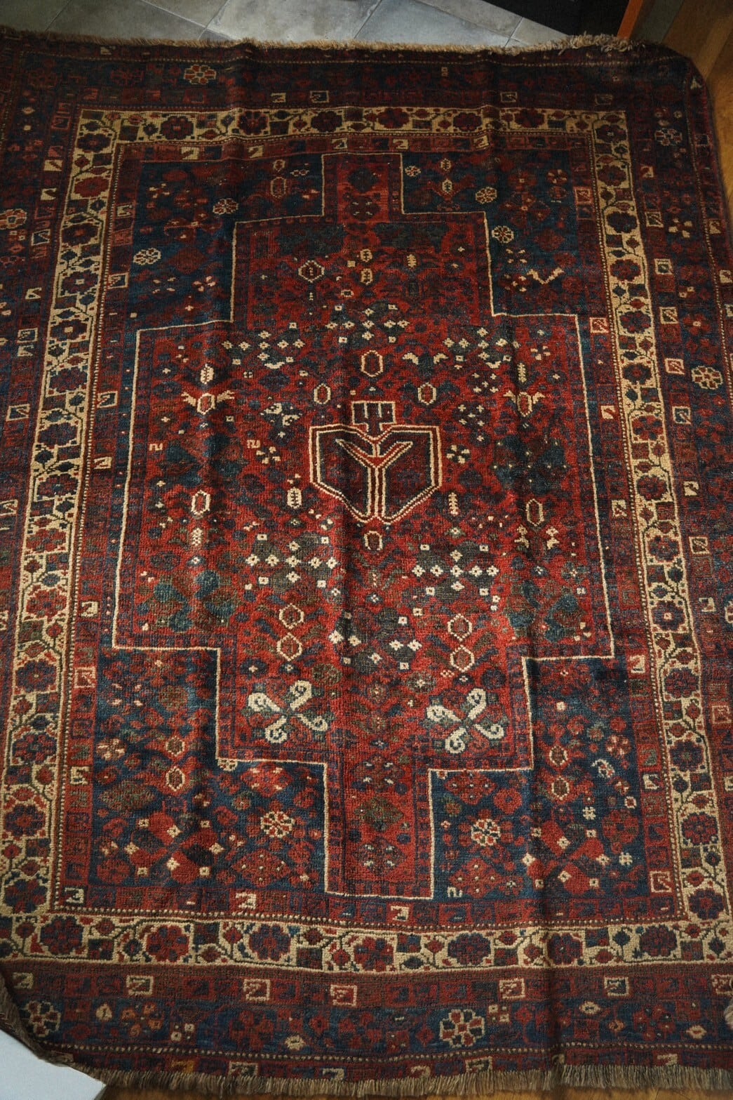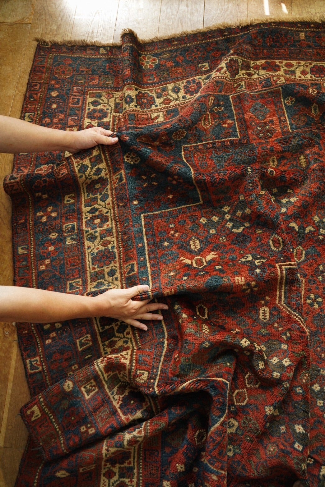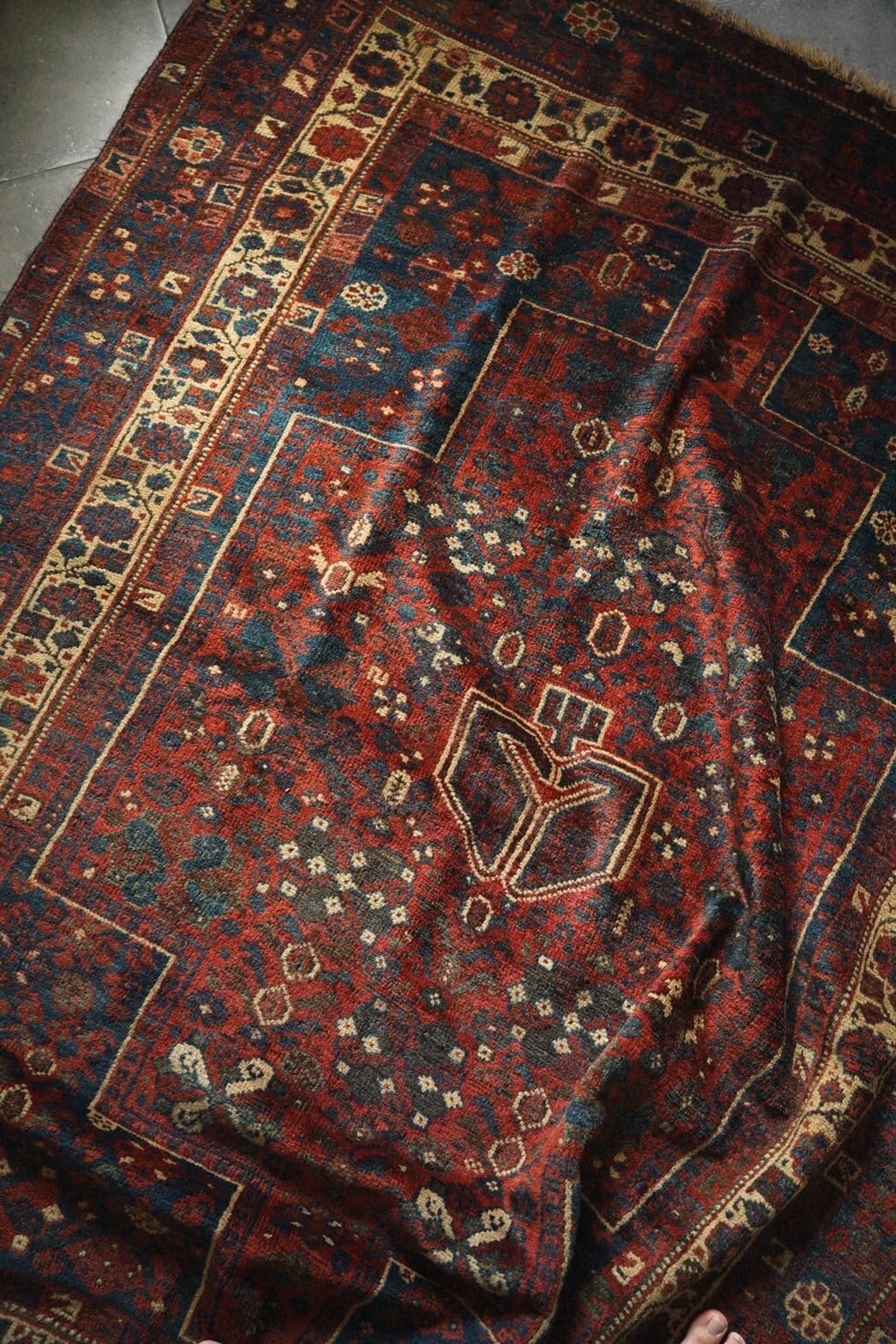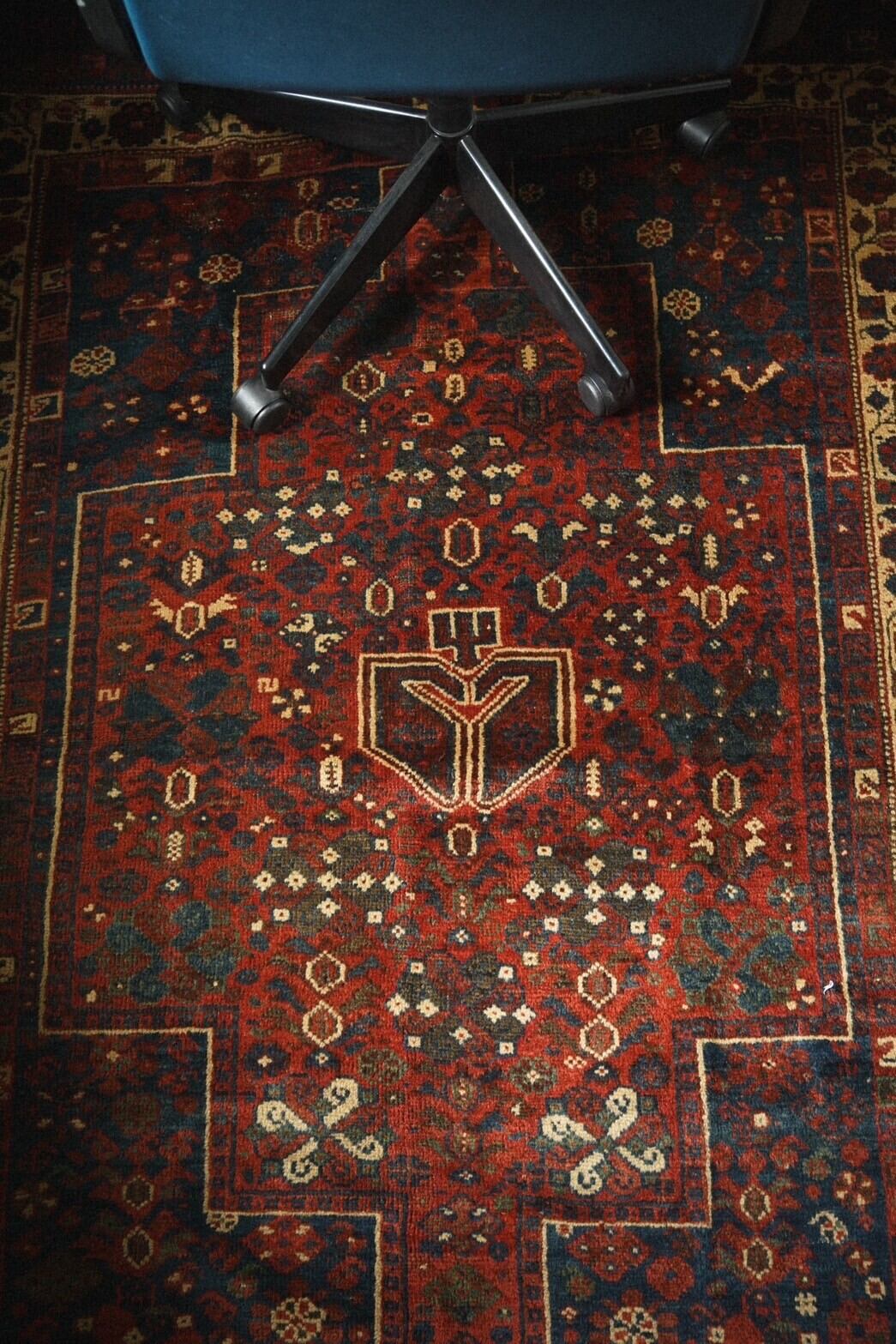 力強い存在感のあるセンターメダリオンの周りには草花や木、ボテなど部族の伝統的なモチーフが美しい彩りで織り込まれています。またエンドレスノットと呼ばれる家族の健康や繁栄、幸福を願う吉祥紋様が沢山描かれており、織り手の強い祈りや願いが感じられます。経年によって熟成された色味や柔らかな手触りになったアンティークラグはなんとも言えない味わい深さと魅力があります。自分より長くこの世を見てきた先輩ラグ。海を超えてイランから日本にやってきた奇跡や歴史を考えるだけでワクワクしますね♪