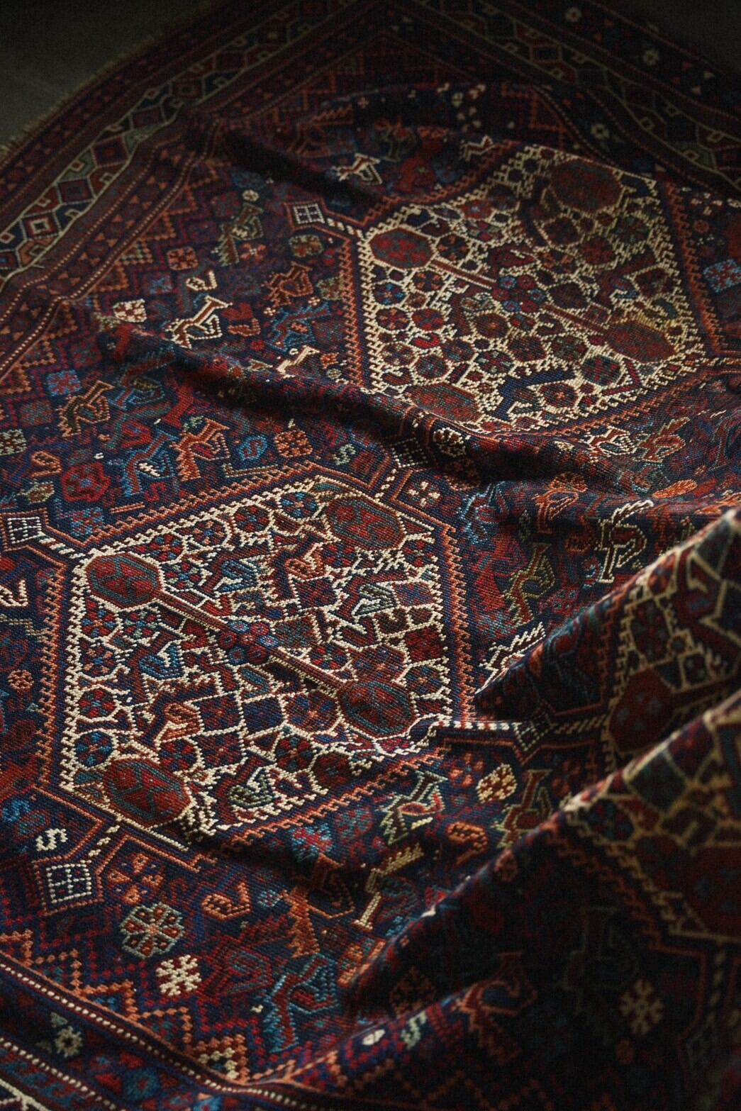 ボーダー部分もカラフルな色合いで何層にもなっており、細かいところまで凝ったデザインになっています。経年120年近いラグのため一部パイルが低くなっておりますが、擦れも長い歴史を感じる魅力の一つだとお考え頂ければと思います。その他使用に問題のあるようなダメージなどは見受けられません。