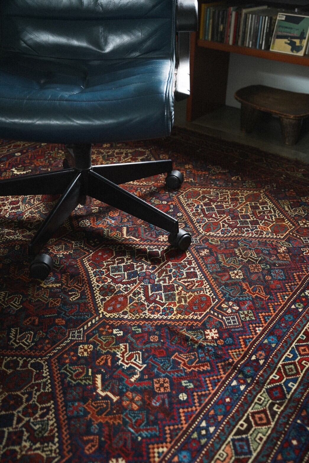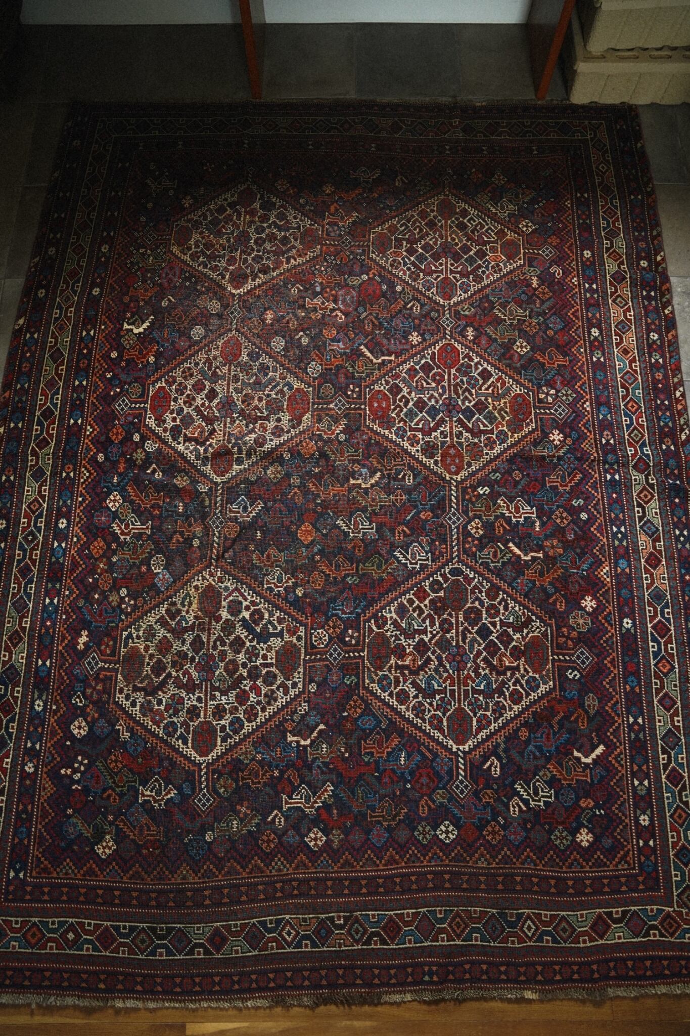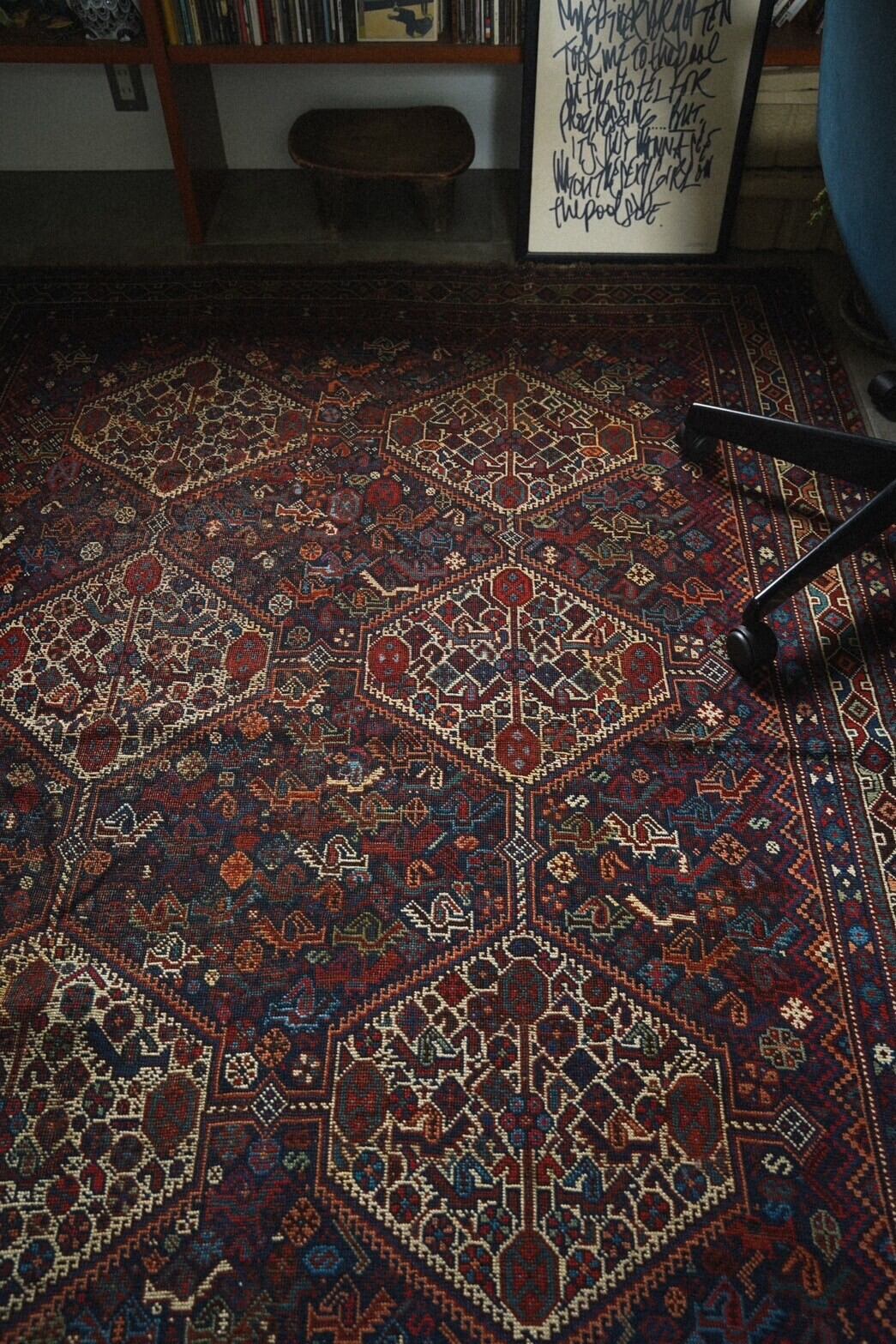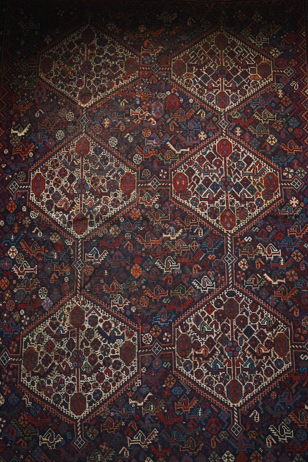 イラン南部に住むハムセ連合によるムルグ(鶏)文様がたくさん描かれた伝統的なデザインのラグ。