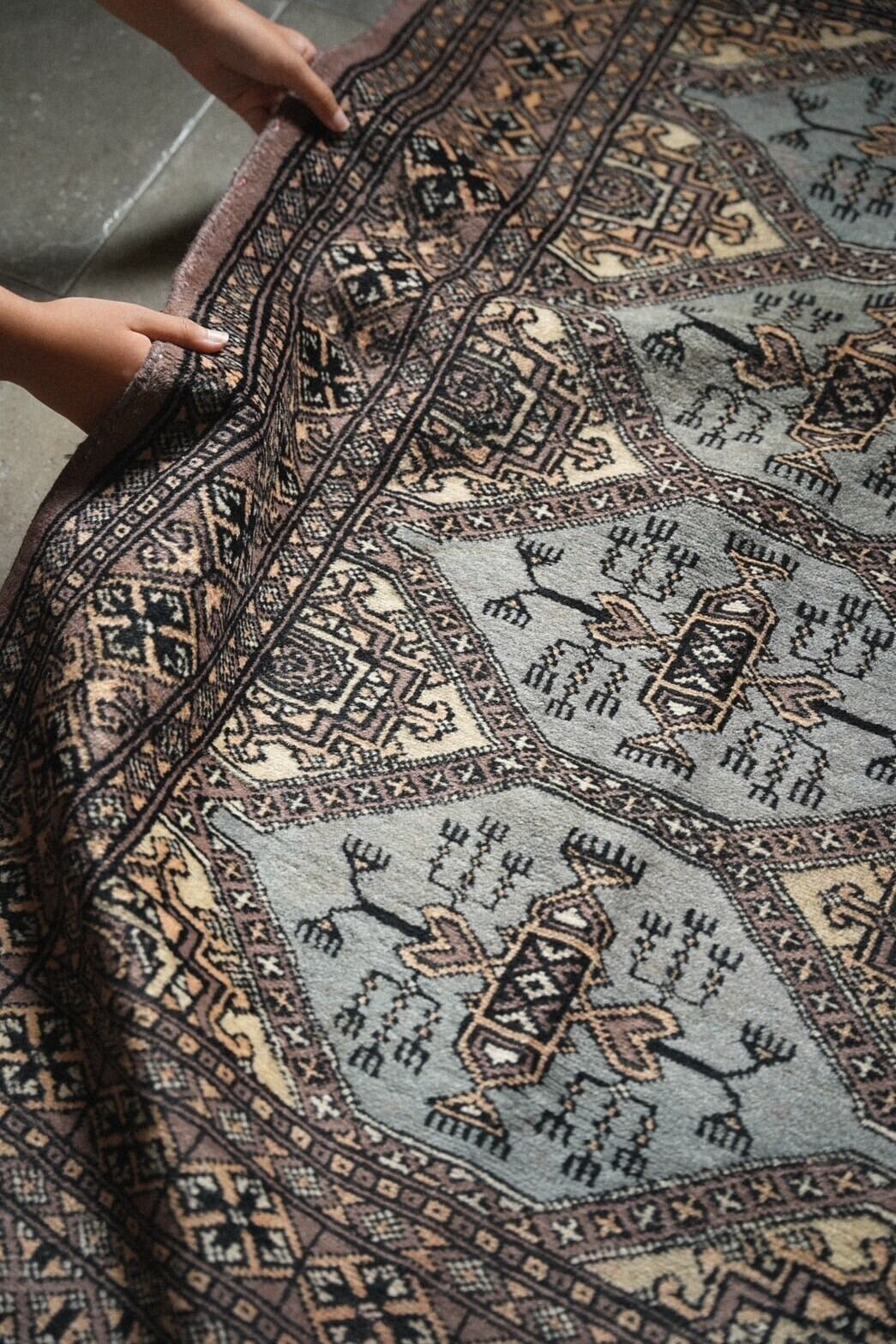 水色をベースにくすみ系カラーがおしゃれなパキスタン産のラグ。