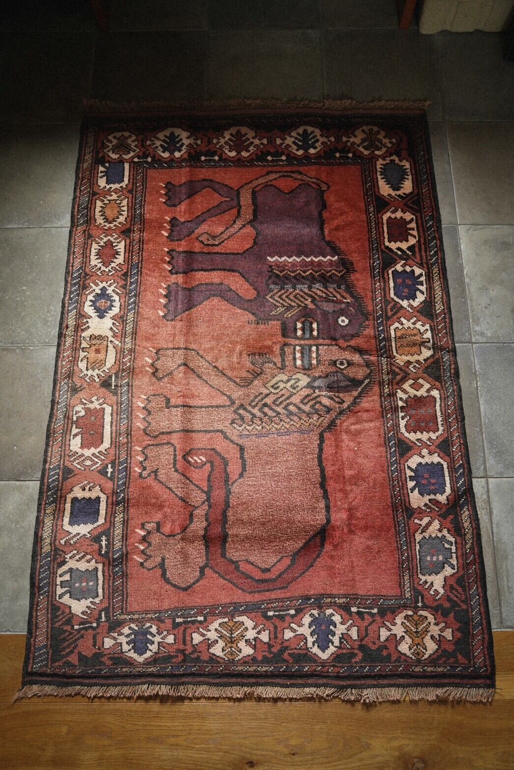 ギャッベでよく見るライオンが描かれた人気のデザインのラグですが、こちらはタイマニ族によって織られた珍しい一枚です。