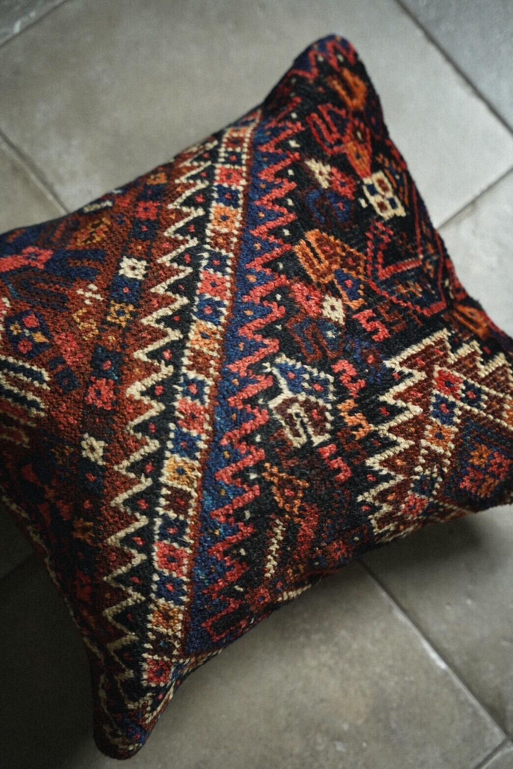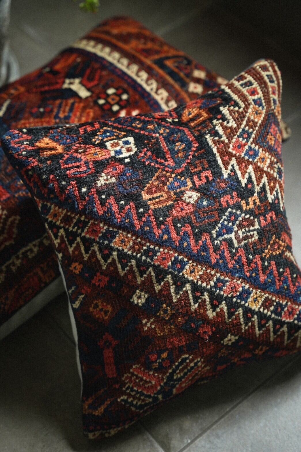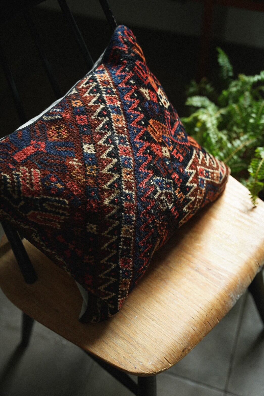 ハムセ連合の80年前のアンティークのラグを再利用して作られたクッションカバー。