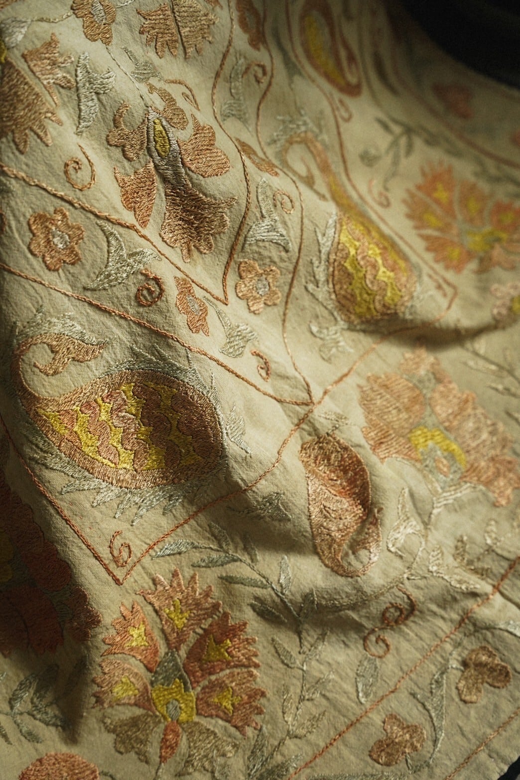 遊牧民の女性が代々受け継いできた伝統的な技術を用いて手刺繍で作られたスザニは見るだけでうっとりするような美しさ。