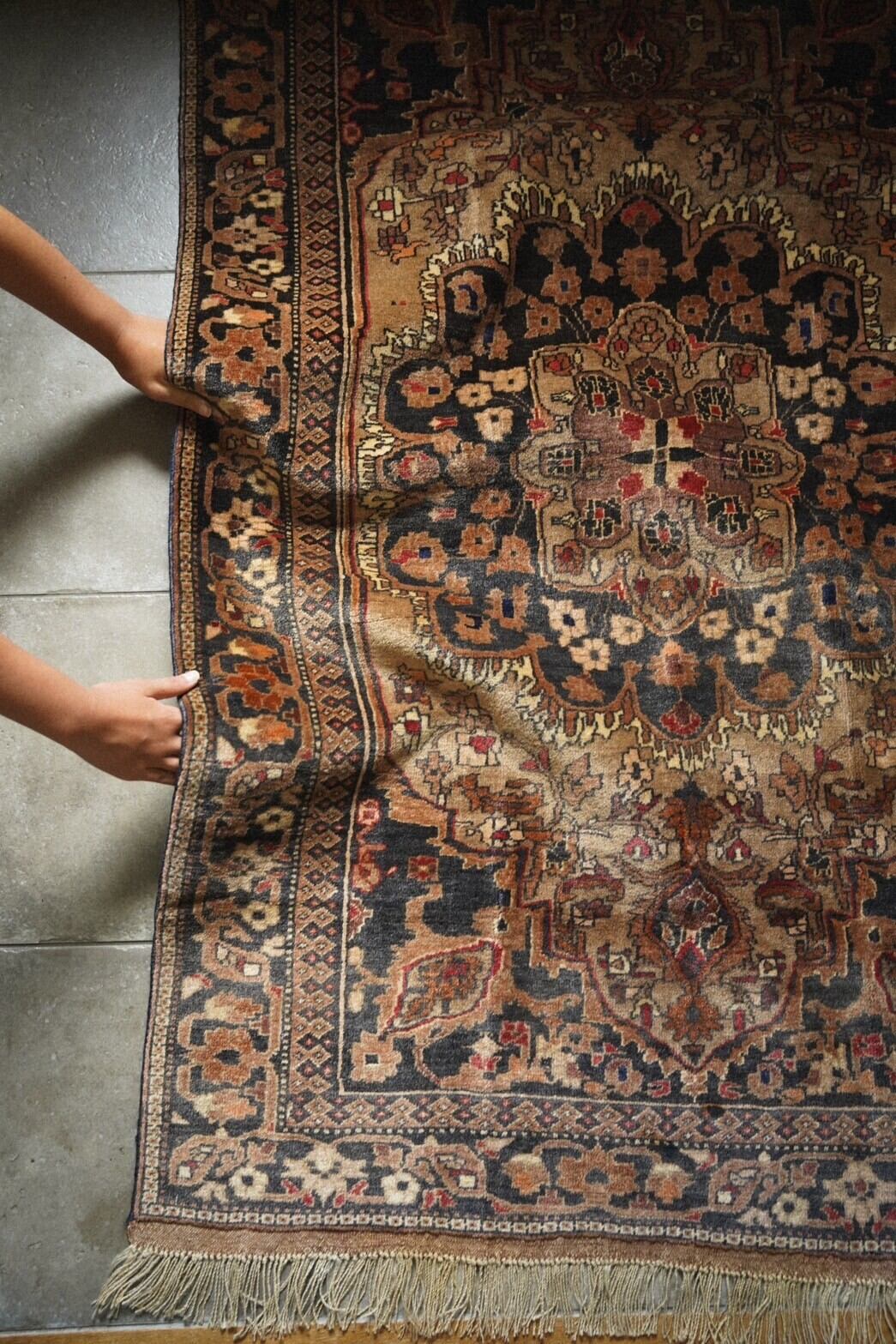 存在感のある華やかなセンターメダリオンと、その周りにも細かく彩り豊かに表現された花紋様。