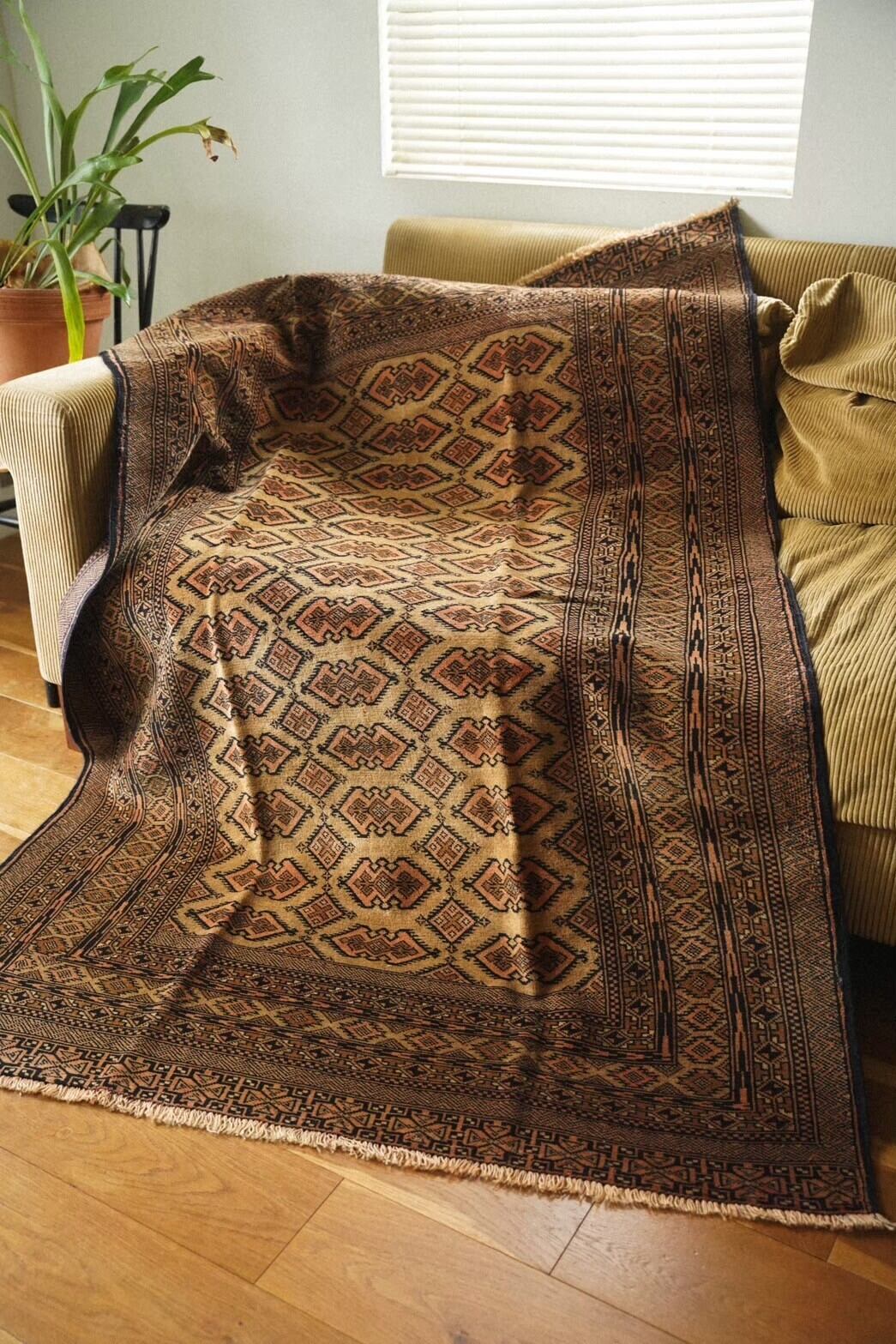 リビングやソファ前、ダイニングテーブルの下やベッドサイドなどにぴったりのサイズ感です。真っ白な壁や明るめのフローリングなどシンプルな空間に敷いても暗い印象にならないので、お部屋の模様替えや新居のラグをお探し中の方やトライバルラグ初心者の方にもおすすめのラグです。