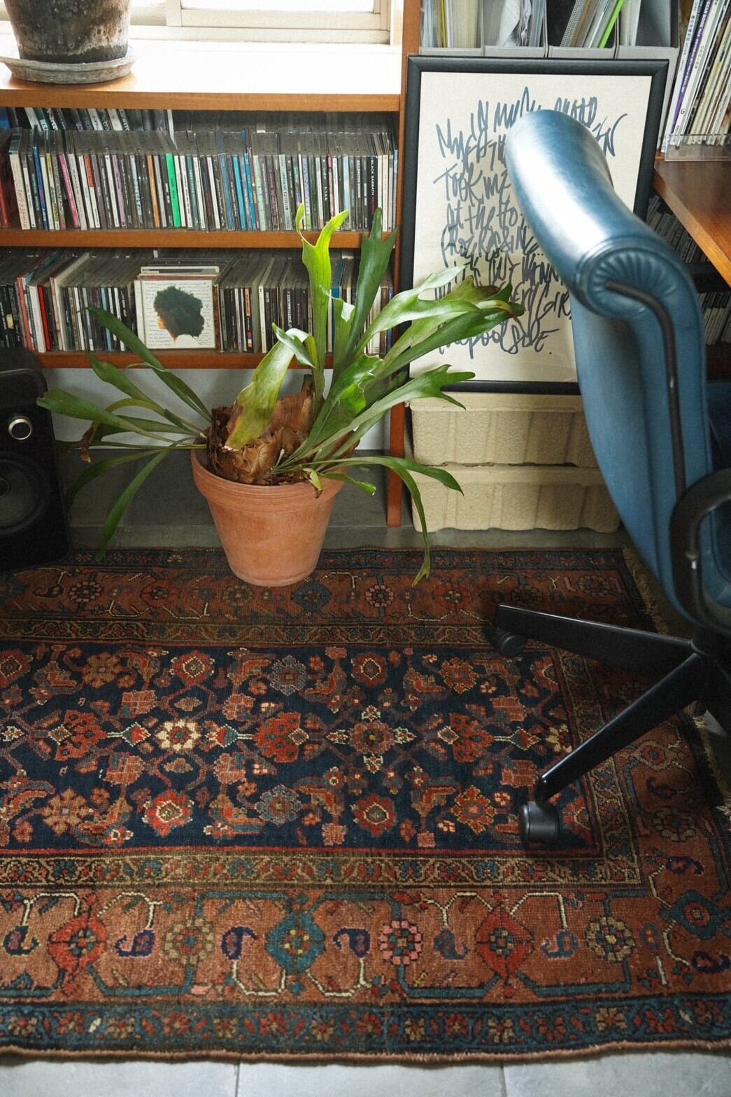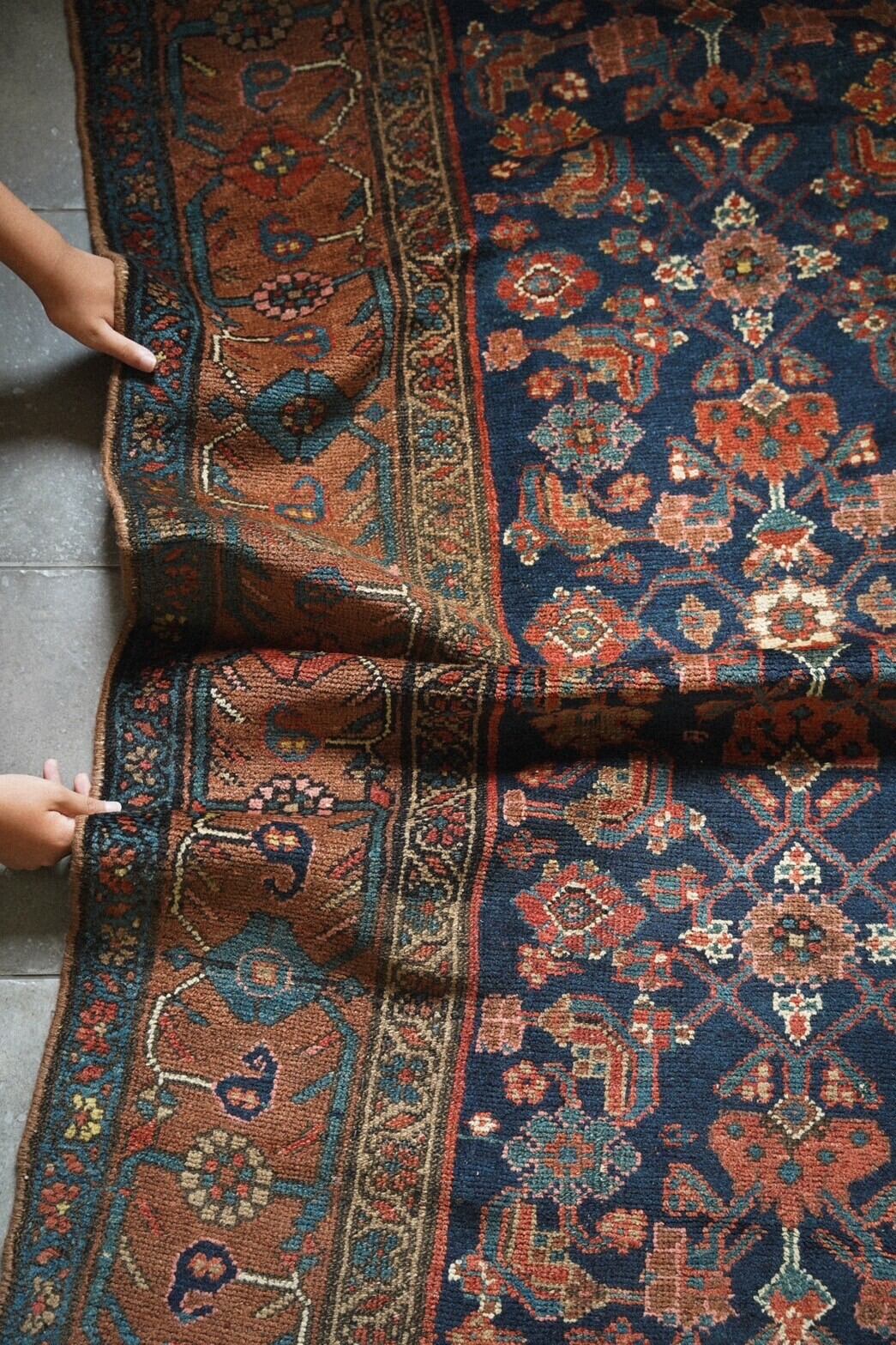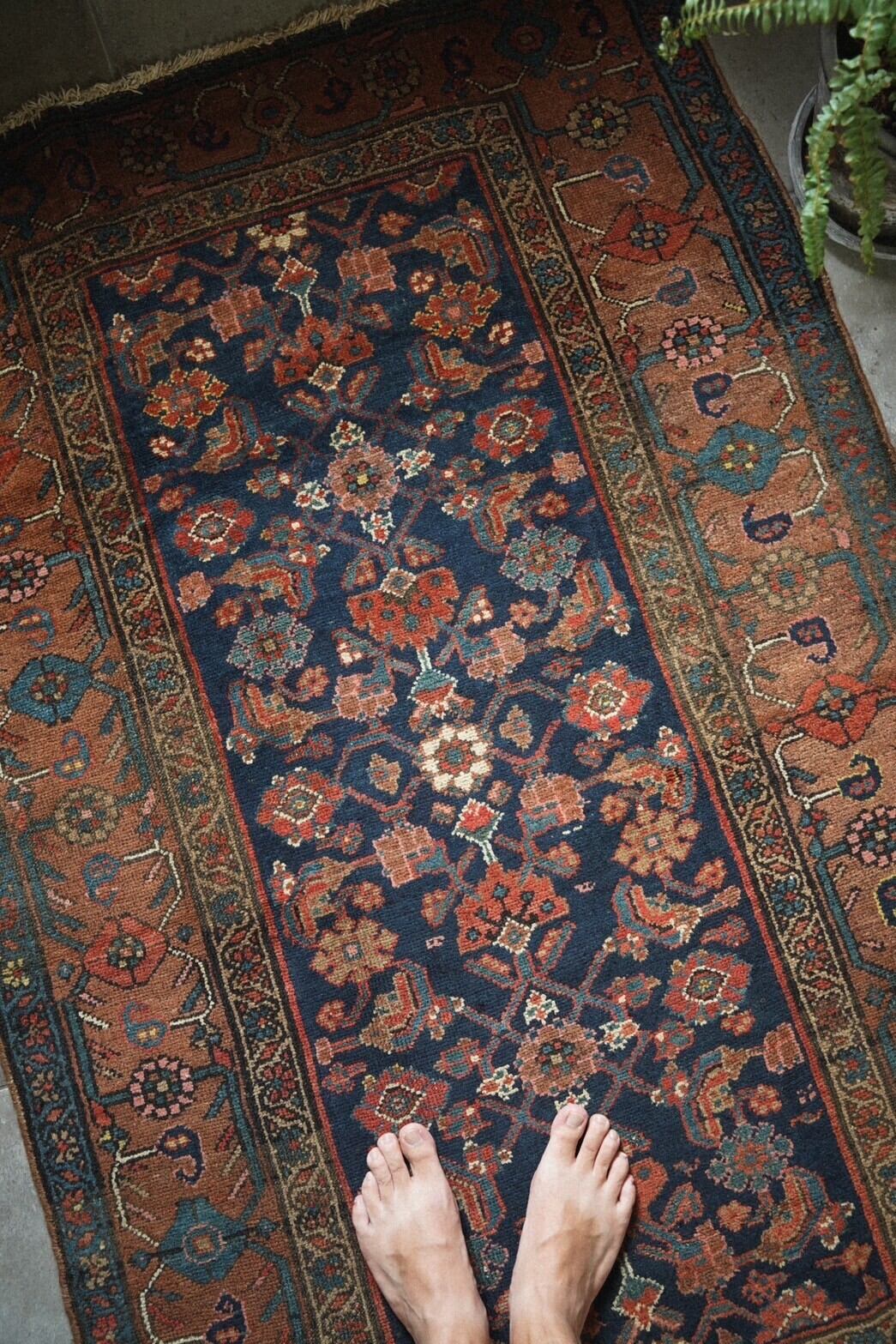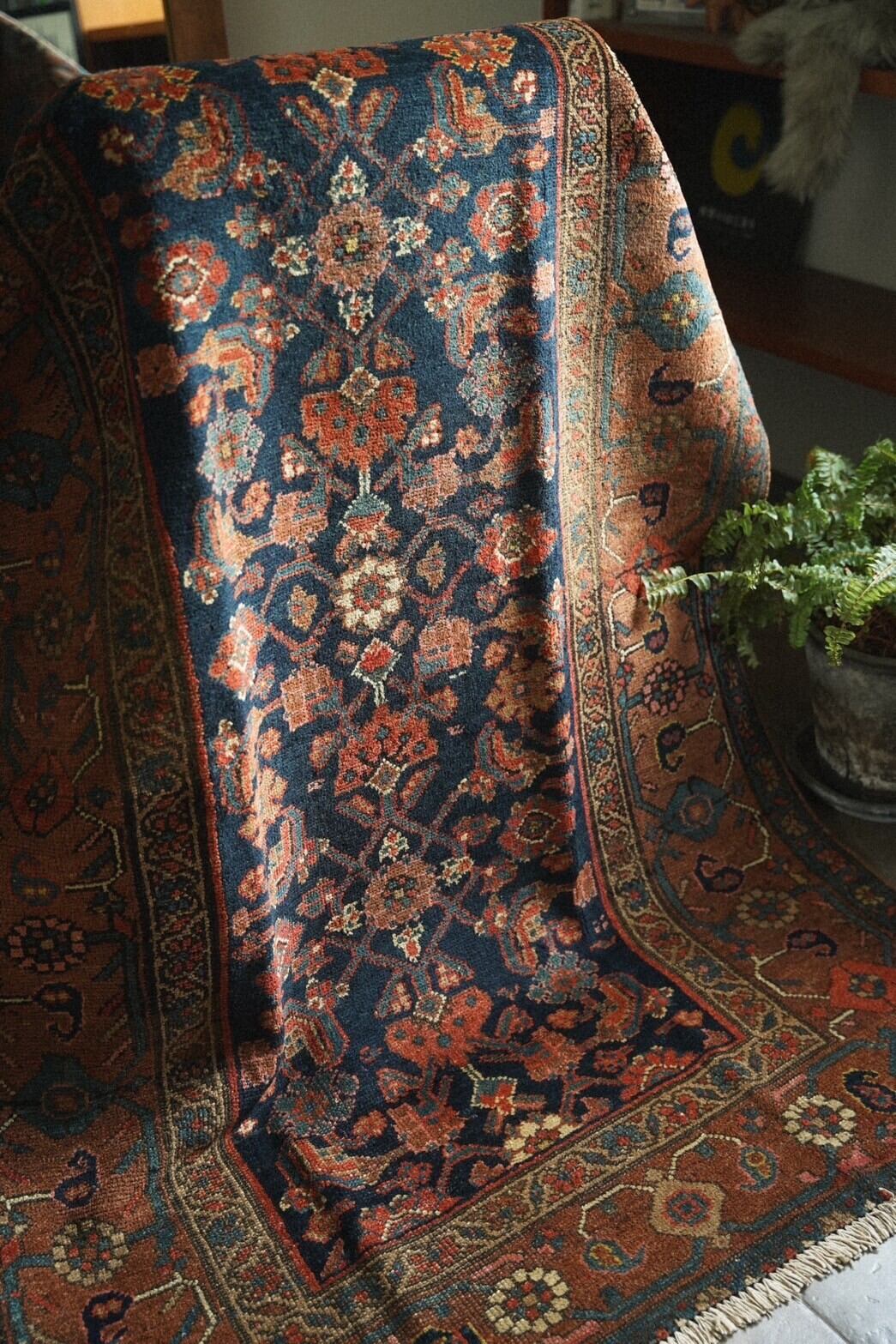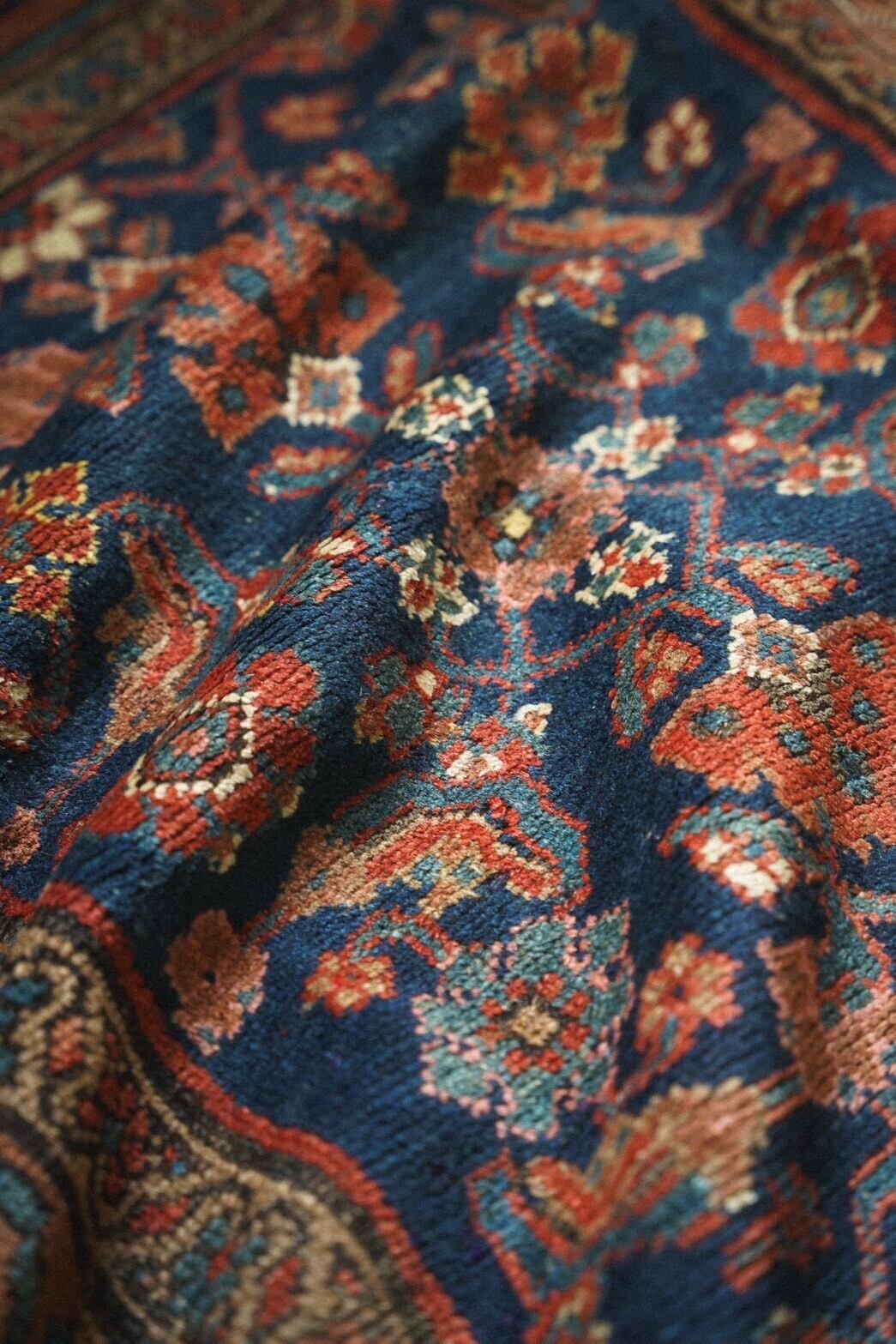 ボーダー部分には可愛らしいお花がレッド、ブルー、サーモンピンクなどで描かれたデザイン。アンティークラグならではの熟成された色味とクラシカルなデザインのバランスが良く、どこに敷こうか考えるだけでワクワクする一枚。