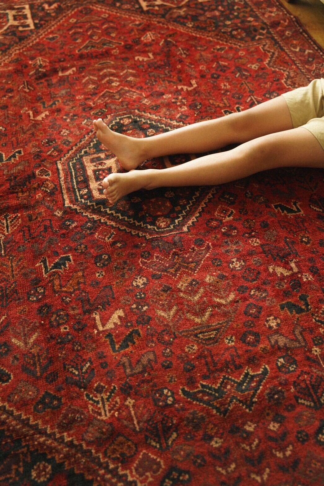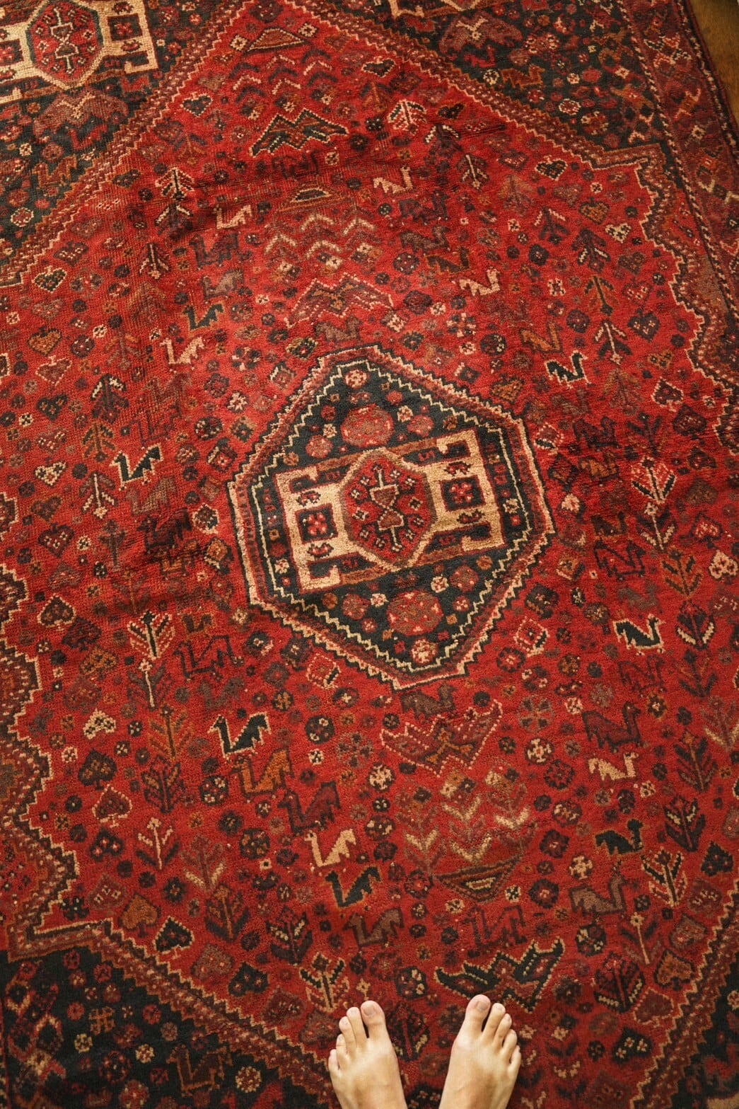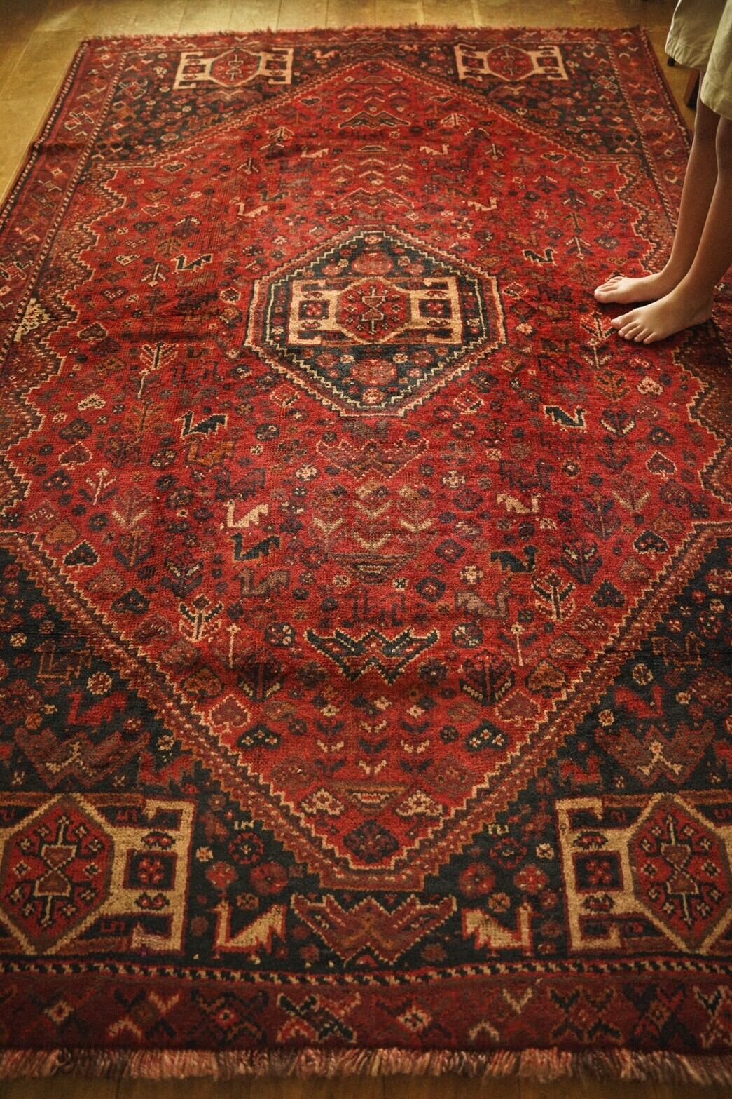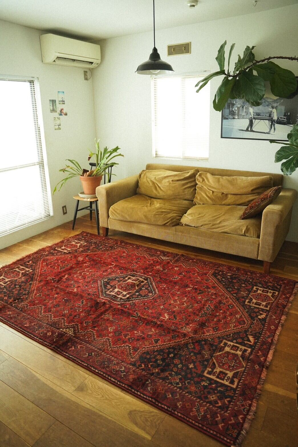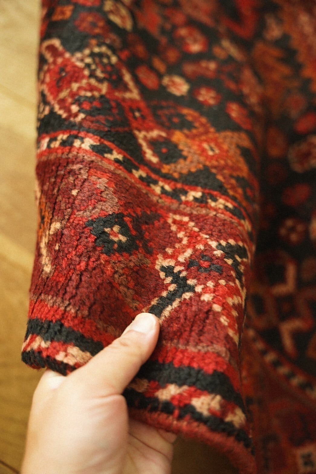 深みのあるレッドとネイビーがベースの全体的に落ち着いたトーンの大判カシュガイラグ。
