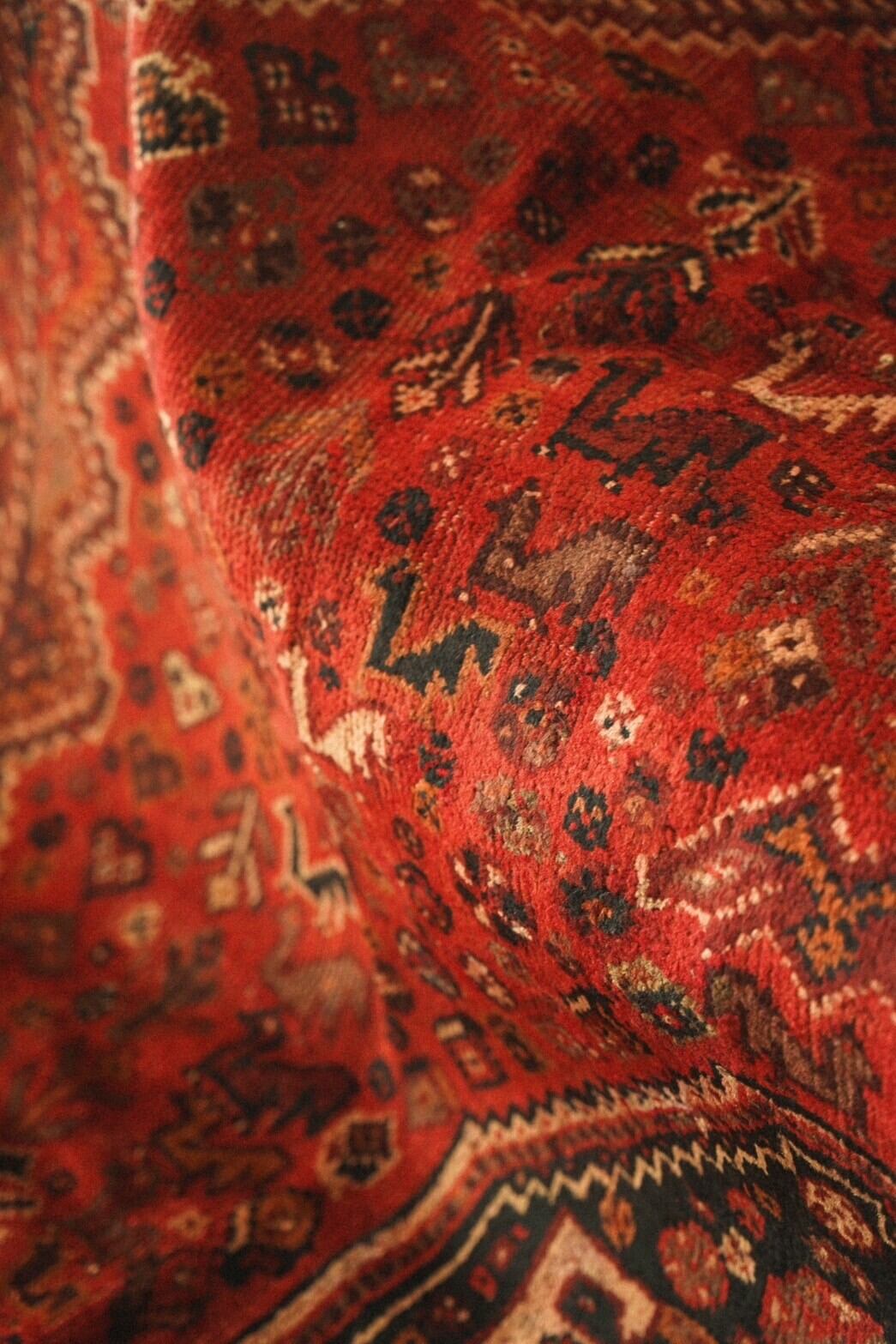 一面に草花や木、ボテなどカシュガイ族の伝統的なモチーフが一面にひしめき合う華やかな一枚。