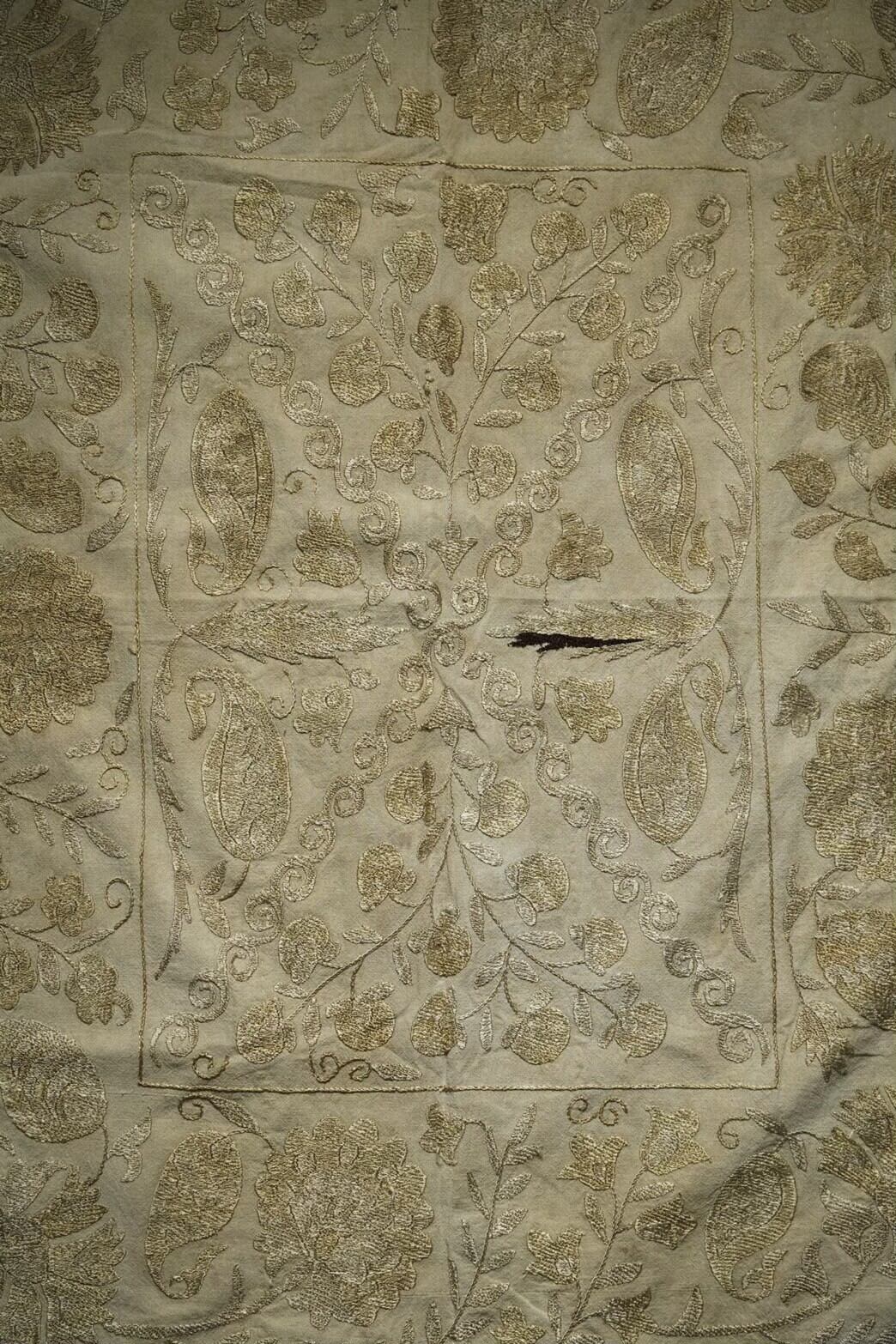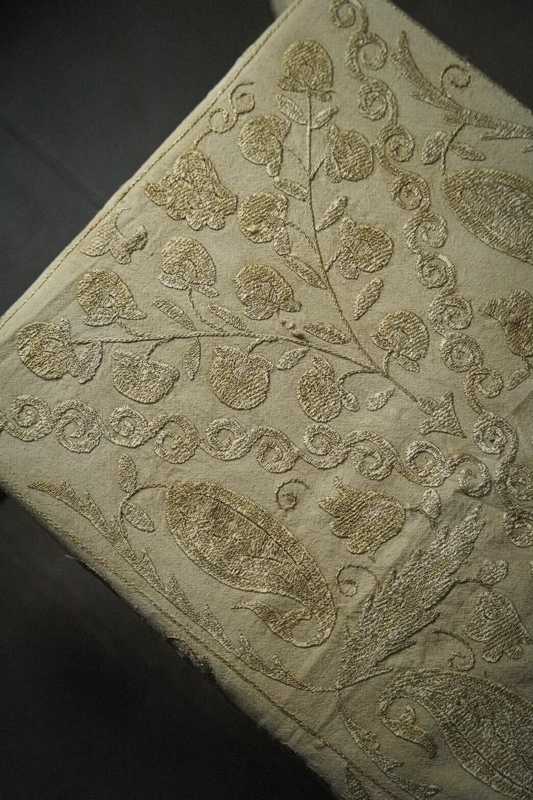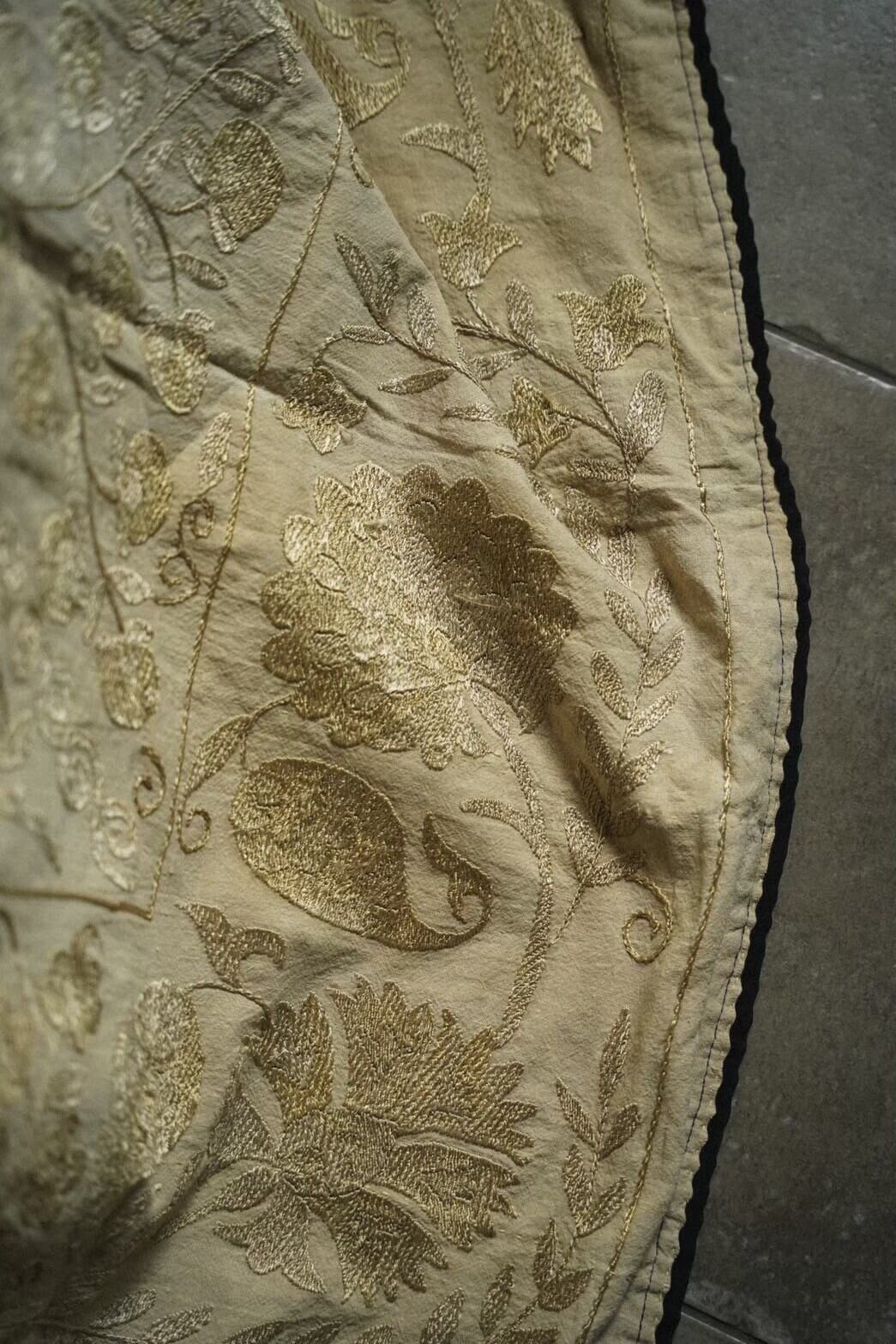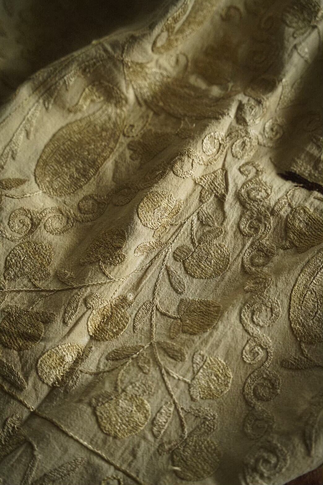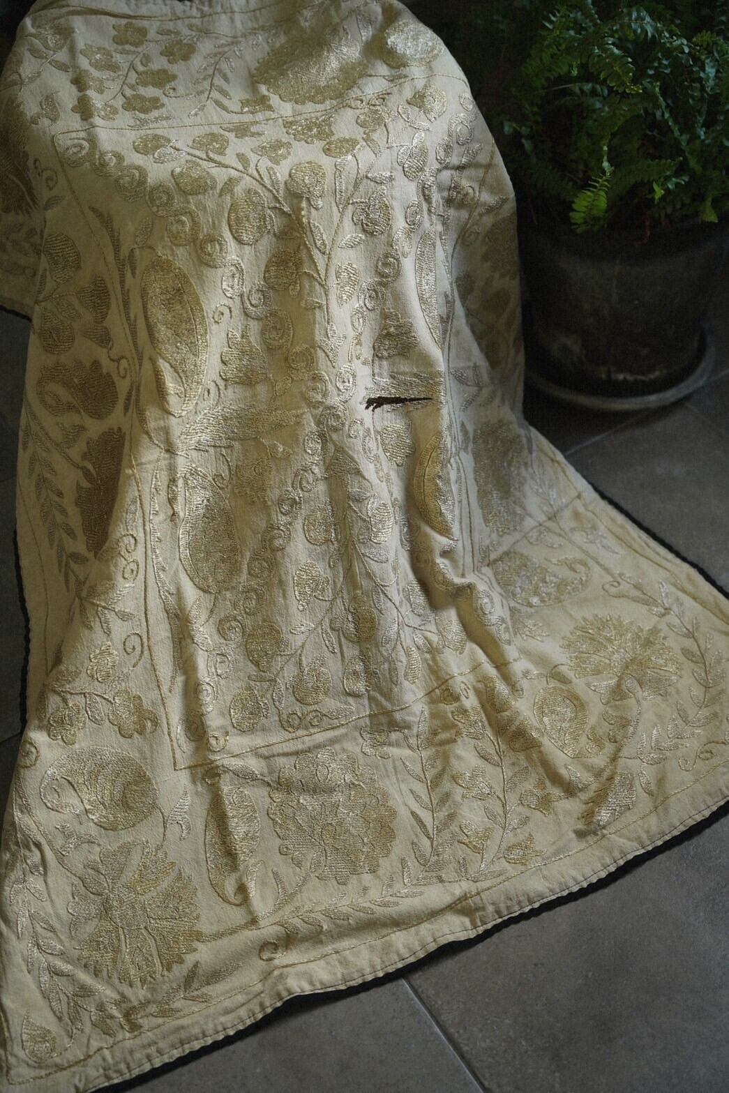 カラフルな色合いのものが多いスザニ刺繍ですが、アイボリーベースにゴールドのシルクの組み合わせは大人っぽくエレガントでとてもお洒落な一枚。
