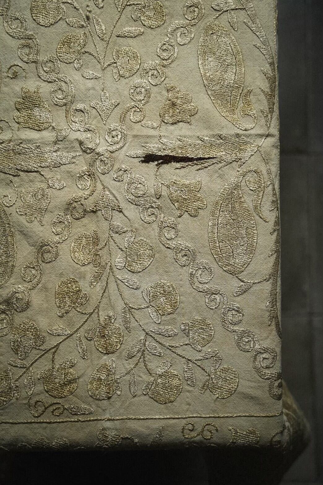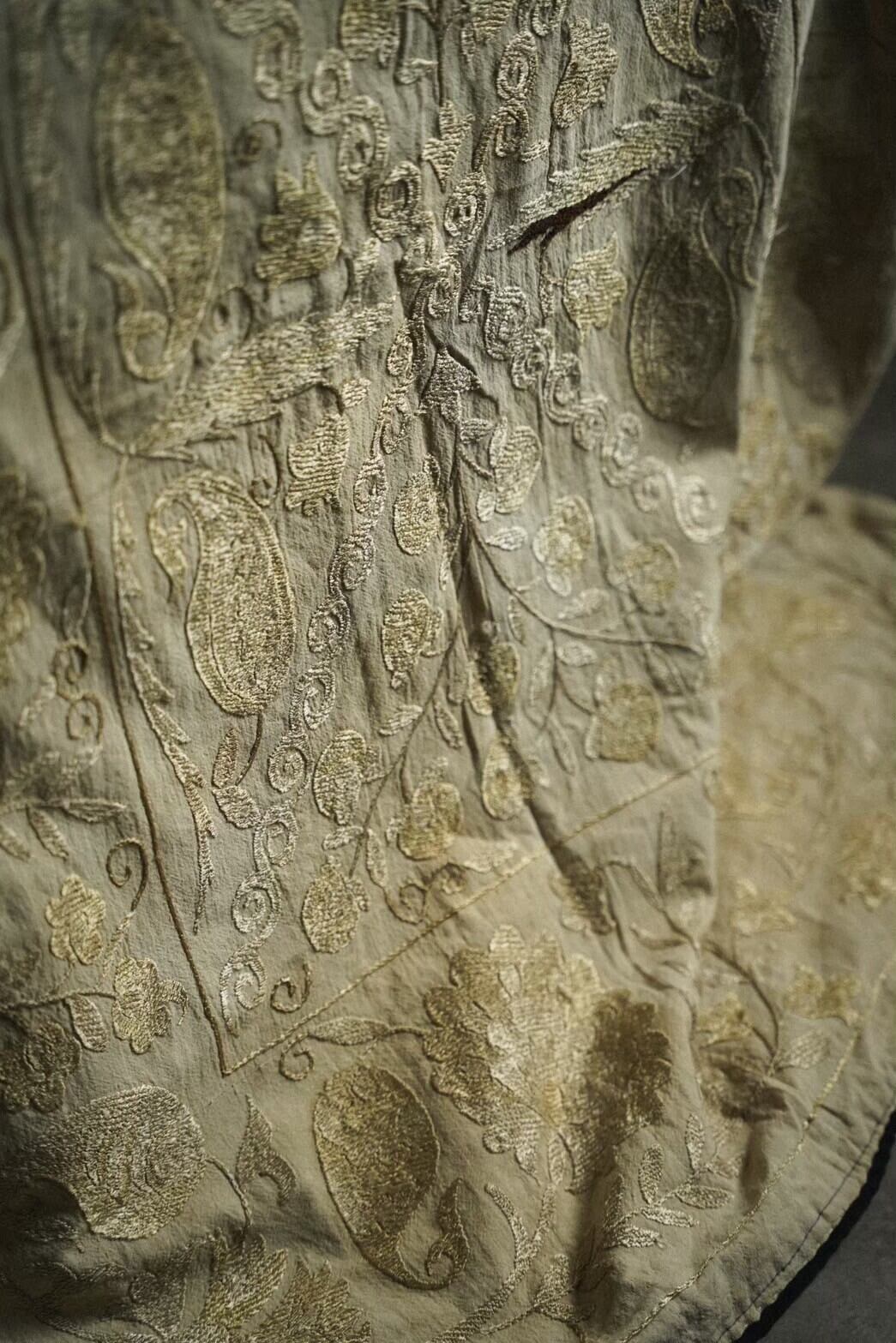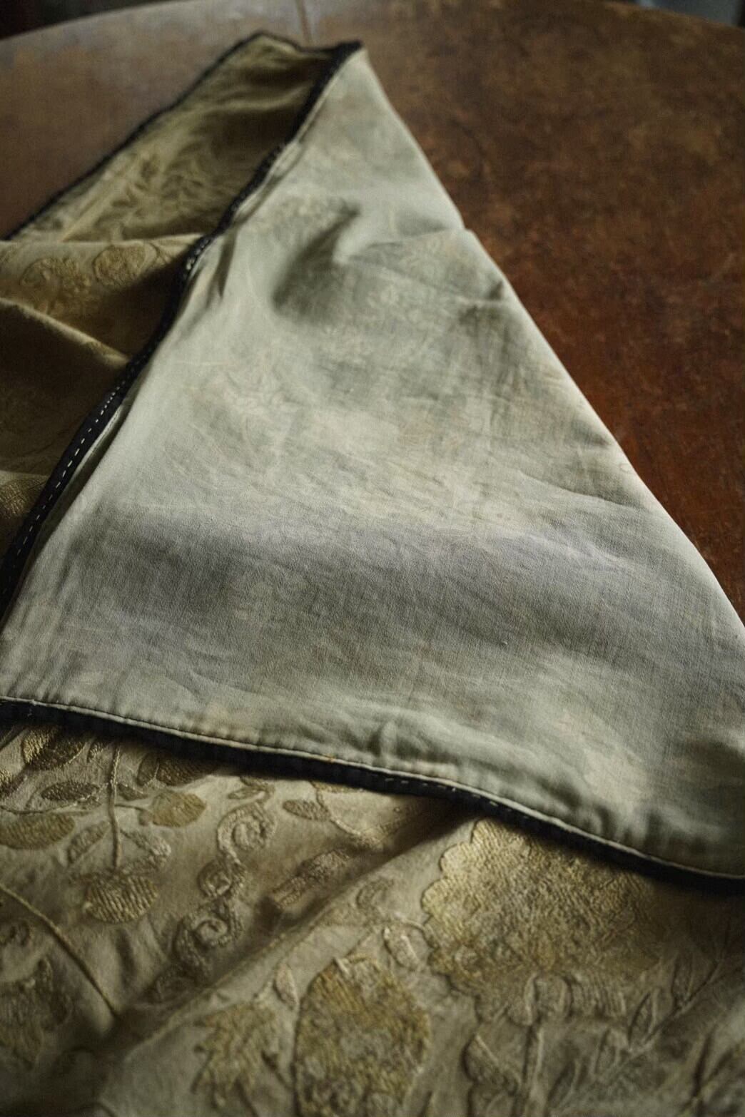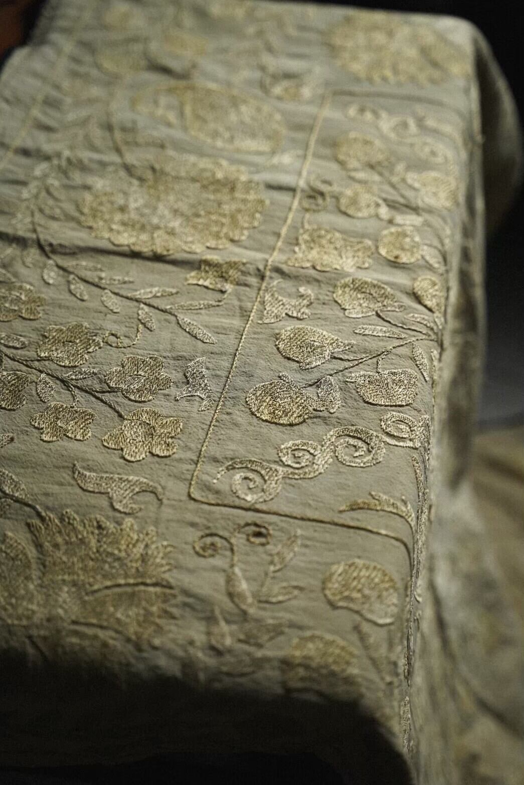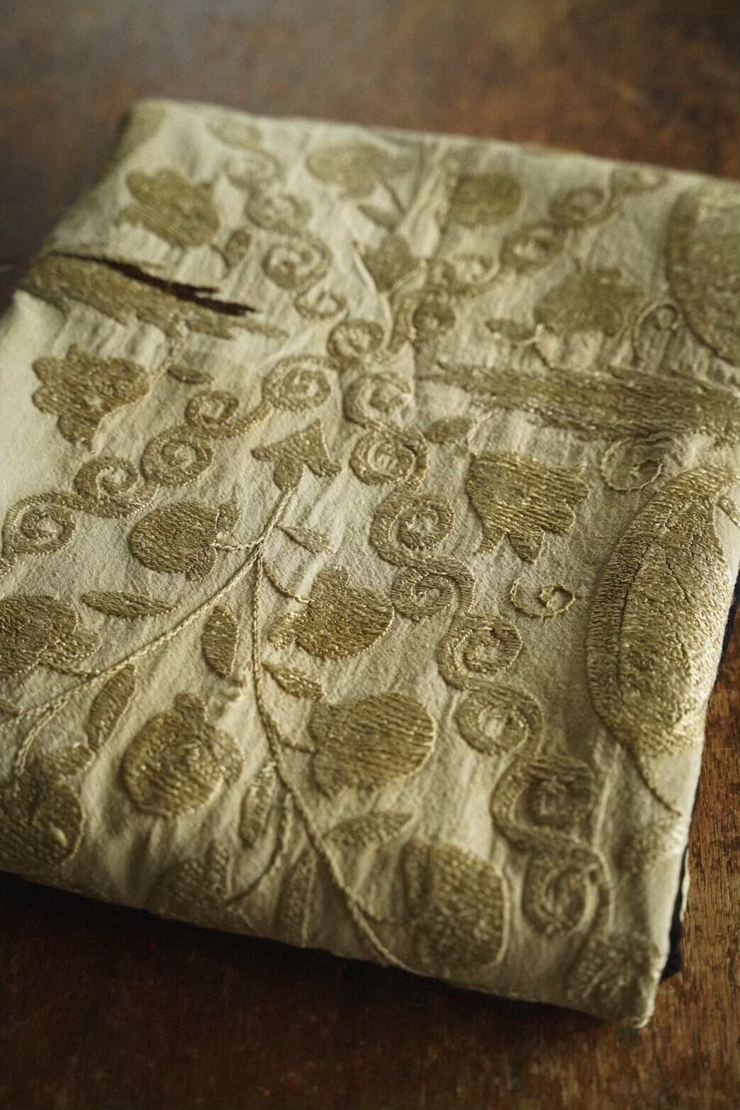 カラフルな色合いのものが多いスザニ刺繍ですが、アイボリーベースにゴールドのシルクの組み合わせは大人っぽくエレガントでとてもお洒落な一枚。