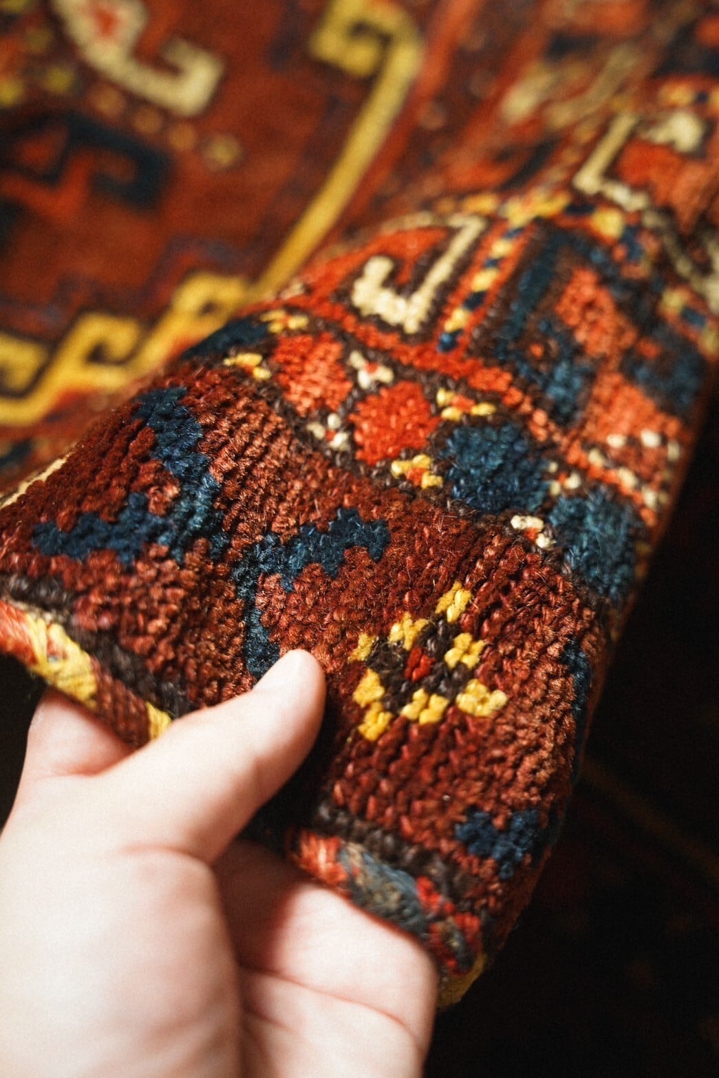 ウズベクラグ特有の柔らかいウールで織られており、ベースはチョコレート色にイエローが効かせたメムリンクギュルが描かれています。