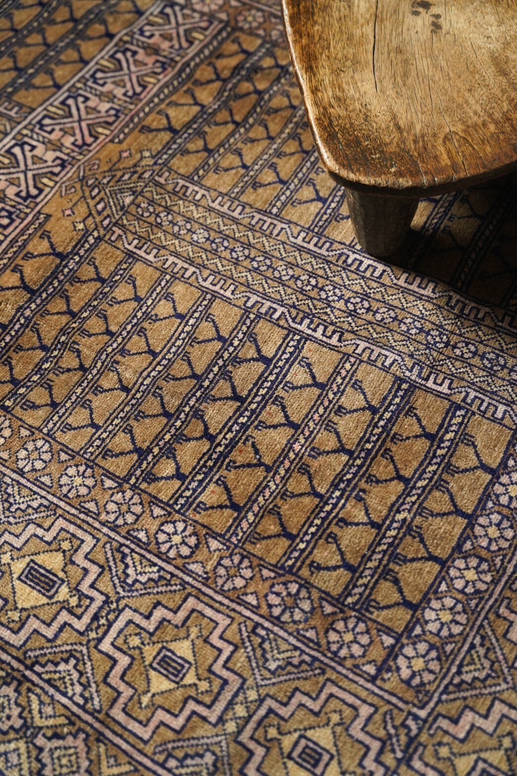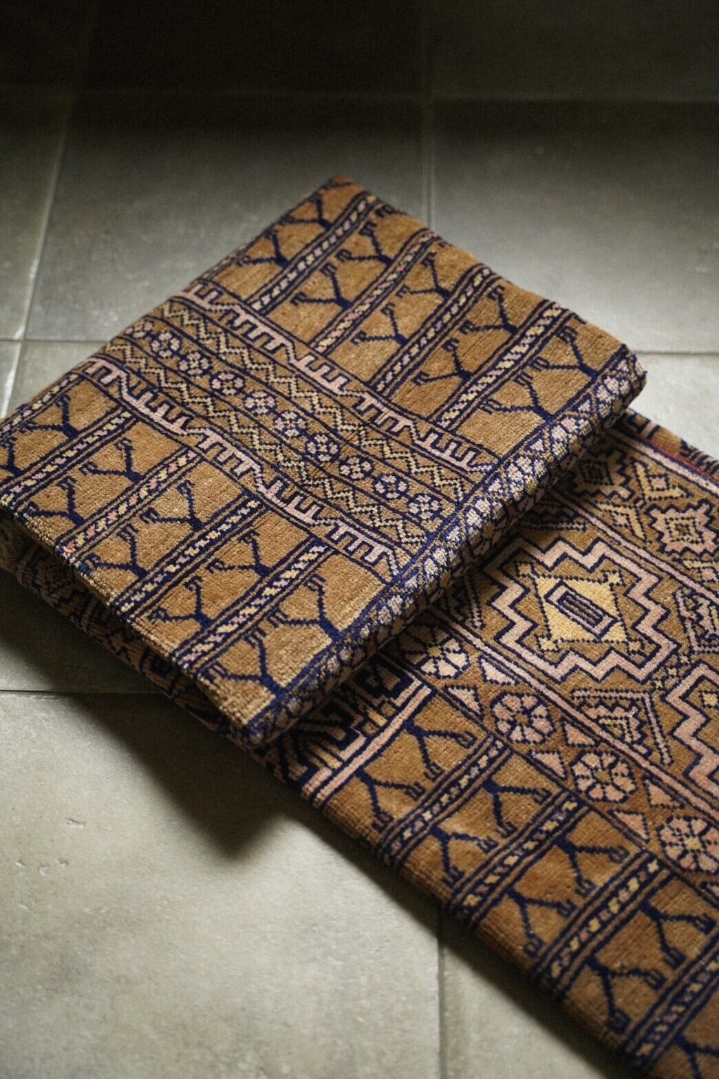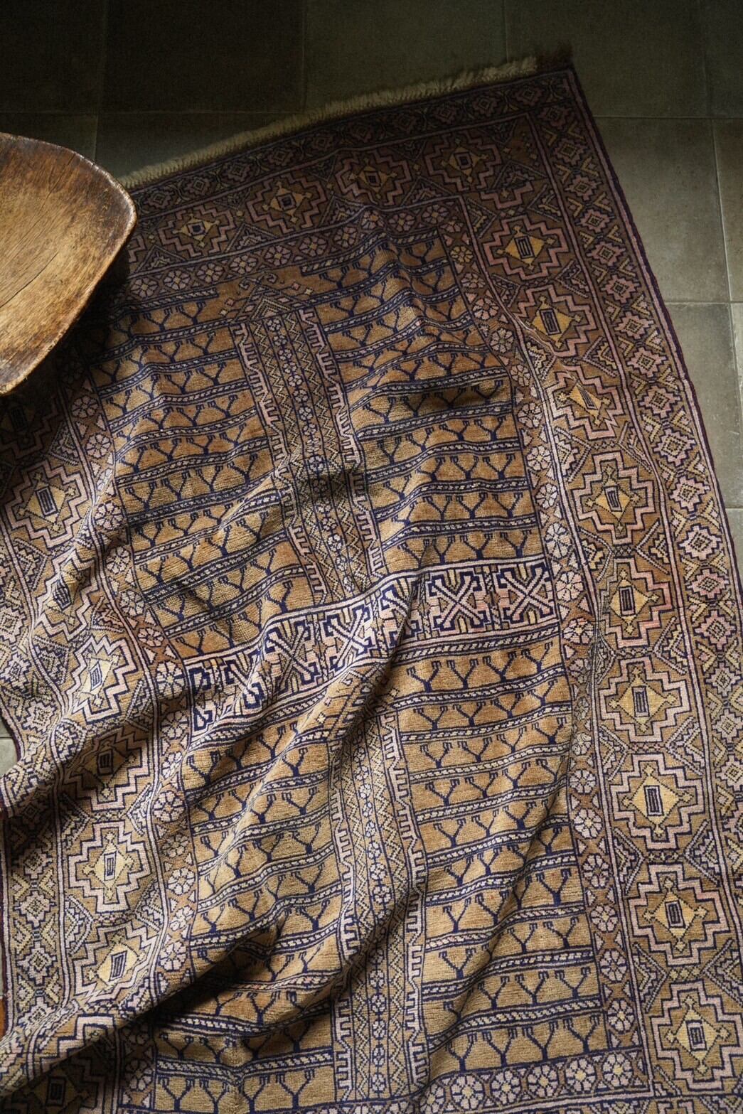 パイルは短めですが、密度の詰まった織りでしっかりと丈夫な作り。目立ったダメージはなくグッドコンディション。手織りラグ特有の歪みがあるため気になる方は画像にてご確認ください。