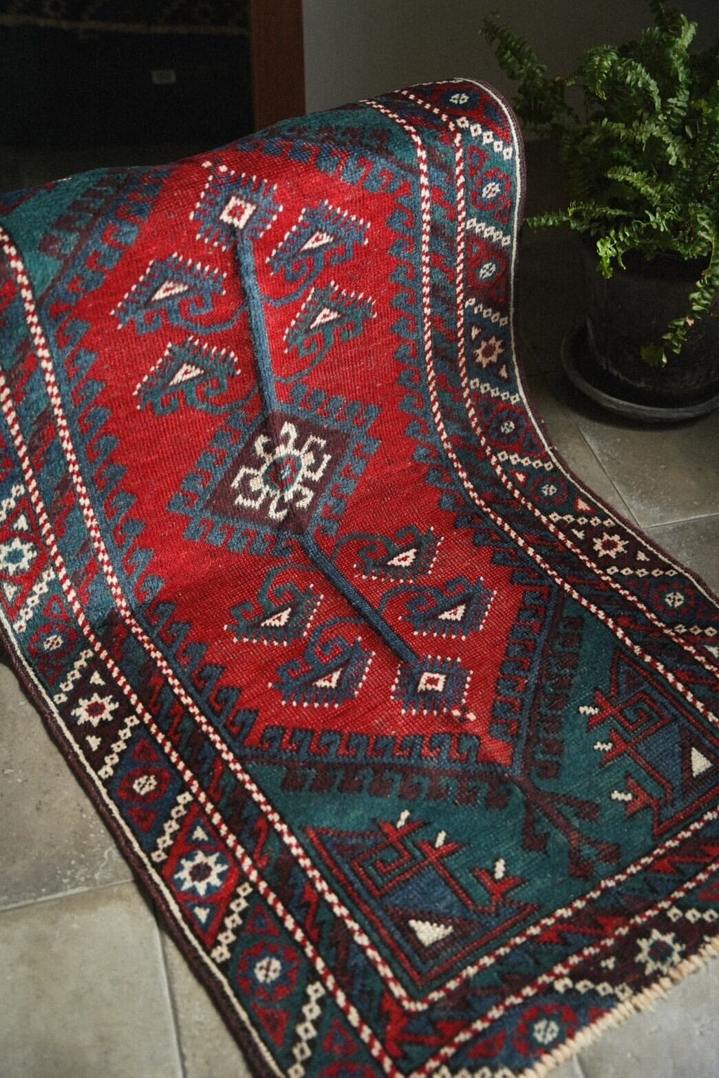 エネルギッシュな力強さを感じるメダリオンの赤と絶妙な色合いのブルーグリーンのコントラストが美しい一枚。