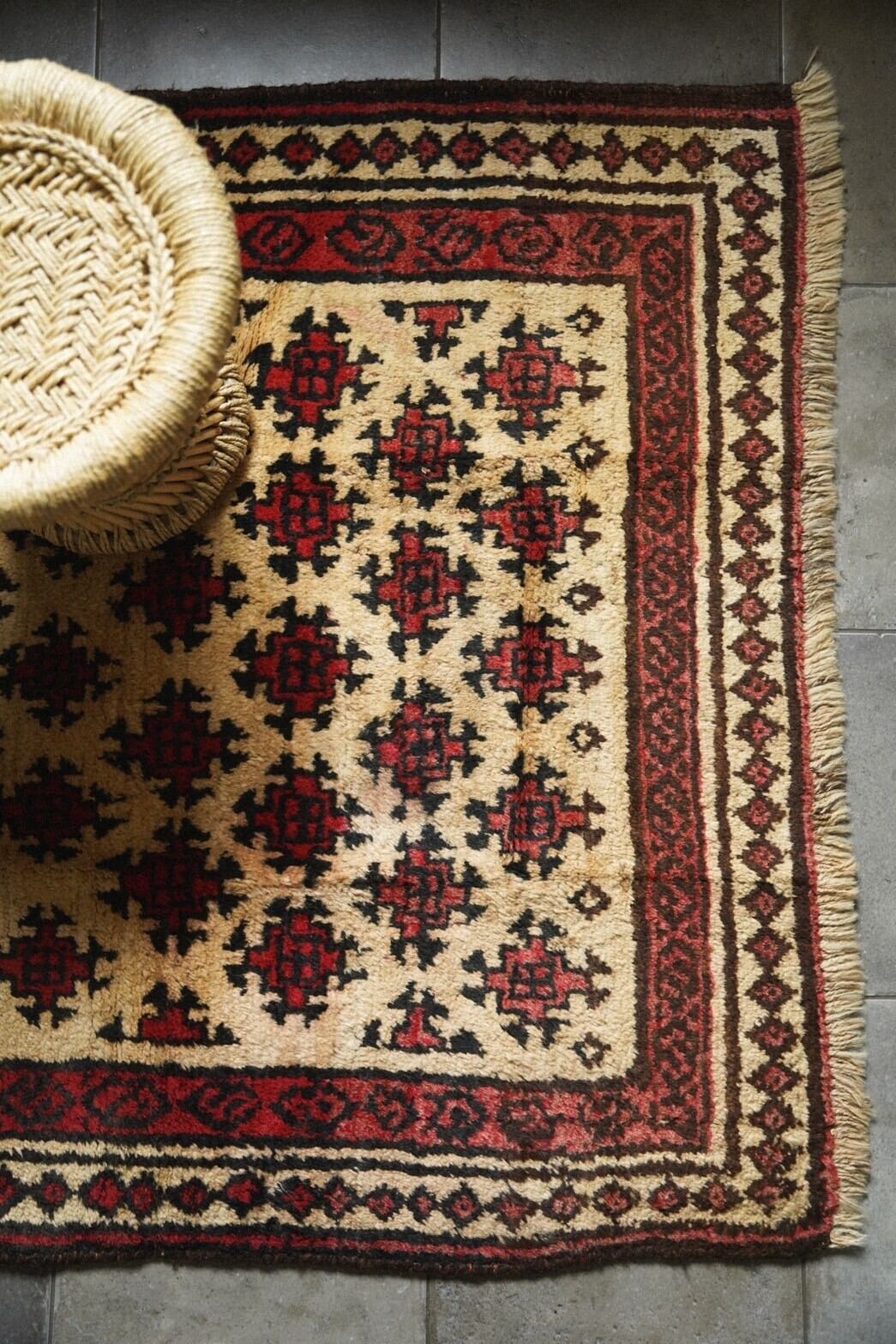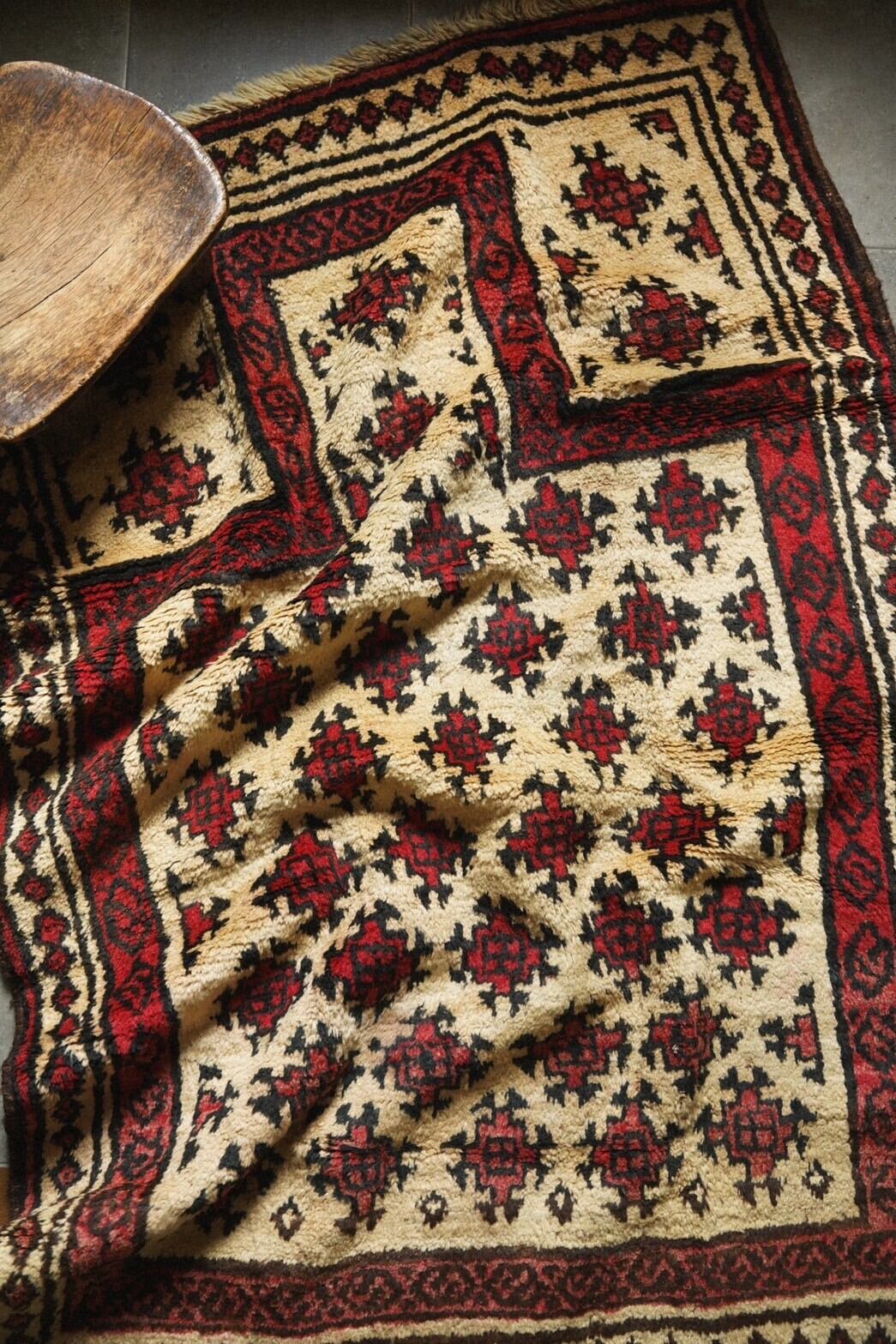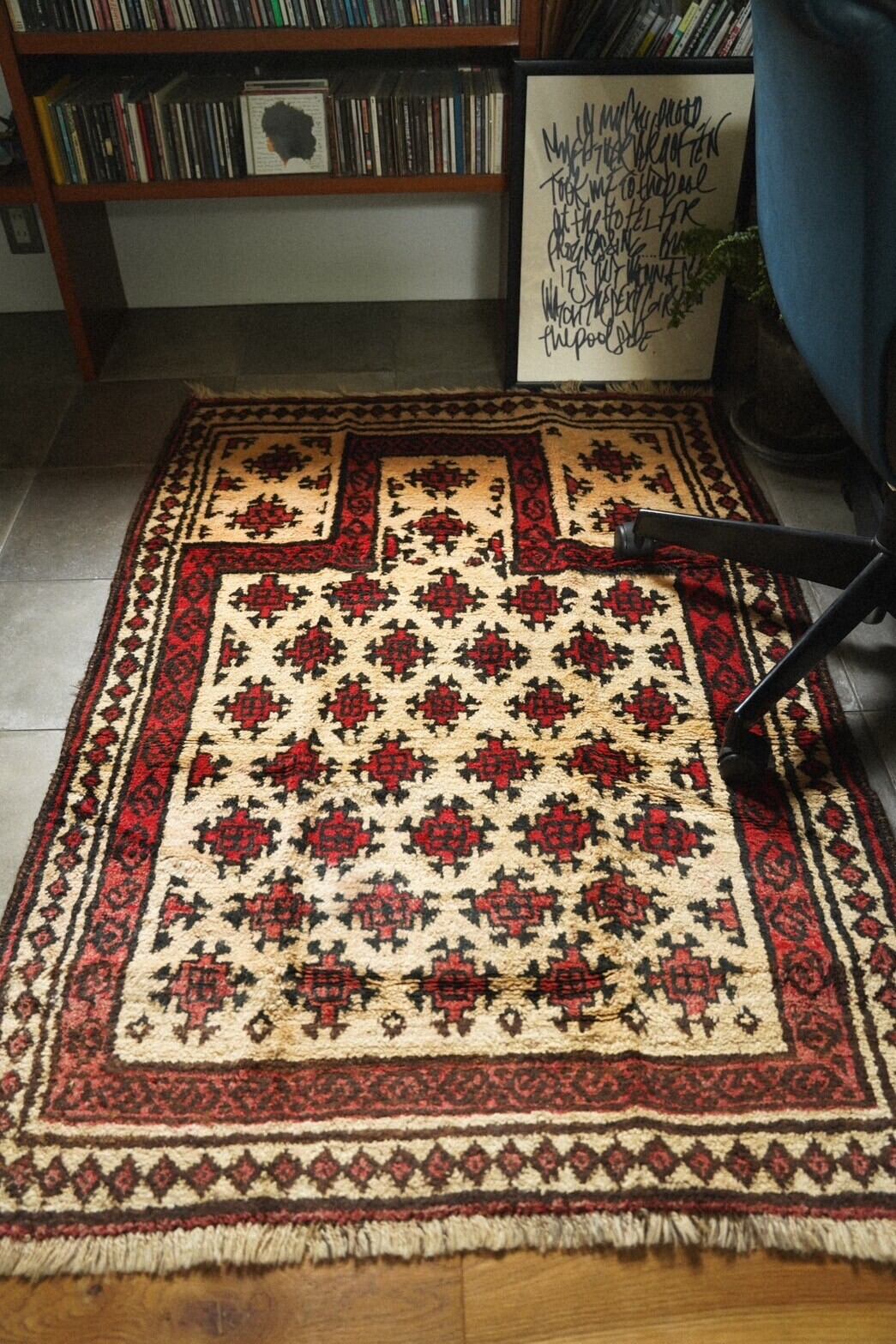 絵具で描いたようなぽってりとした線や途中で途切れたモチーフなど素朴で自由奔放な雰囲気のタイマニラグは緻密なペルシャ絨毯とはまた違った魅力があります。
