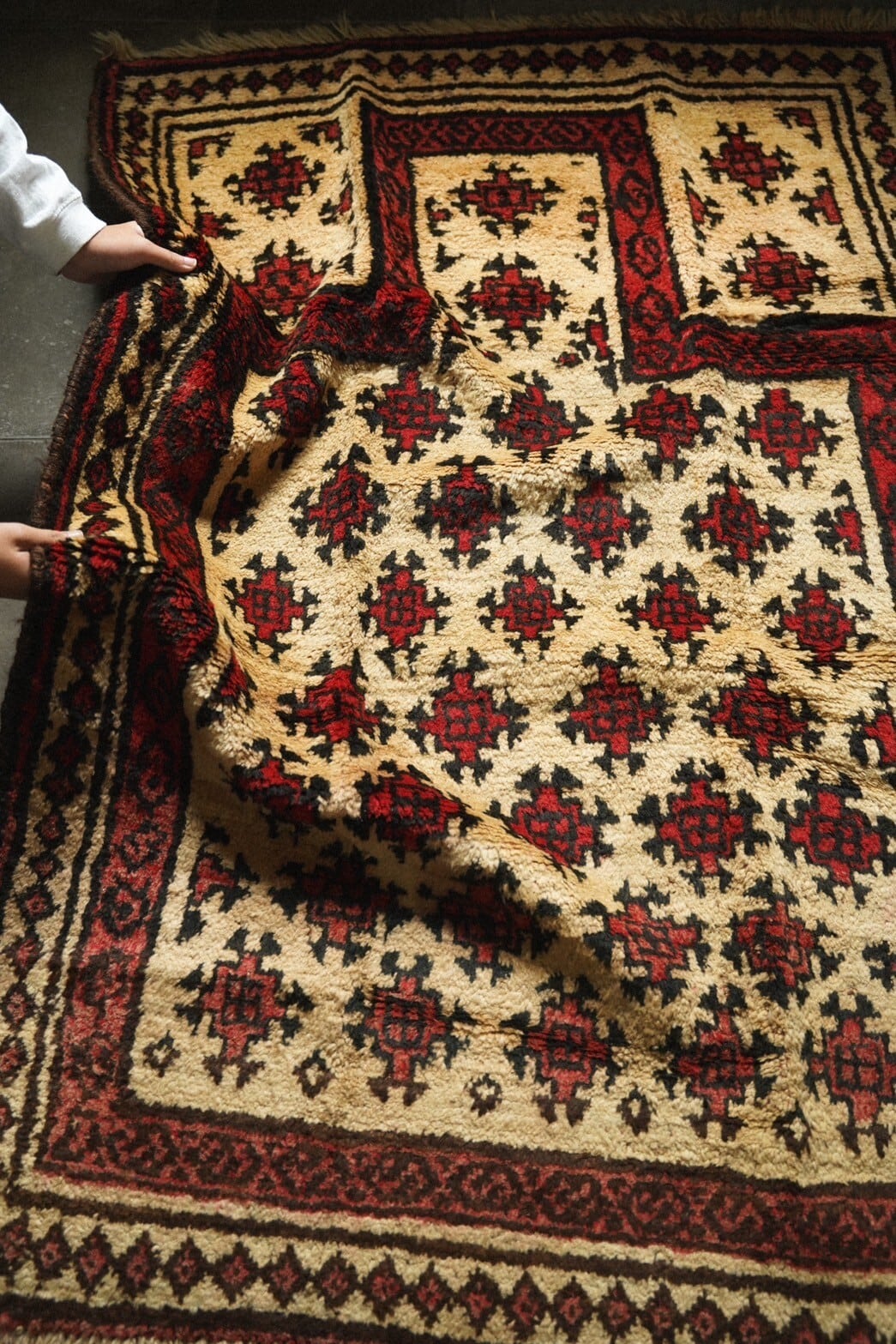 アイボリーとブラックの染色していない原毛色のウールをベースに、レッドのカラフルな色味をMIXしたとても可愛らしいタイマニラグ。ざっくりと織られたフカフカのパイルは長めタイプでこれからの寒い季節にもぴったりですね。