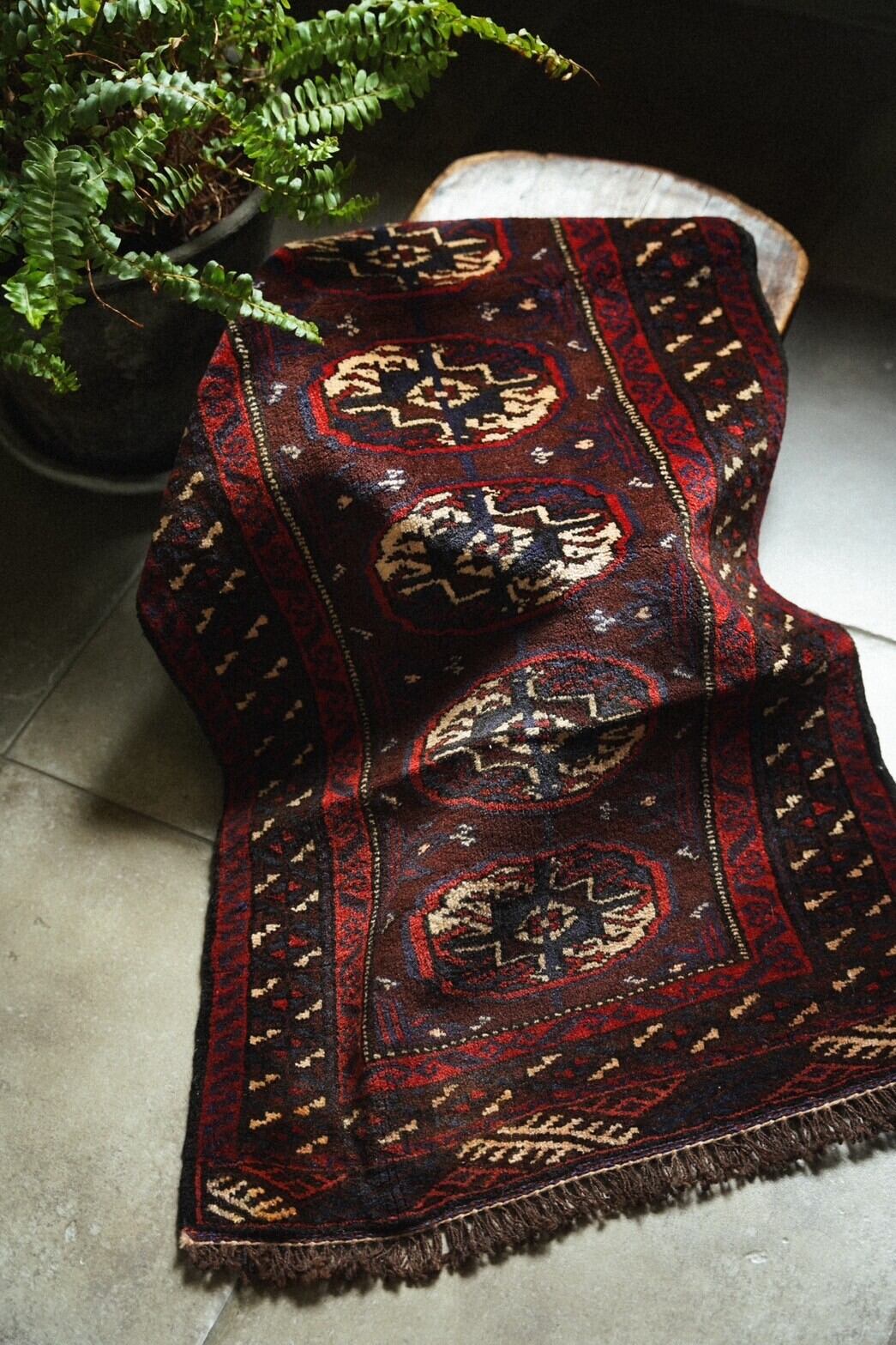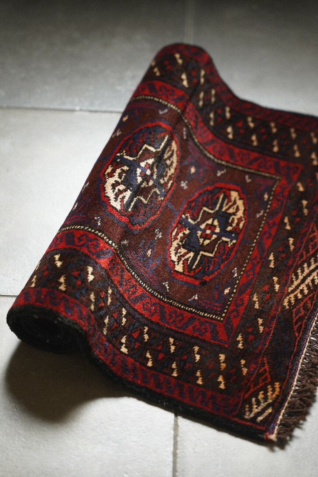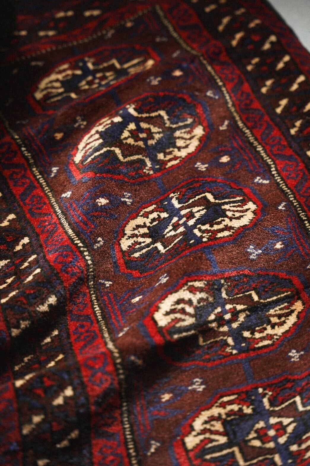 シックなボルドー系の深い色味で構成されたギュルが並ぶデザインのアフガン産トルクメンラグ。