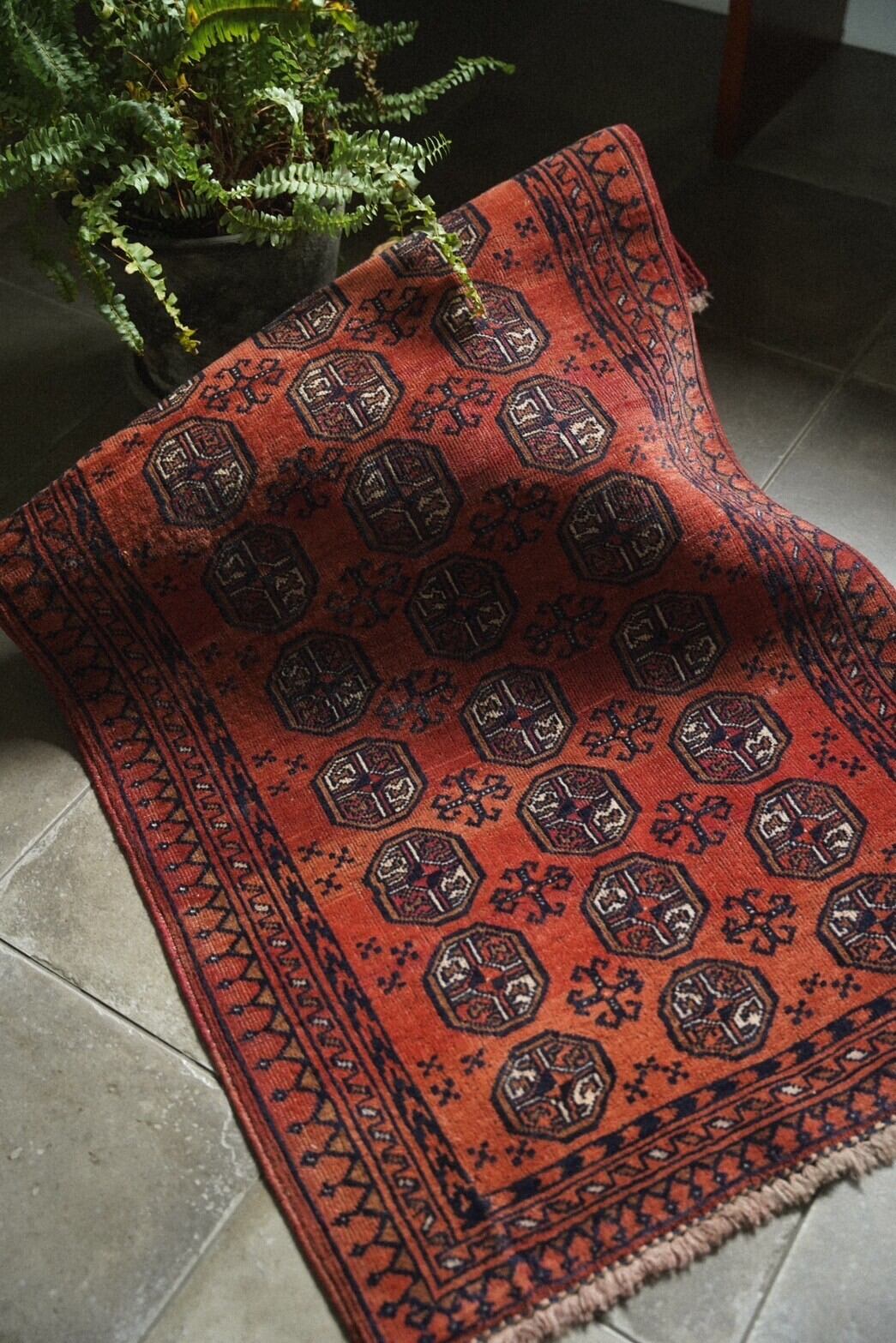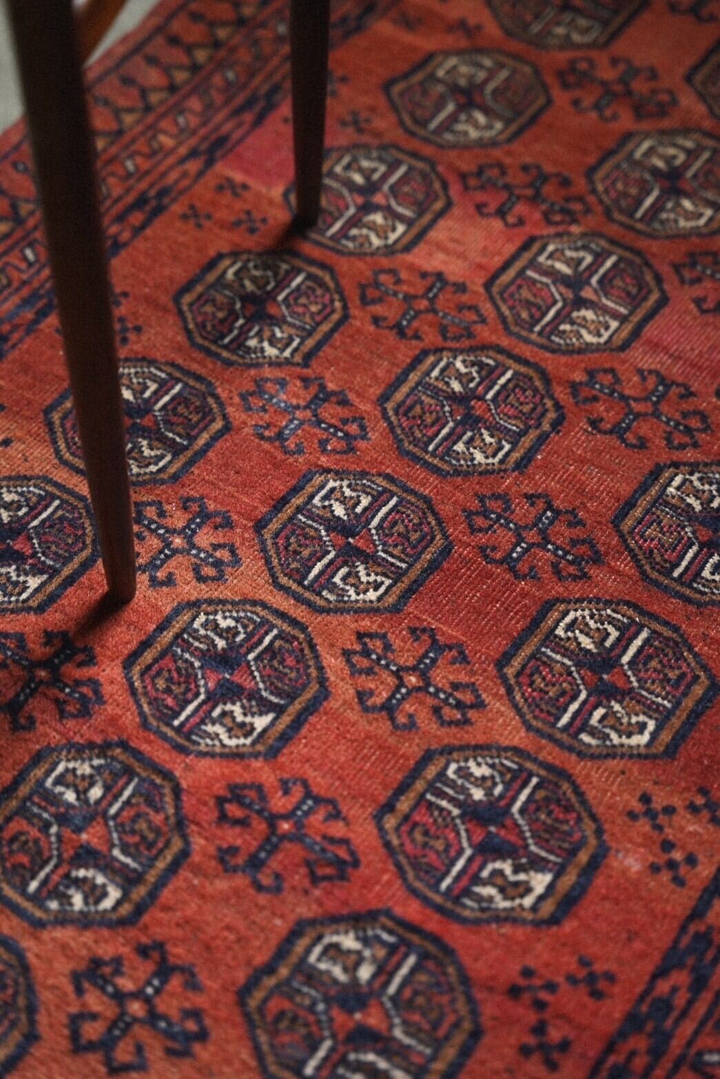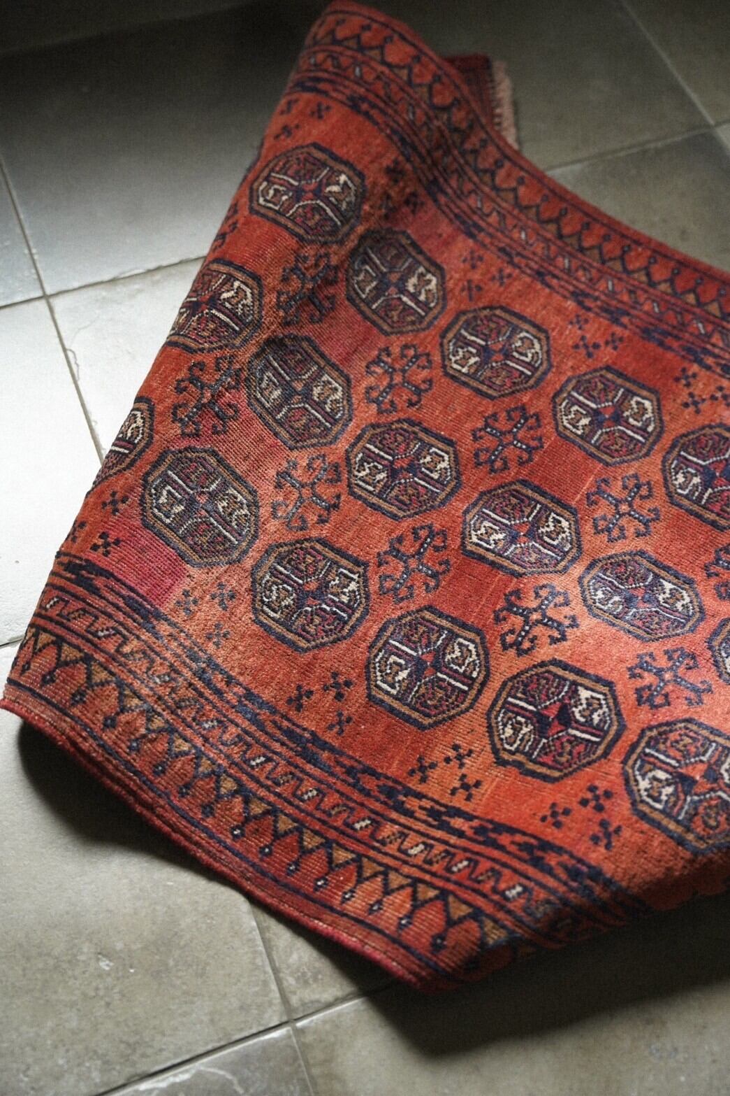 アブラッシュと呼ばれる夕焼け空の様な茜色のグラデーションが美しいトルクメンラグ。
