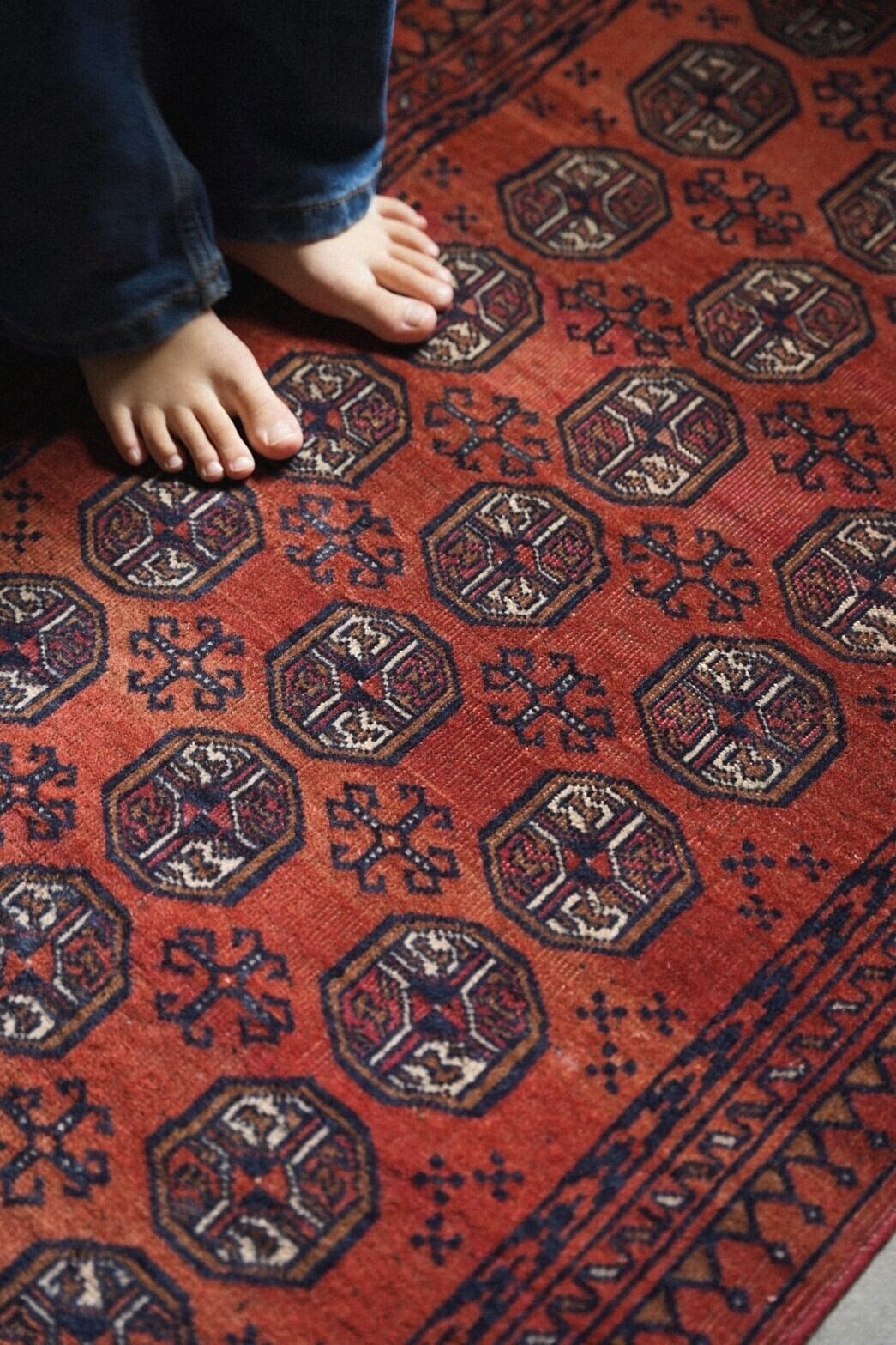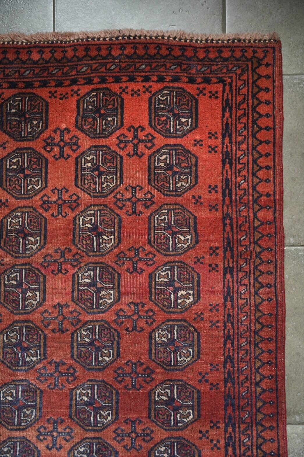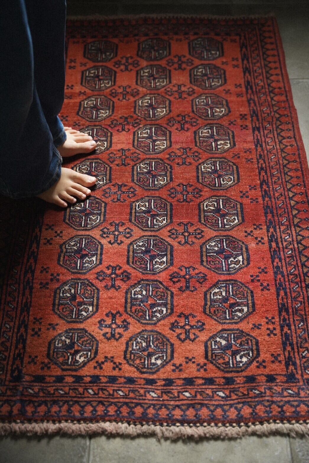 アブラッシュと呼ばれる夕焼け空の様な茜色のグラデーションが美しいトルクメンラグ。