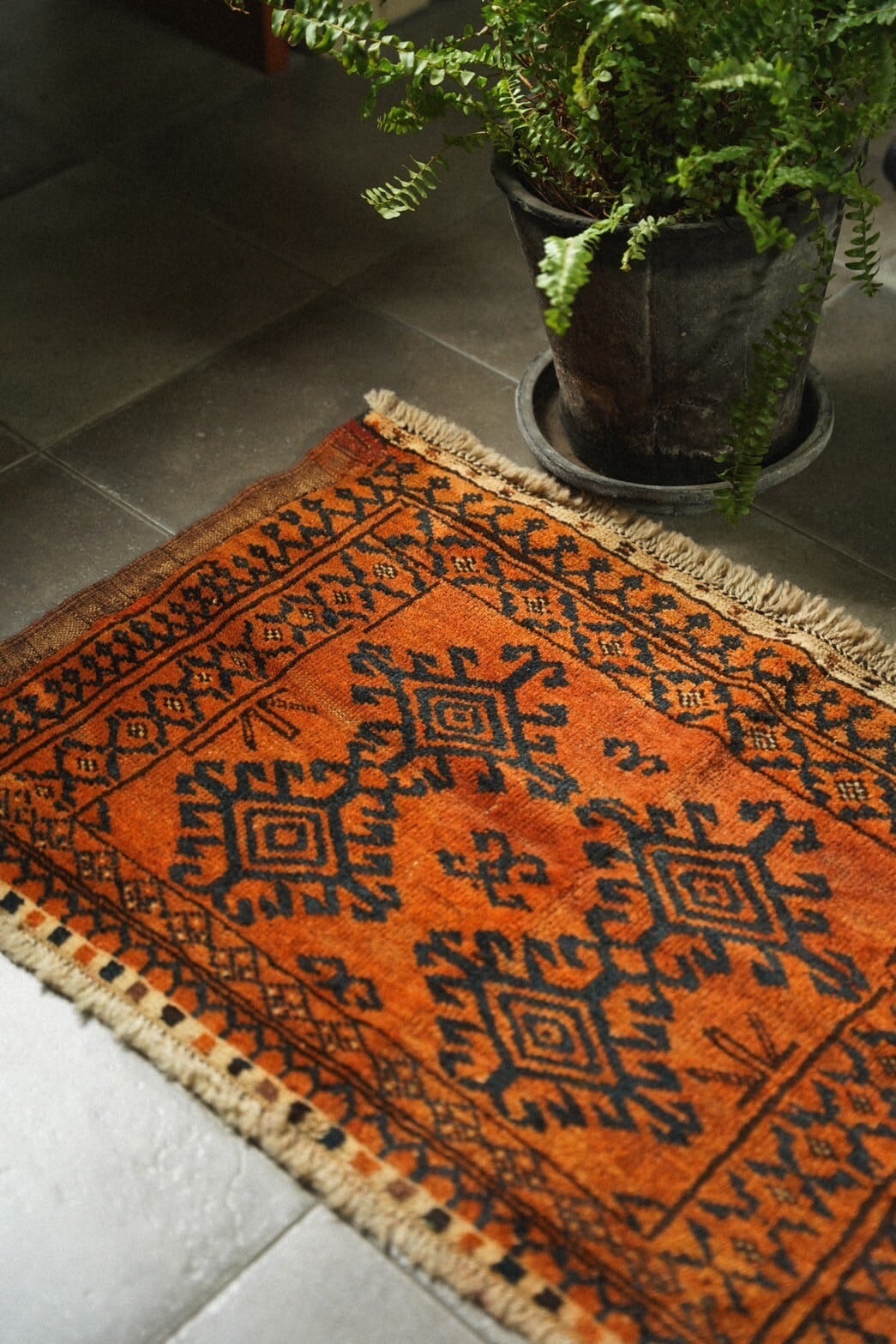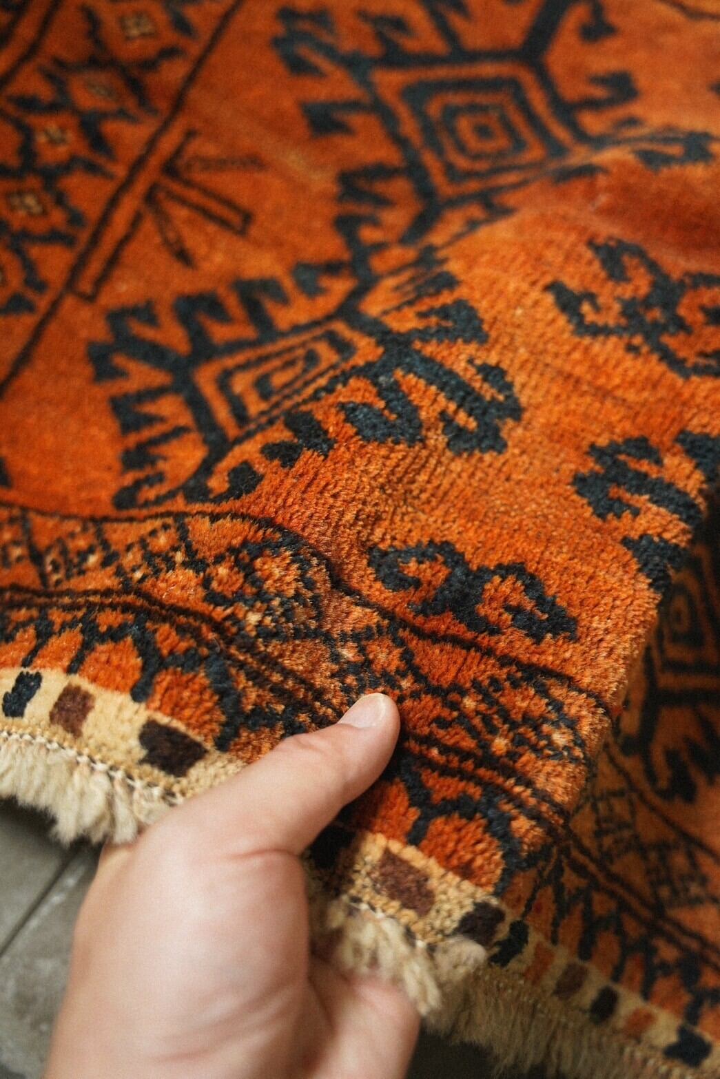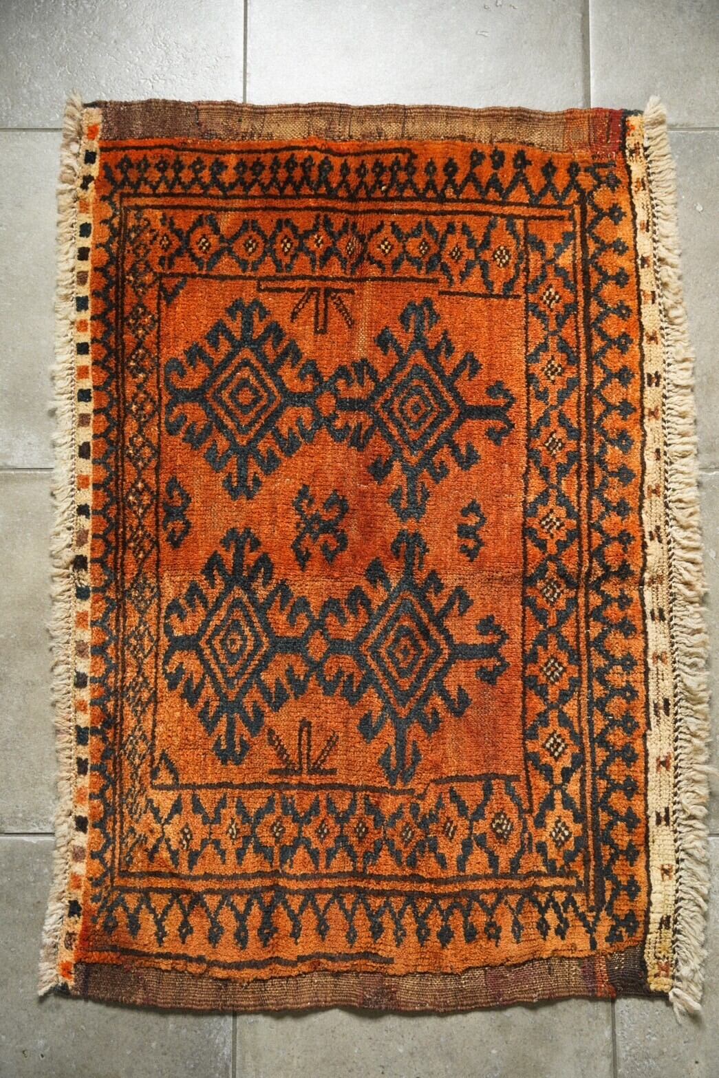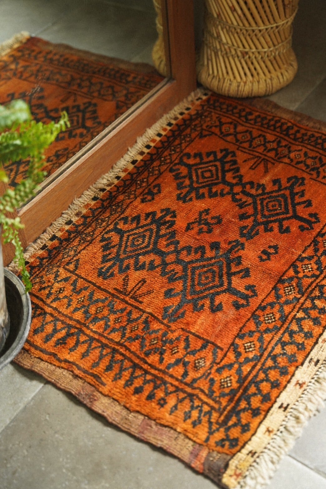 経年により元は茜色だったウールが深みのあるテラコッタ色になっており古いラグならではの魅力があります。