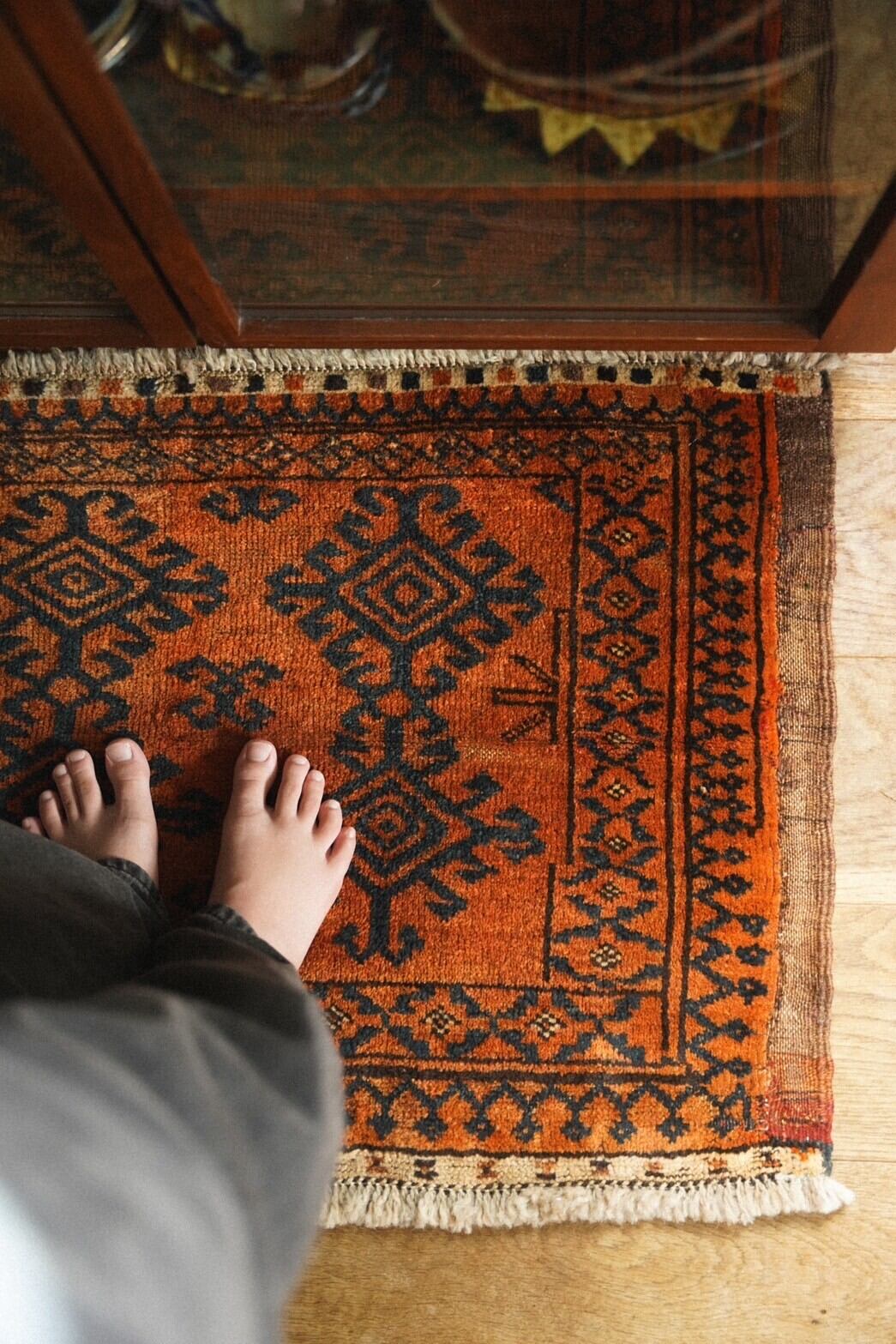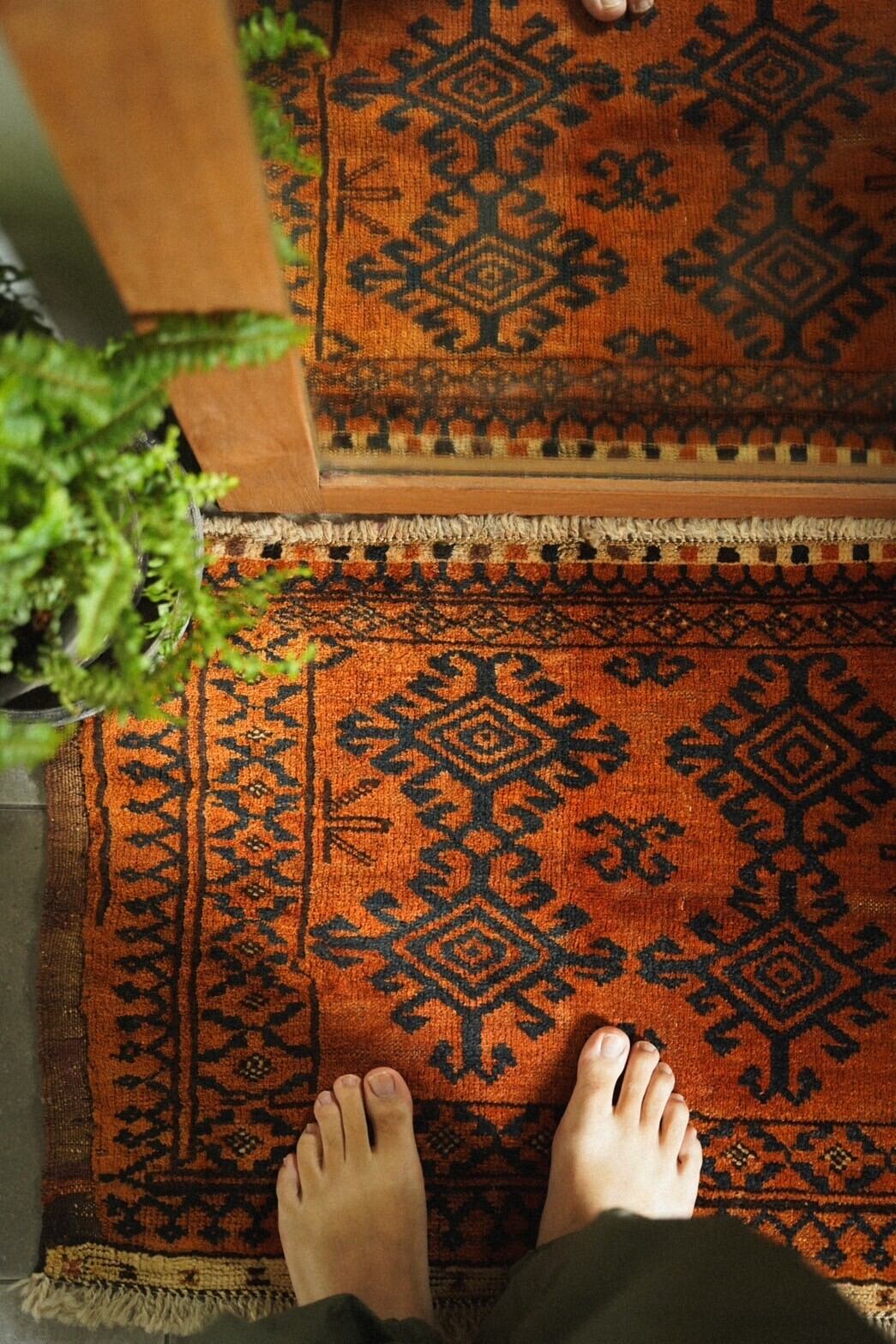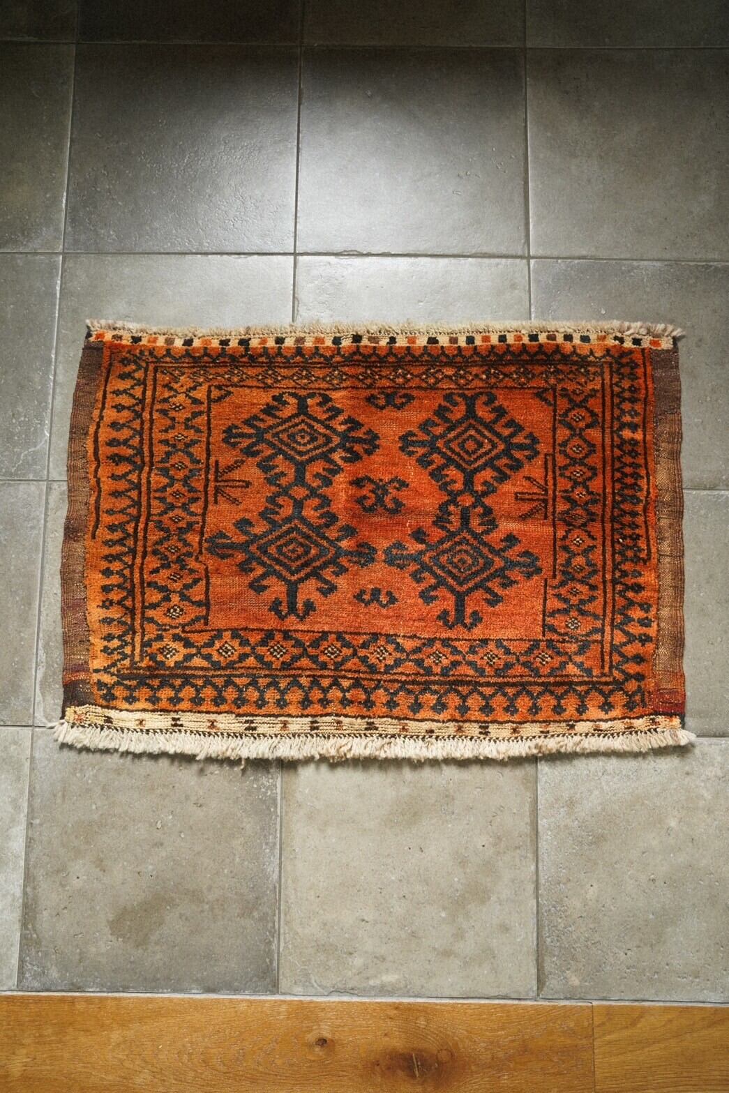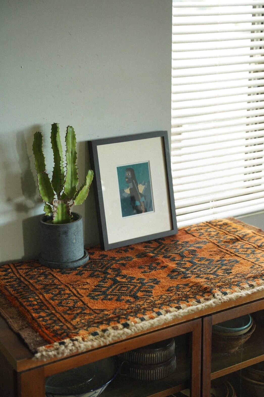 経年により元は茜色だったウールが深みのあるテラコッタ色になっており古いラグならではの魅力があります。