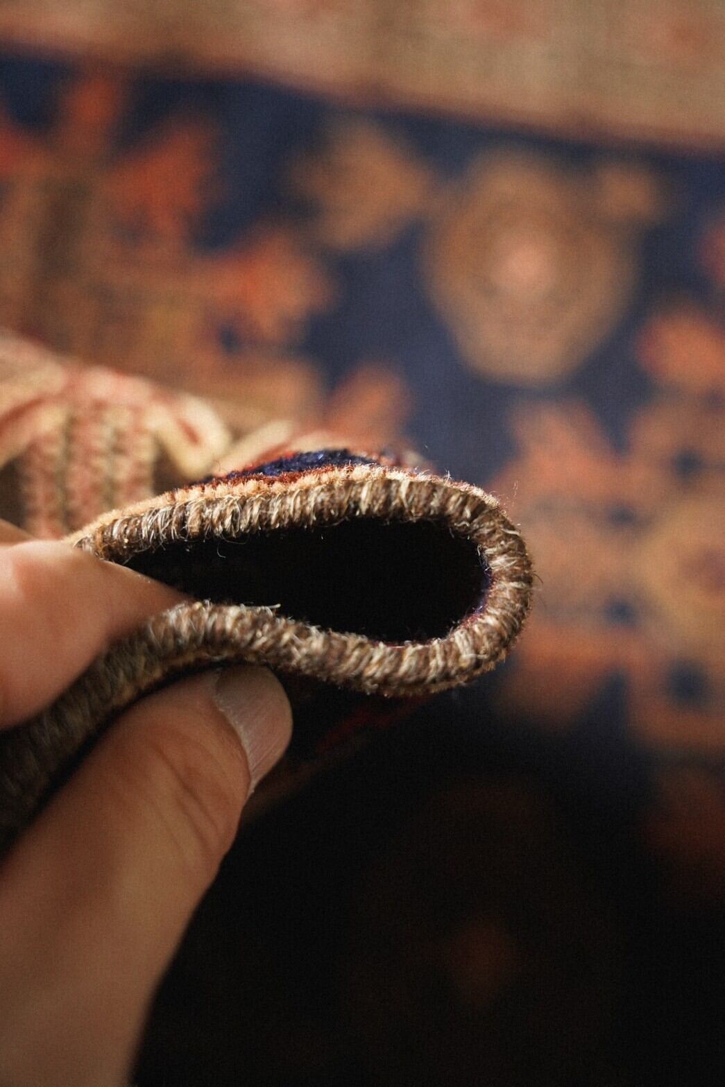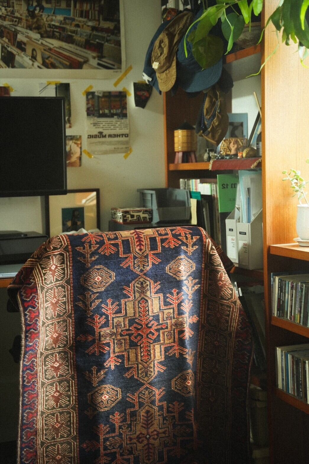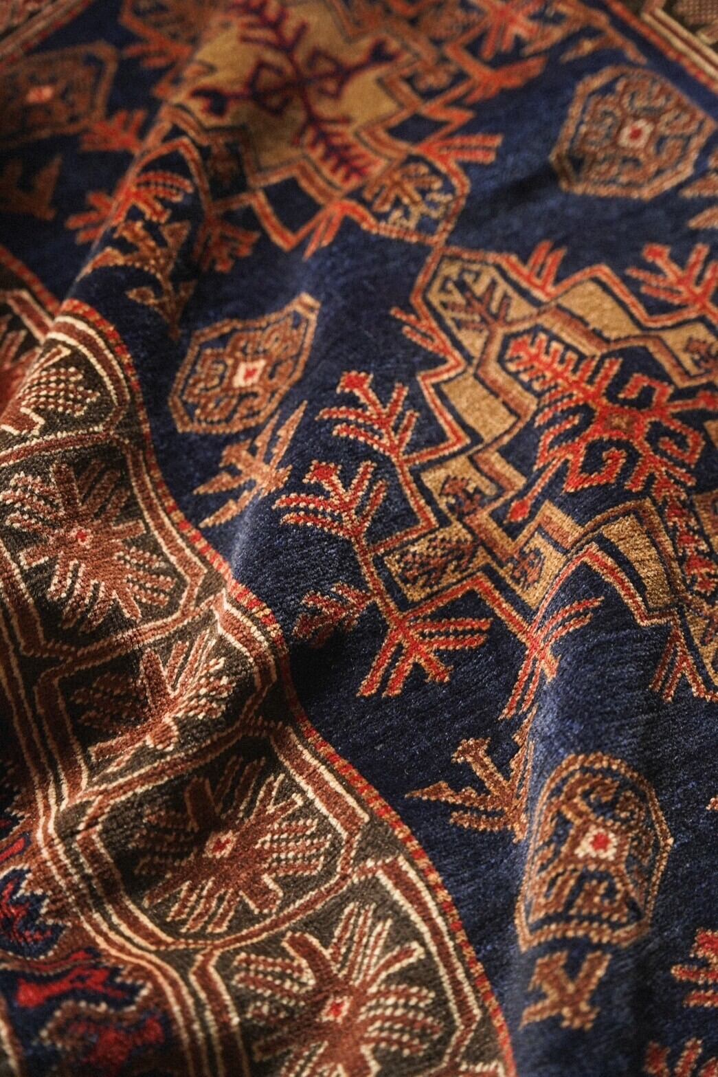 ネイビーベースにブラウン、ベージュ、レッド、ボルドーのシックな色使いと、艶のある美しいウールで織られた手触りの良さが魅力的な一枚。