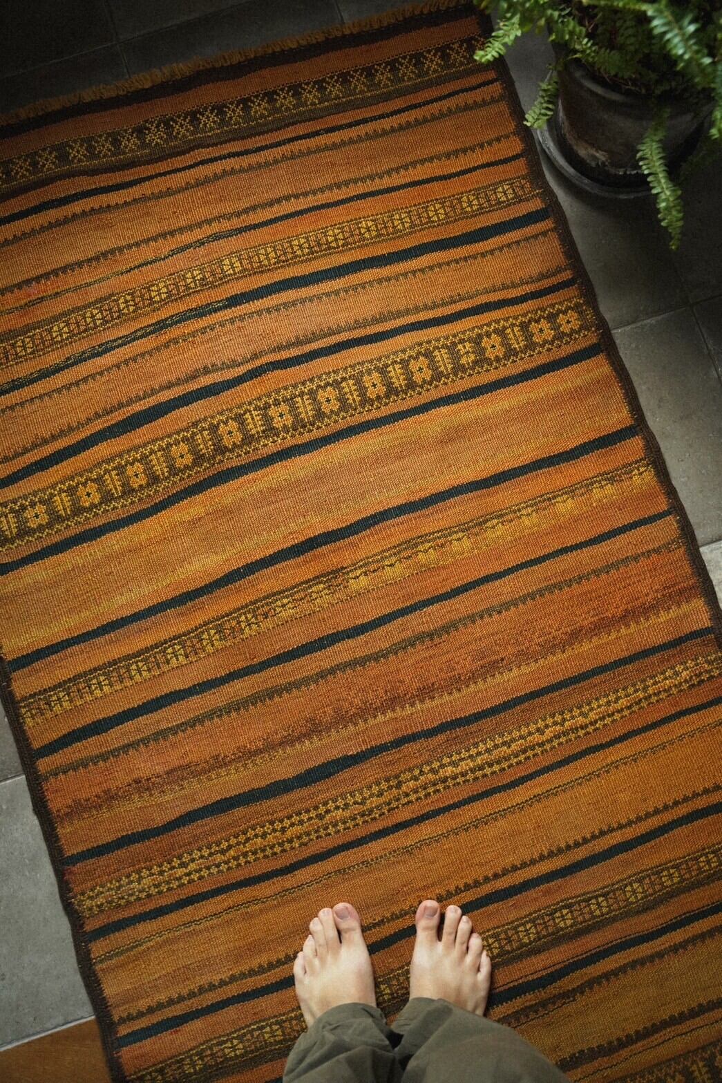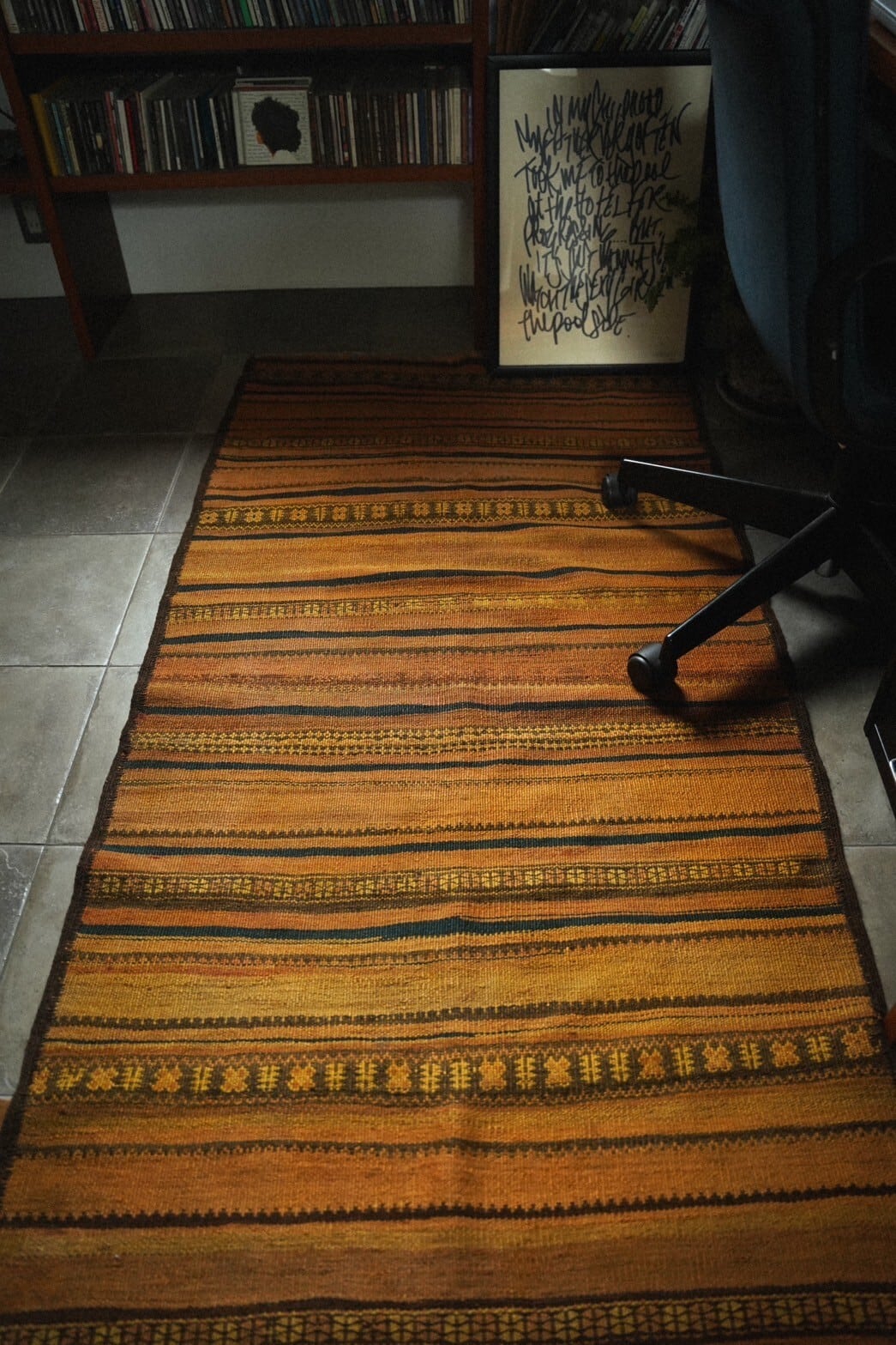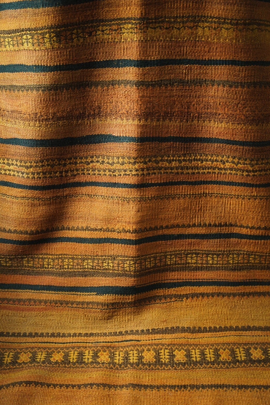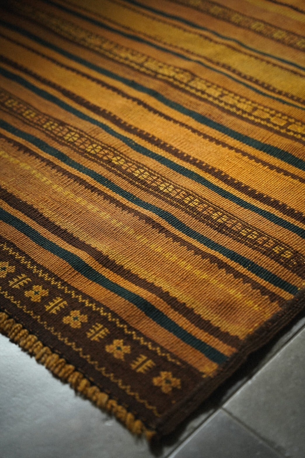 砂漠を思わせる乾いた色味や空気感を纏ったマスタードカラーのキリムはどこに敷いてもサマになるかっこいい佇まい。