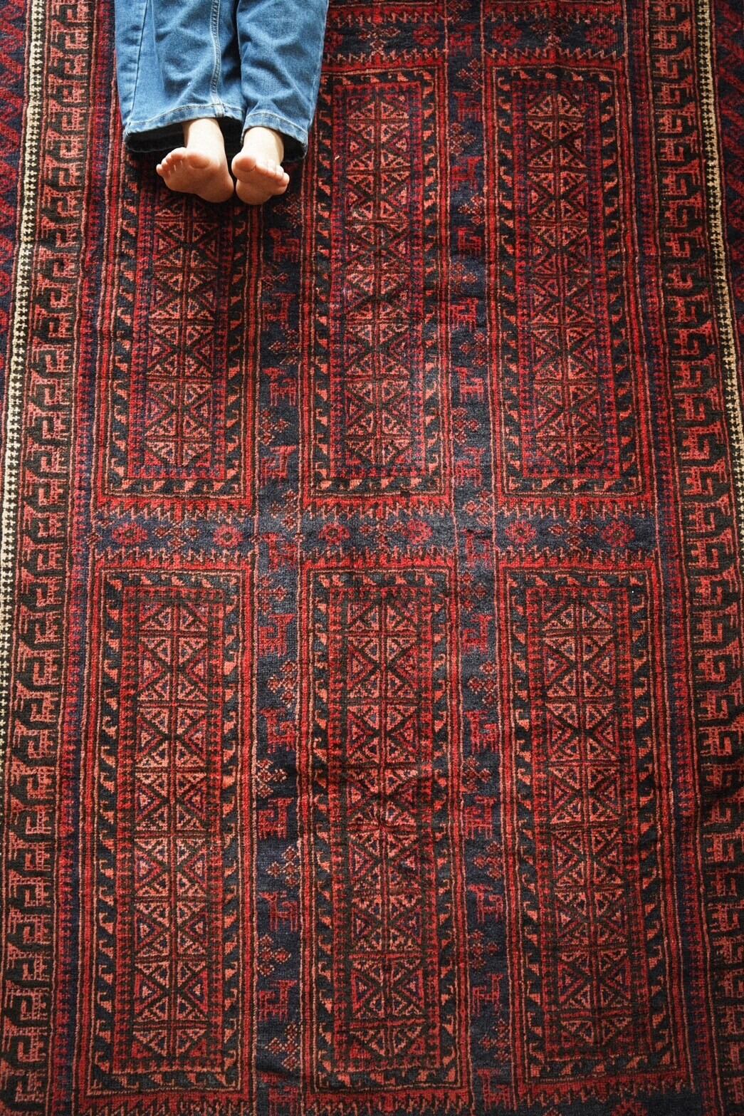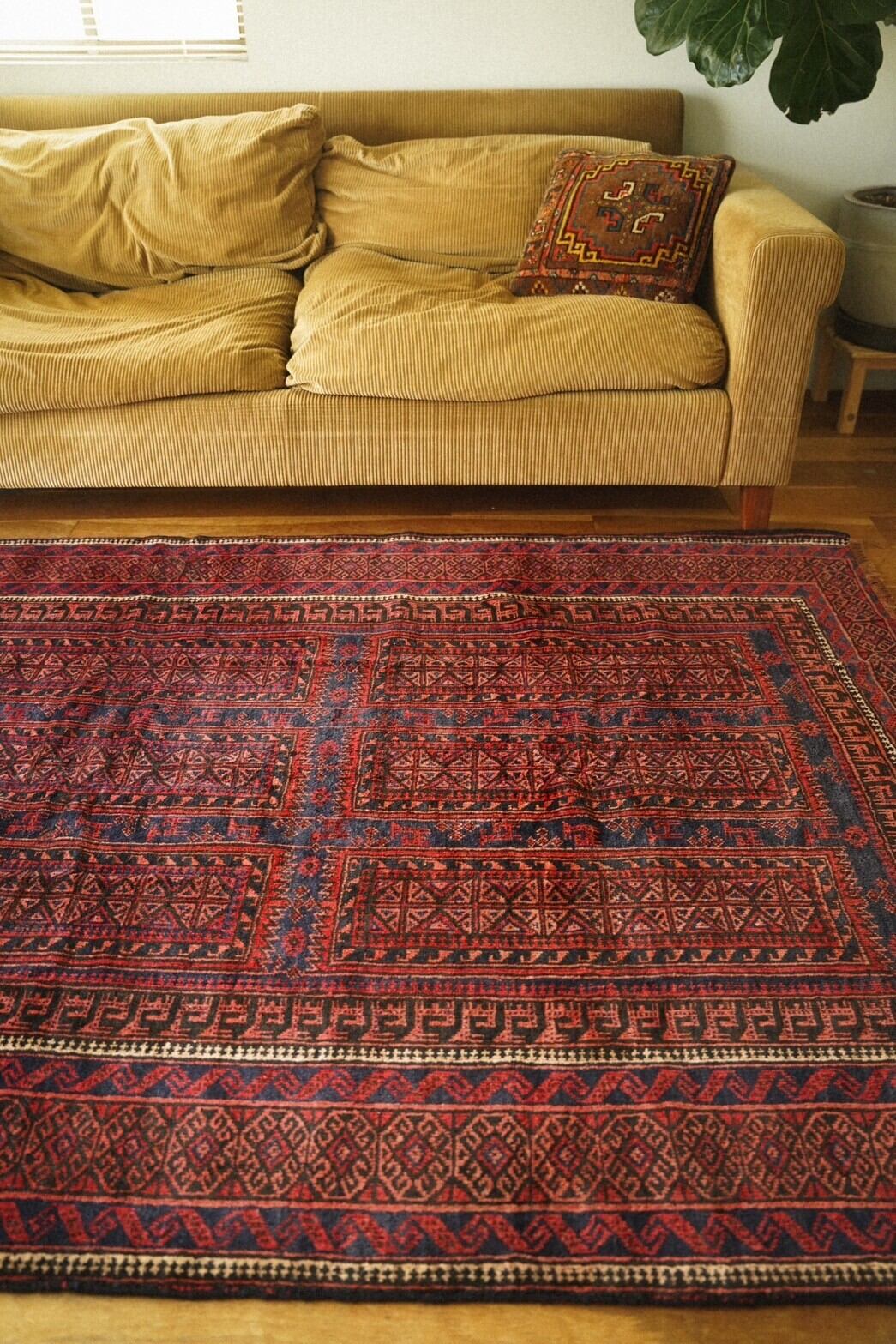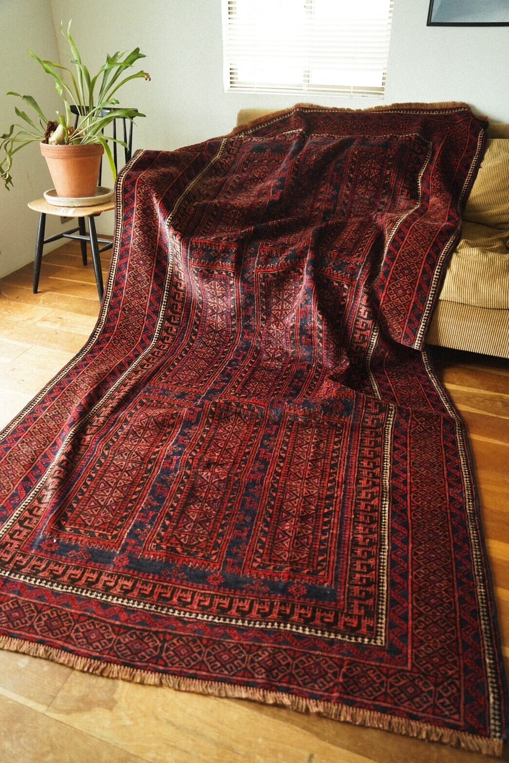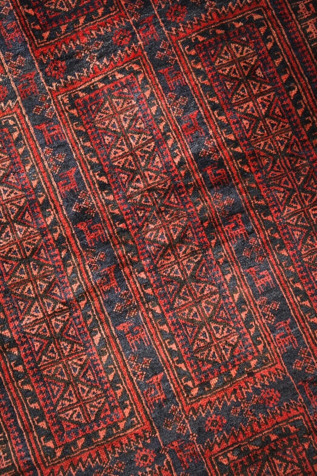 ネイビー×レッドのシンプルな配色に細かいモチーフがたくさん描かれているyaqub khaniの代表的なデザインのバルーチラグ。