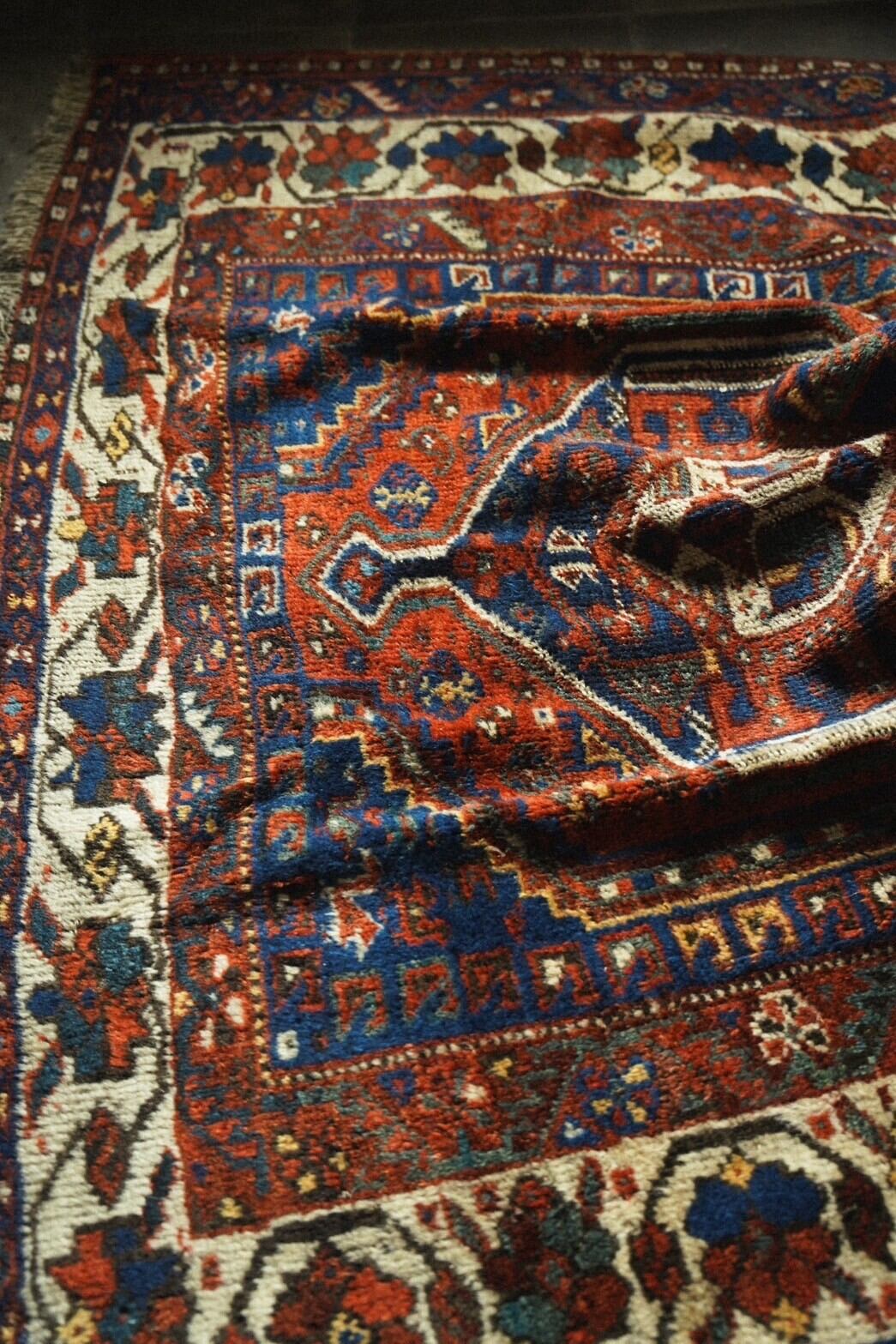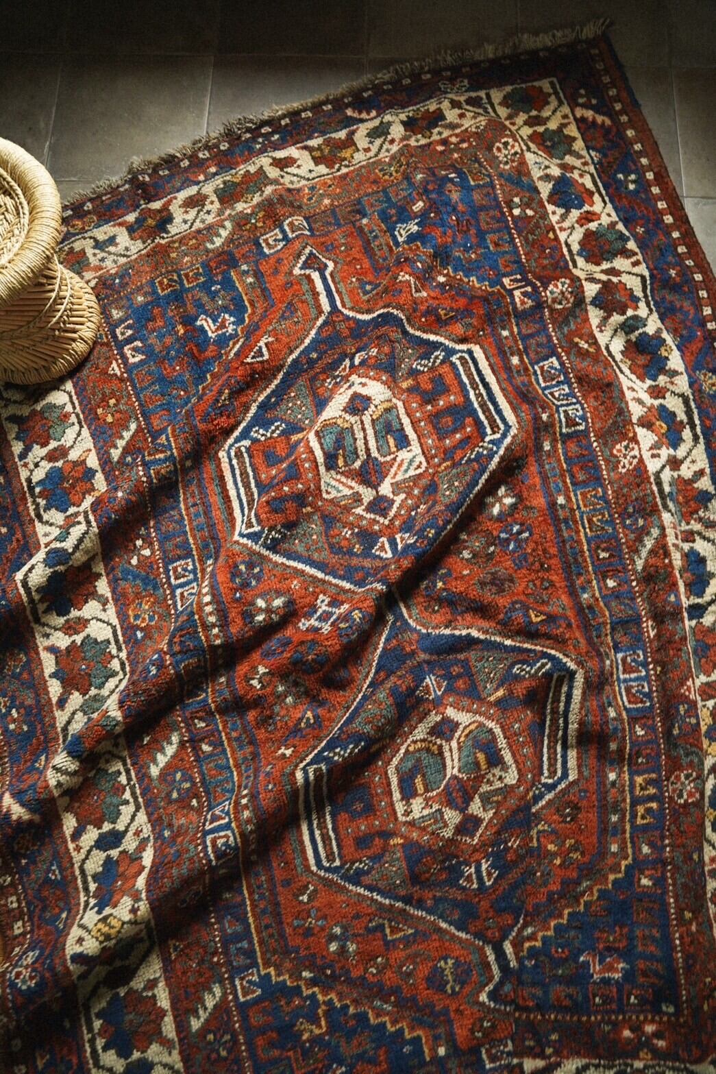 深みのある朱赤のフィールドとメダリオンやコーナー部分の吸い込まれるようなインディゴブルーのコントラストがとても美しいカシュガイラグ。