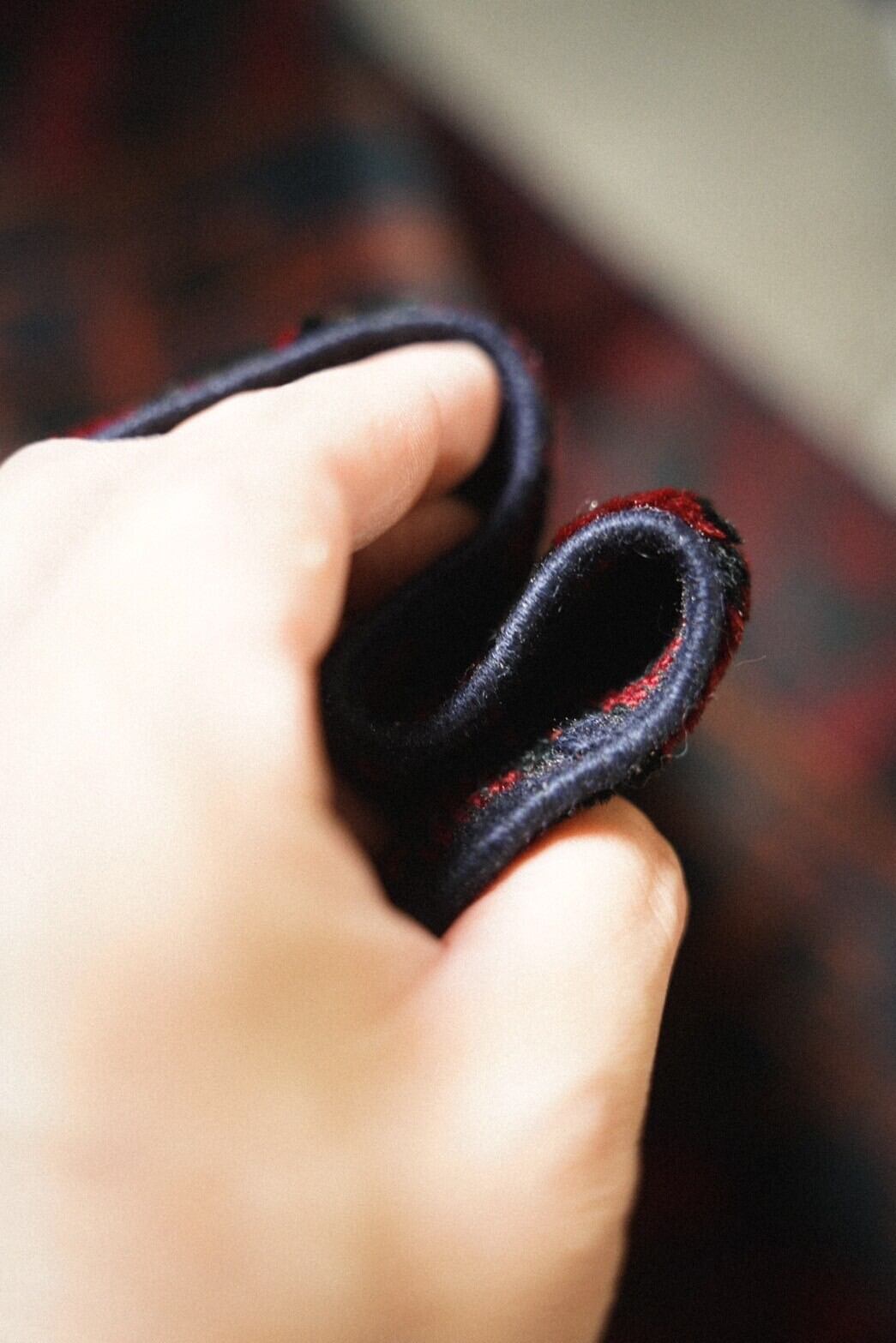 ネイビー×レッドがベースカラーの落ち着いたトーンにチナール紋様が描かれたデザイン。