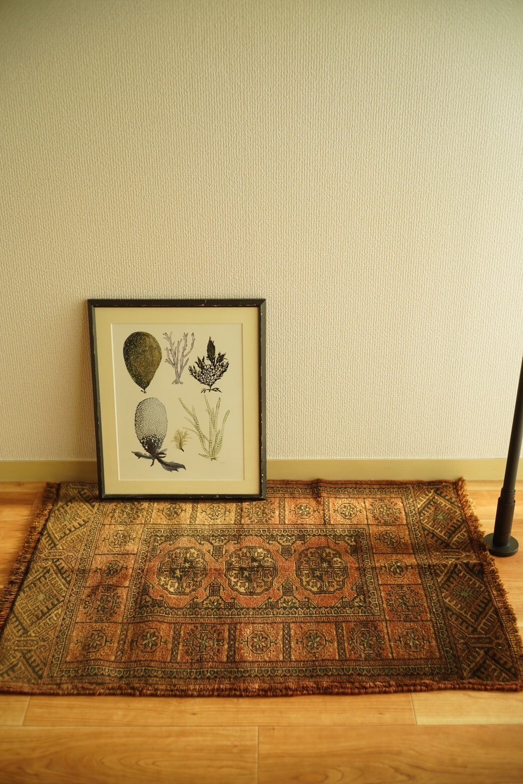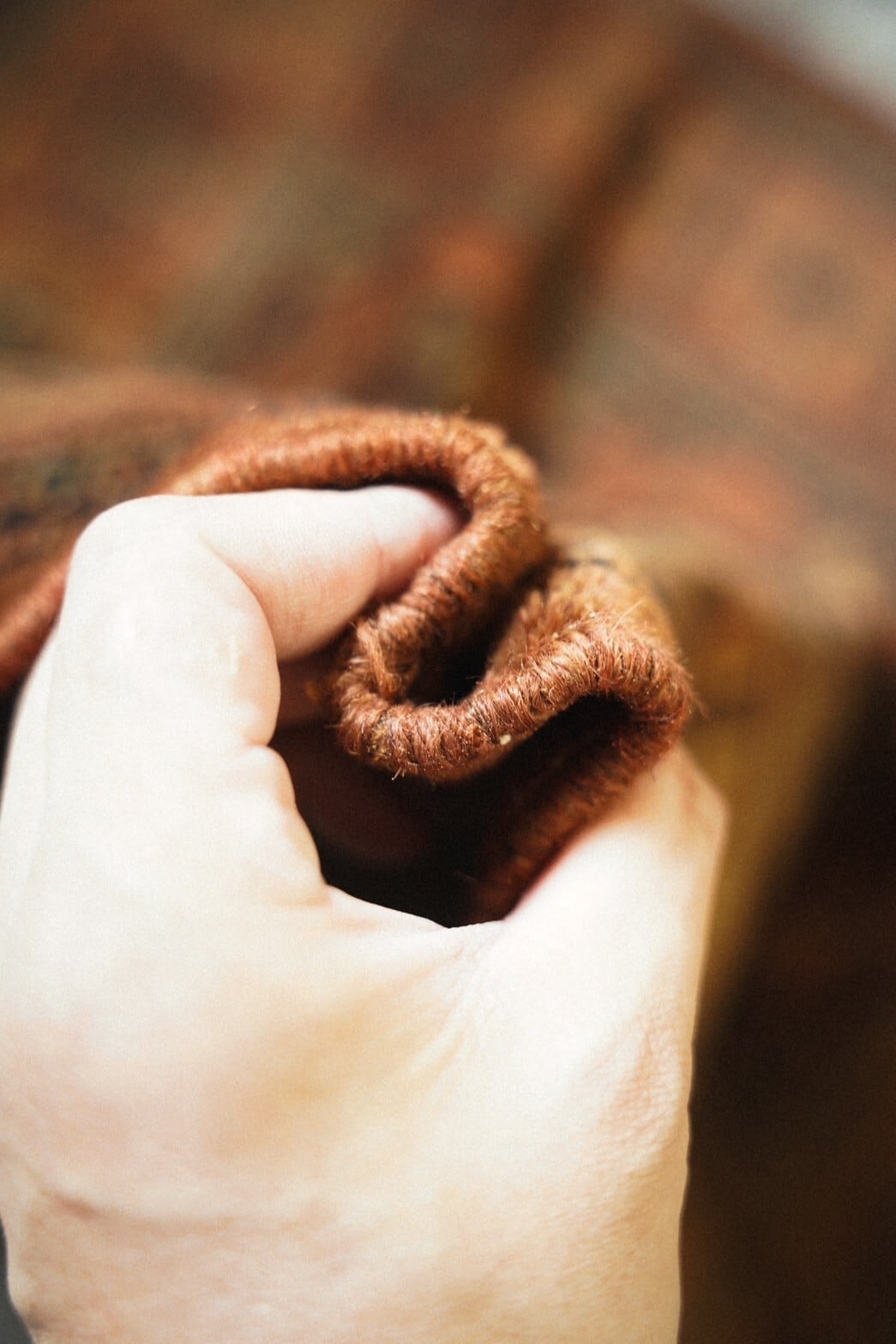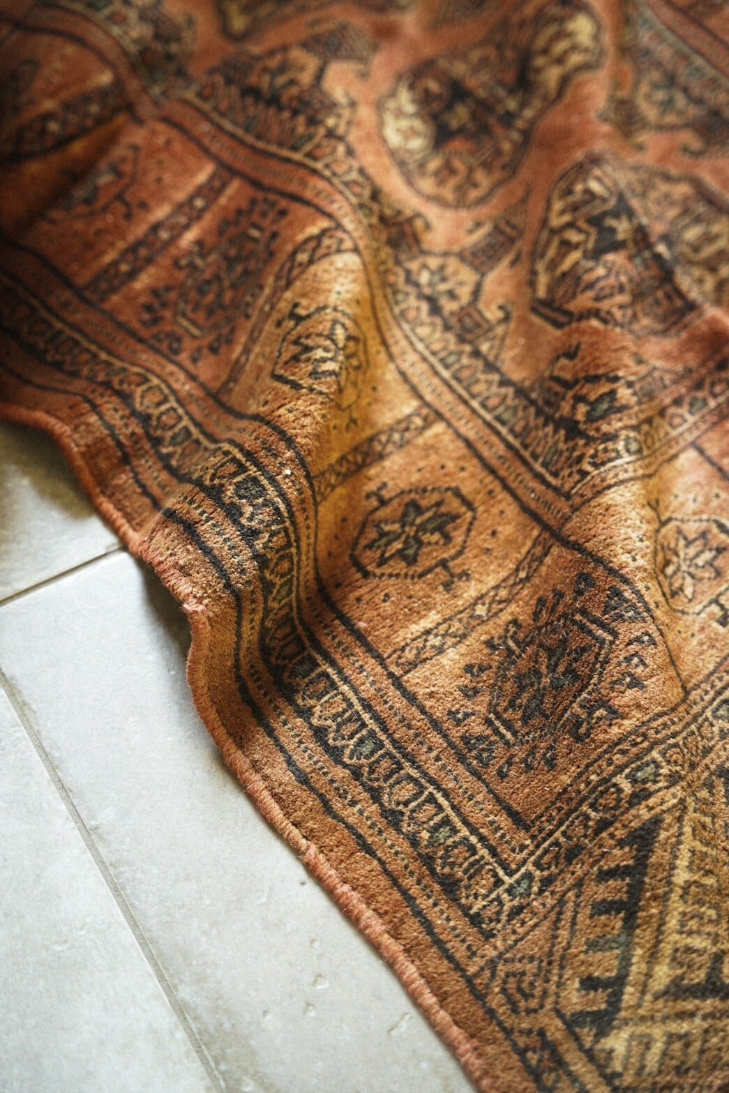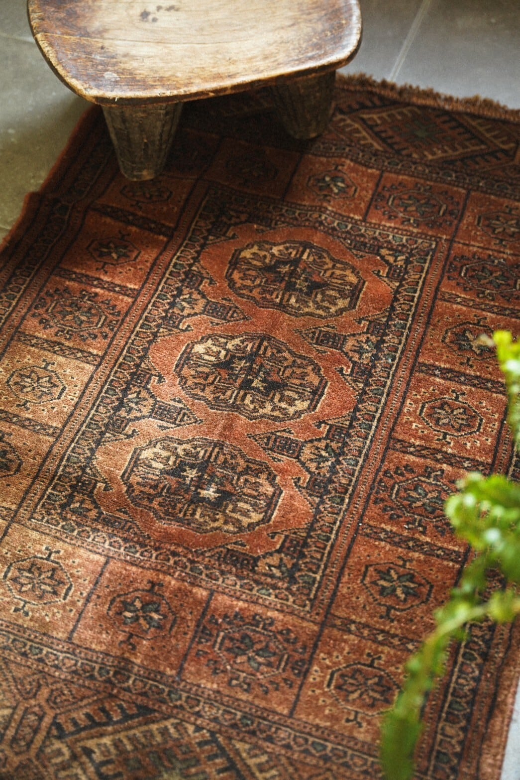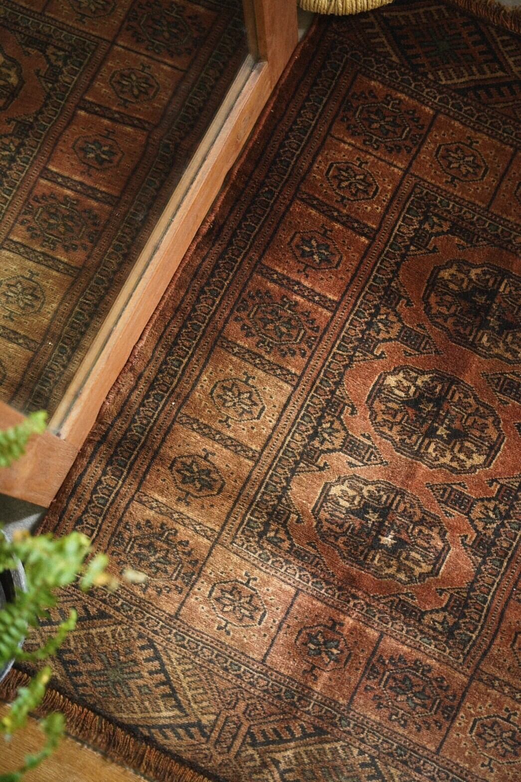 艶が美しいテラコッタカラーのラグは小さいサイズながら気品のある佇まい。