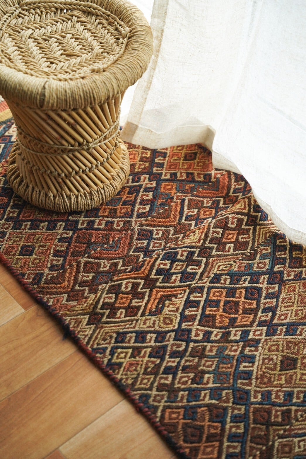 ジジムと呼ばれる手法で織られたキリムは一見刺繍のようにも見える立体感のある作りで、高度な技術を用いた素晴らしい手仕事です。