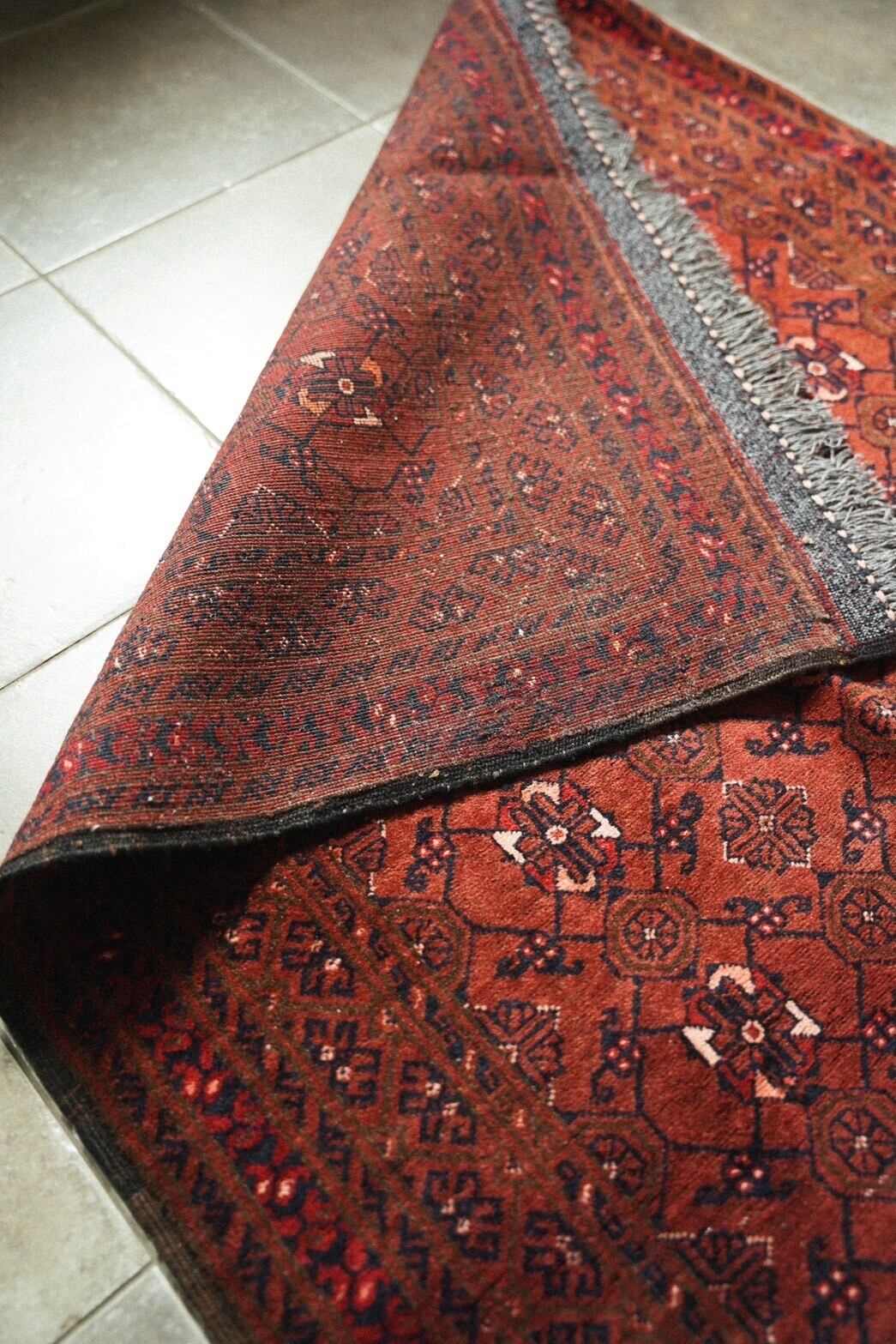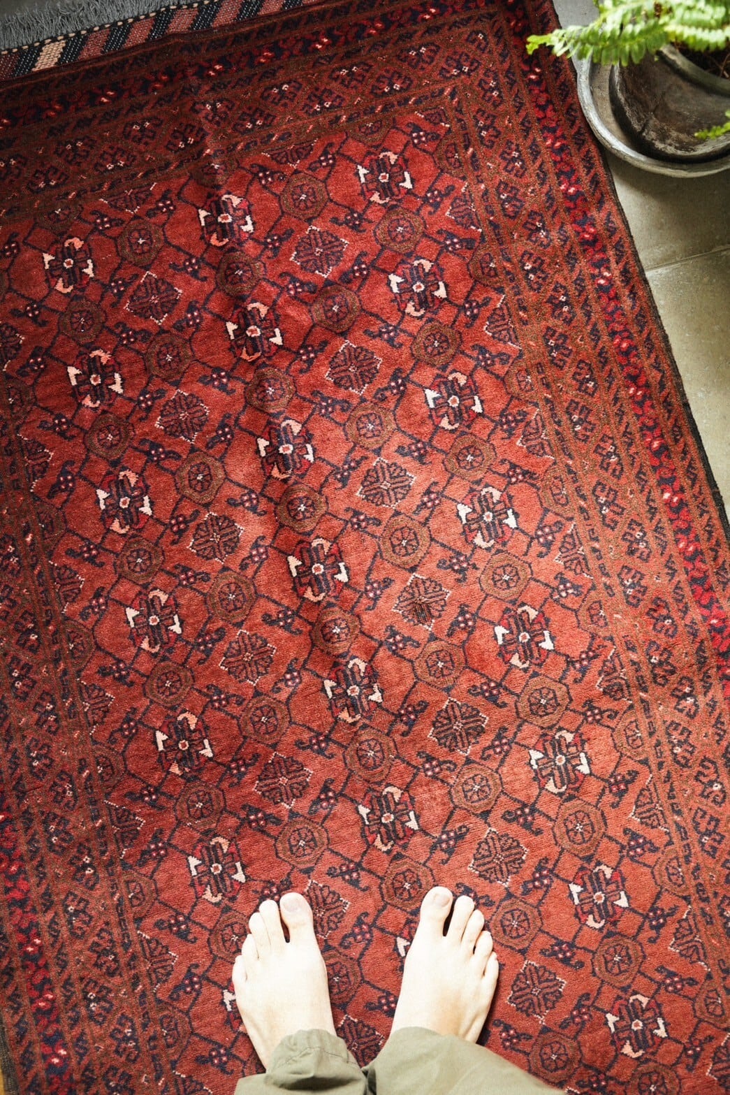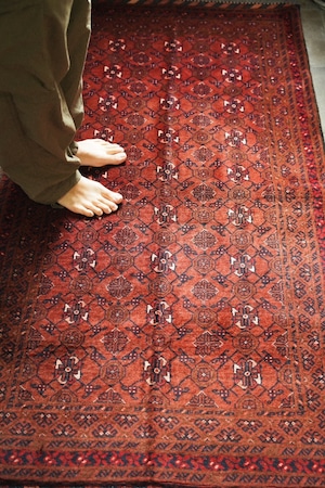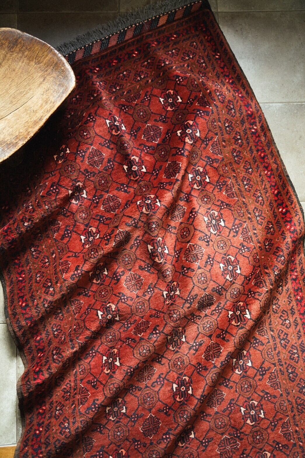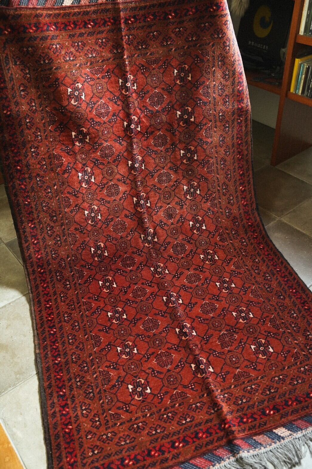 深みのある美しいトルクメンレッドに並ぶ花紋様がとても可愛らしいです。