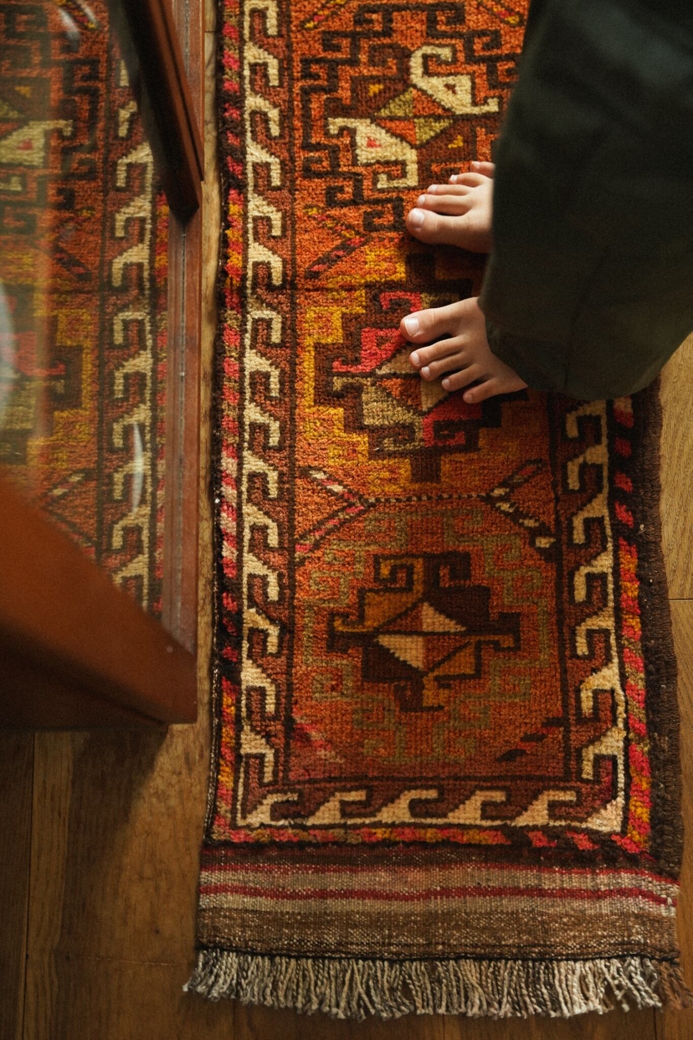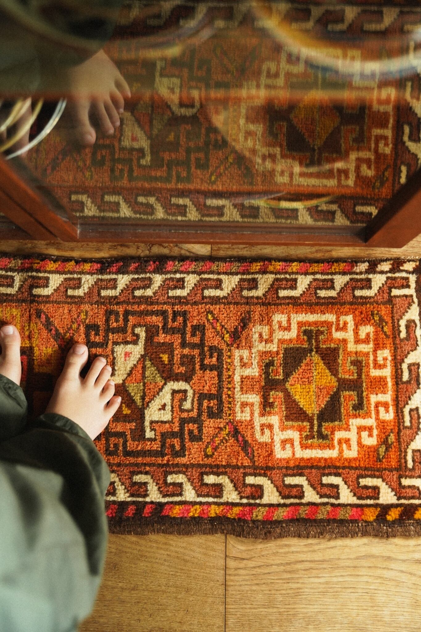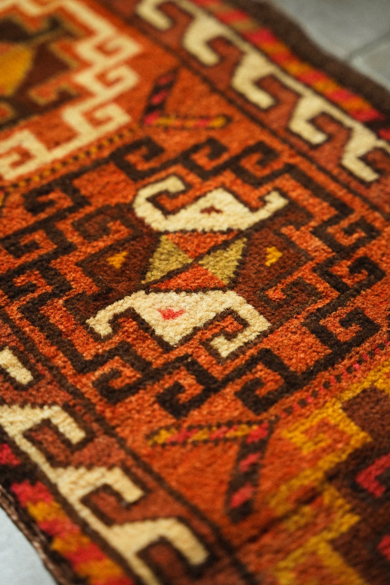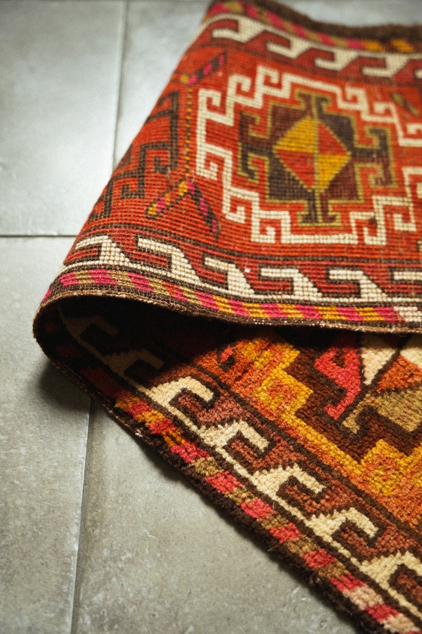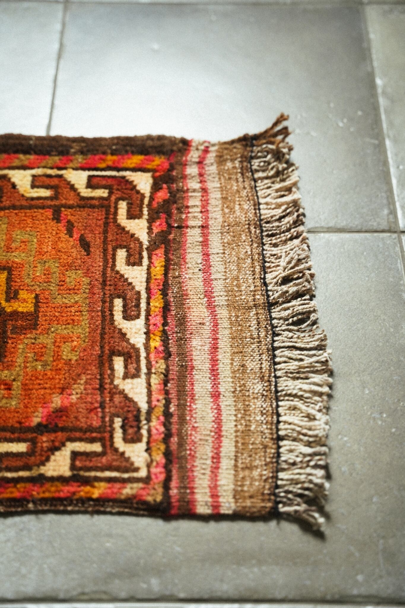 柔らかいウールで織られており、フカフカで程よい厚みがあるので床の冷たさを通しません。オレンジやマスタード、レッドなど元気の出そうなビタミンカラーが可愛い一枚。
