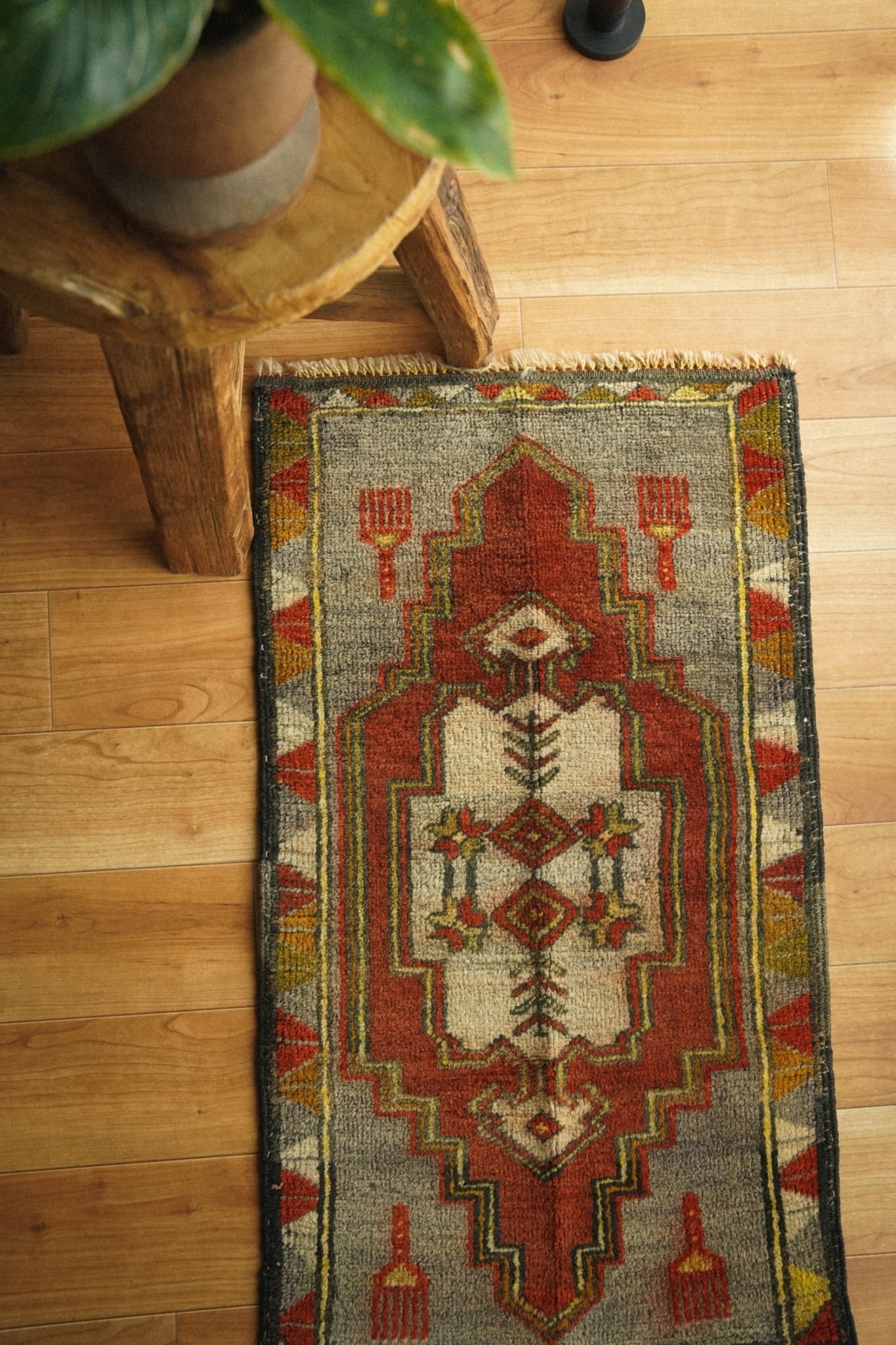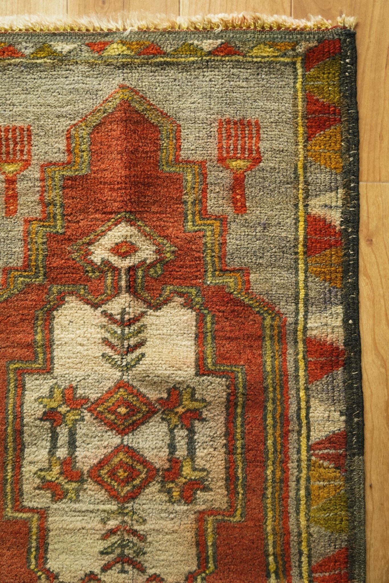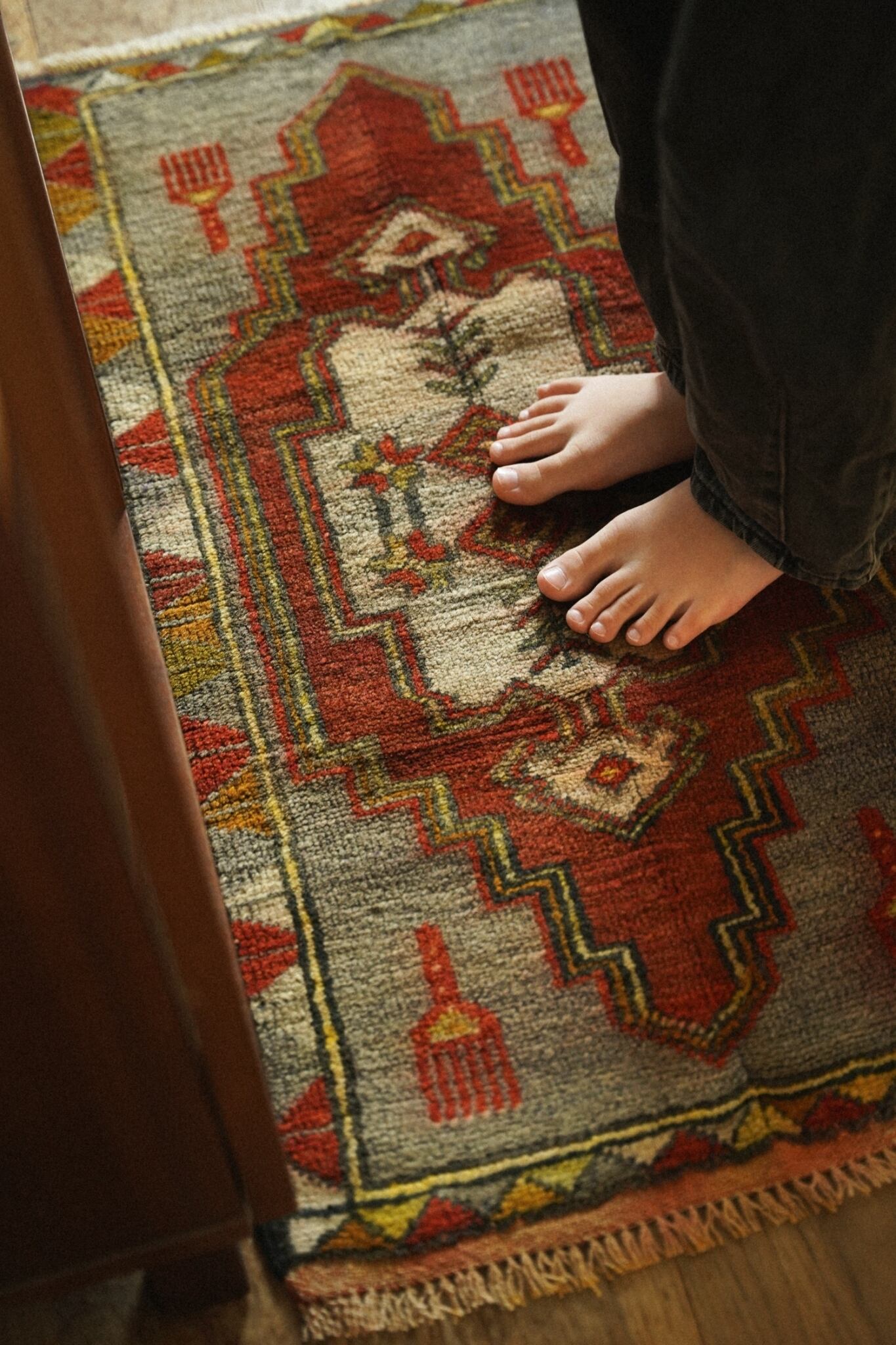 エネルギッシュな力強さを感じるメダリオンの赤とスモーキなブルーグレーをベースカラーに絶妙な色使いがとても可愛いラグ。