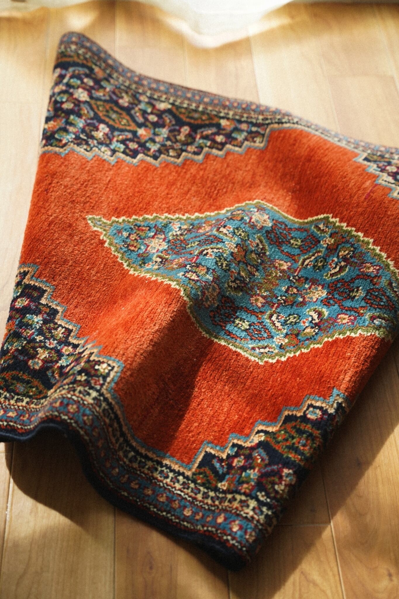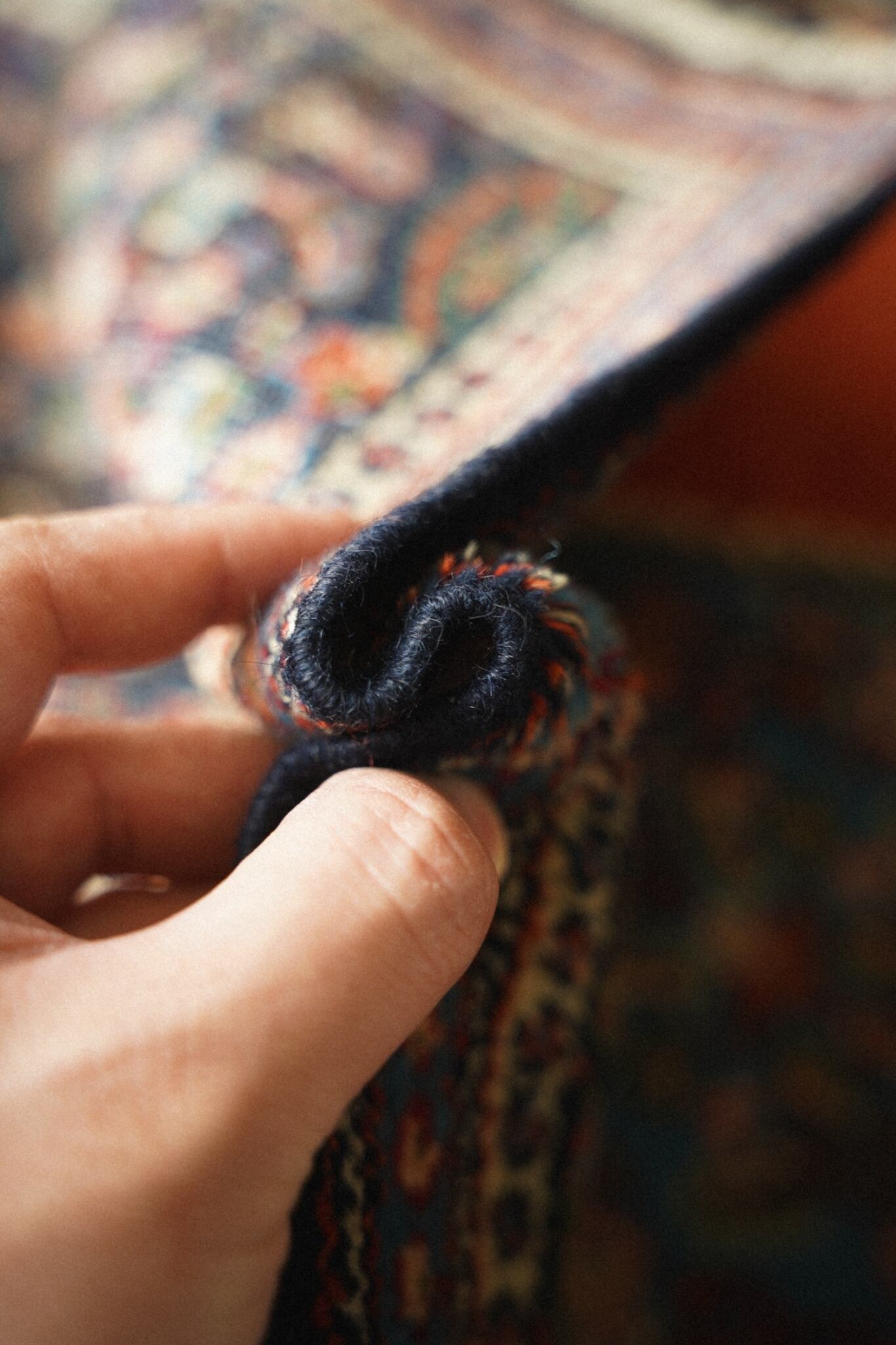 真ん中にはダイヤの様に輝くブルーのメダリオン。そしてコーナーやボーダーには美しい色彩で表現されたフローラルモチーフのヘラティ文様が描かれています。