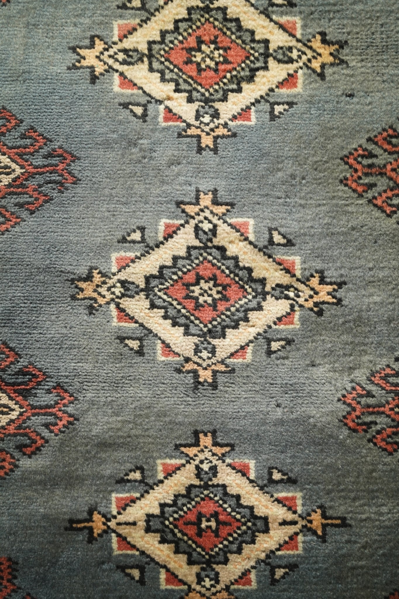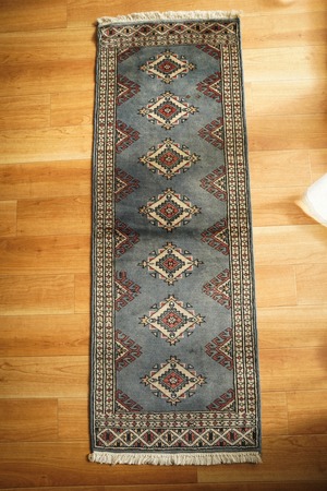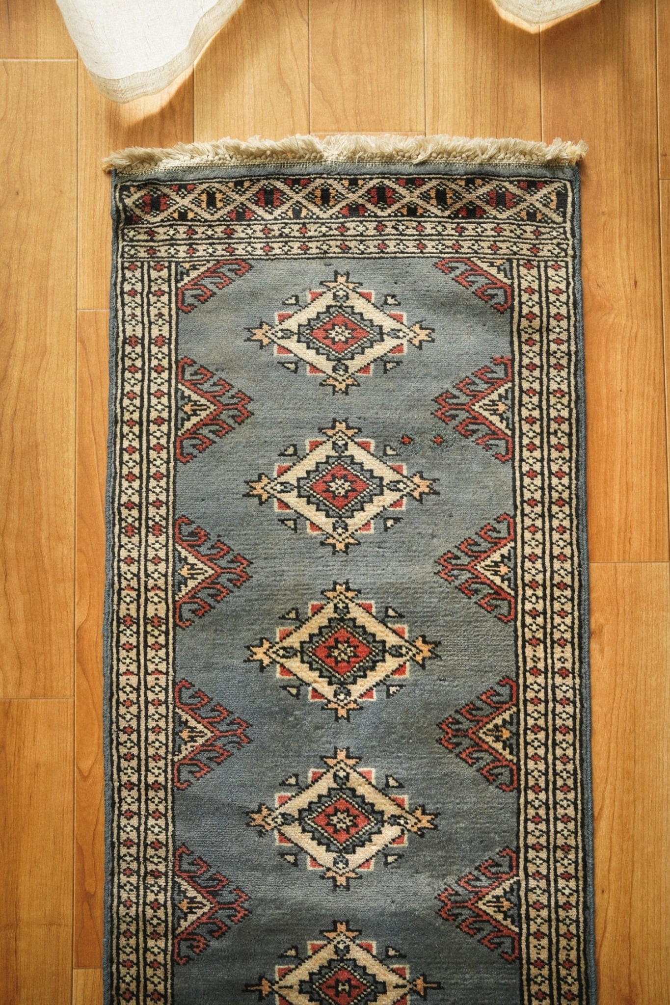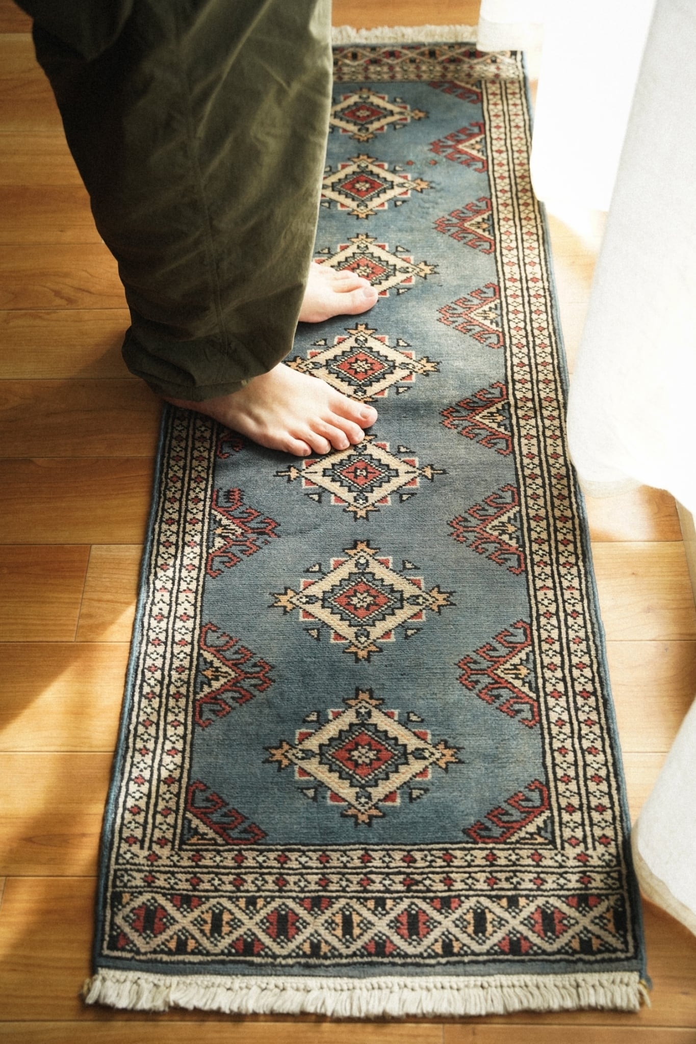 艶が美しいシャーベットブルーのパキスタン産のランナーラグ。
