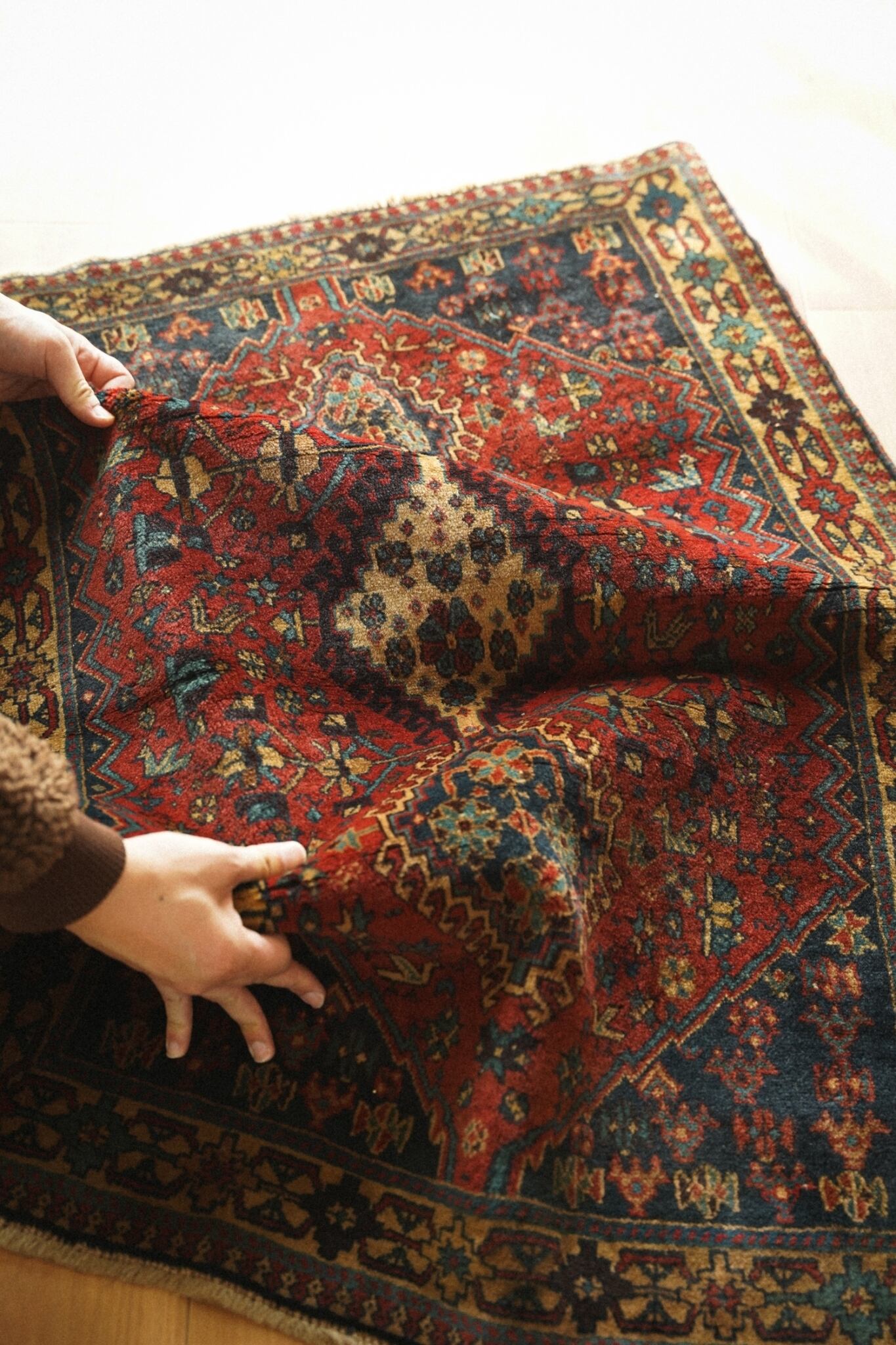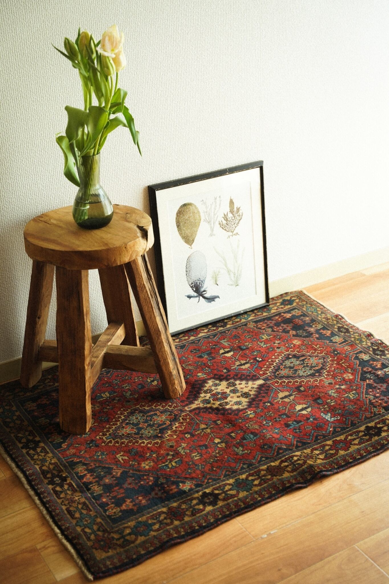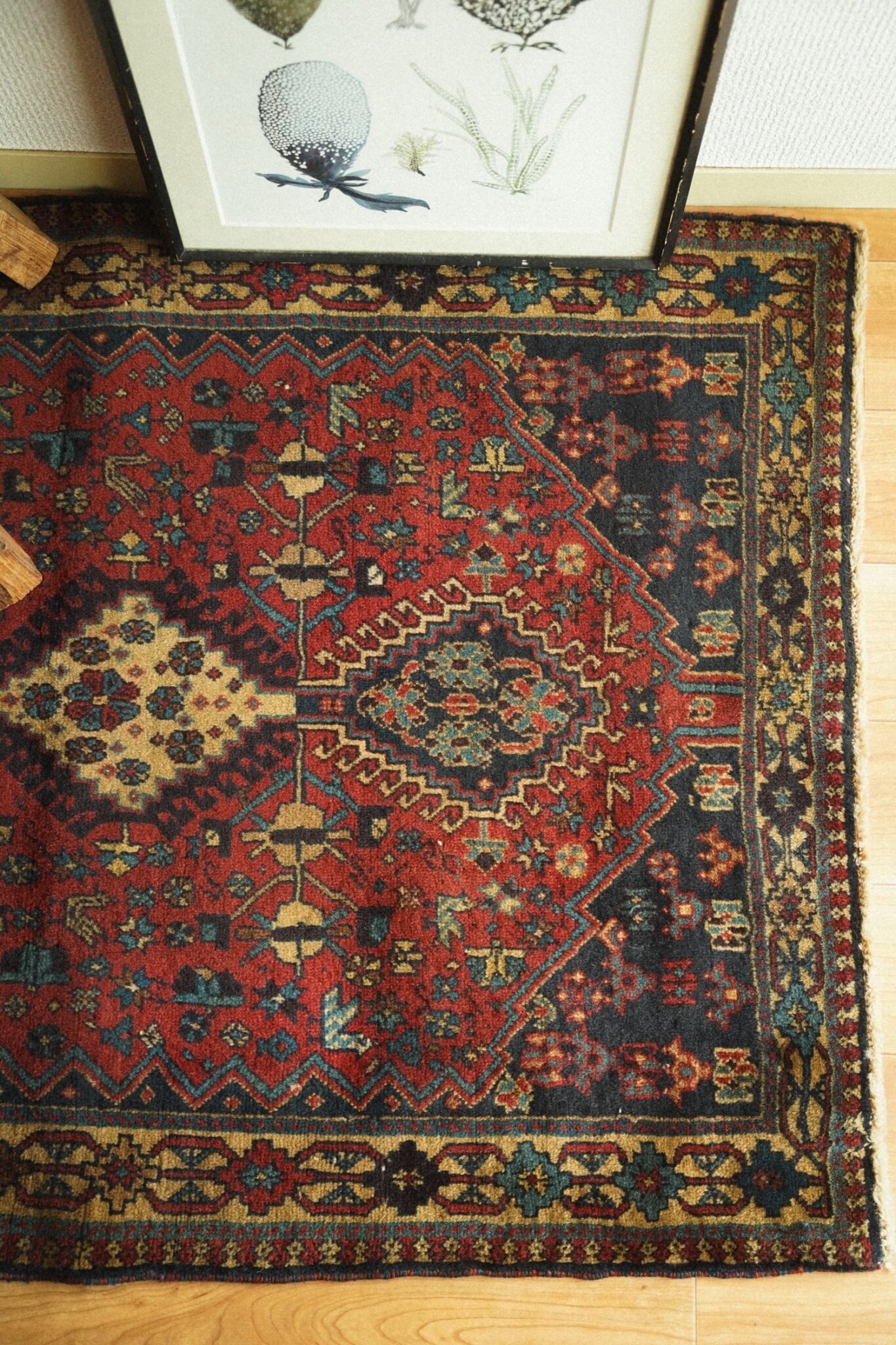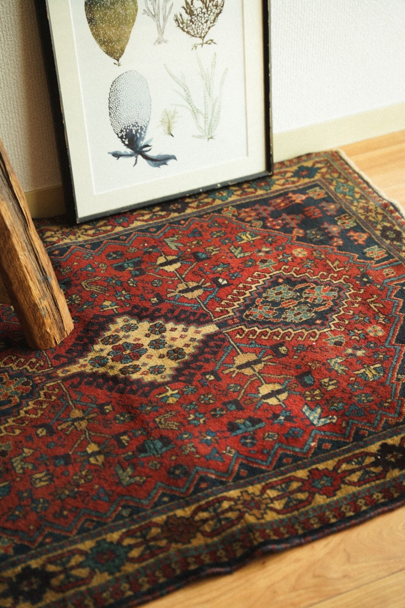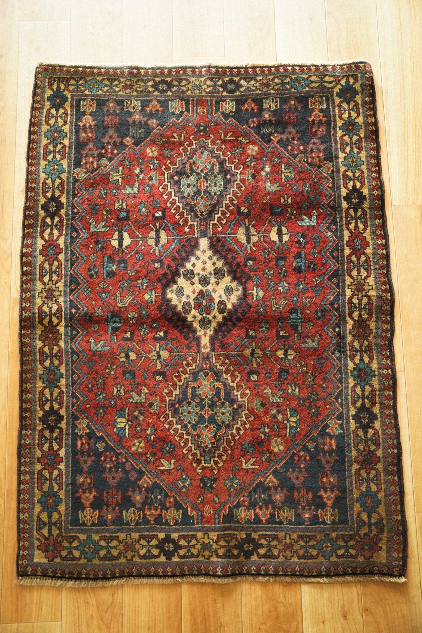 1980年代に織られたヤラメラグ。ネイビー×レッドをベースに可愛らしいお花や鳥、生命の樹など部族の伝統的なモチーフが織り込まれた華やかなデザイン。